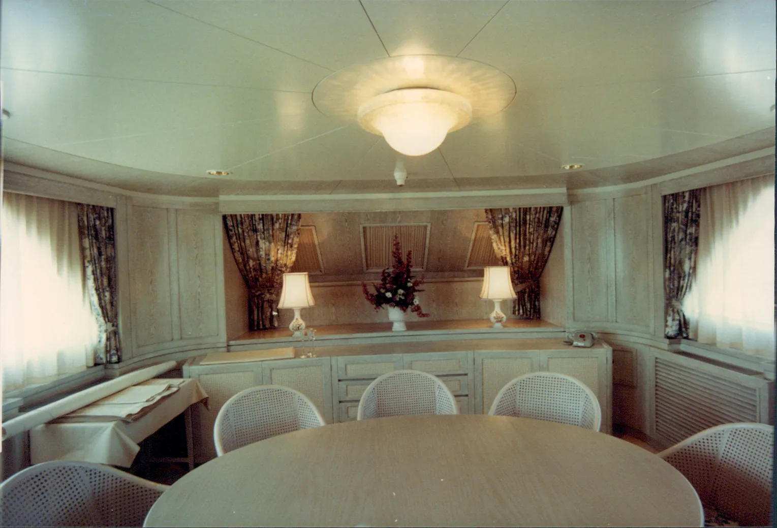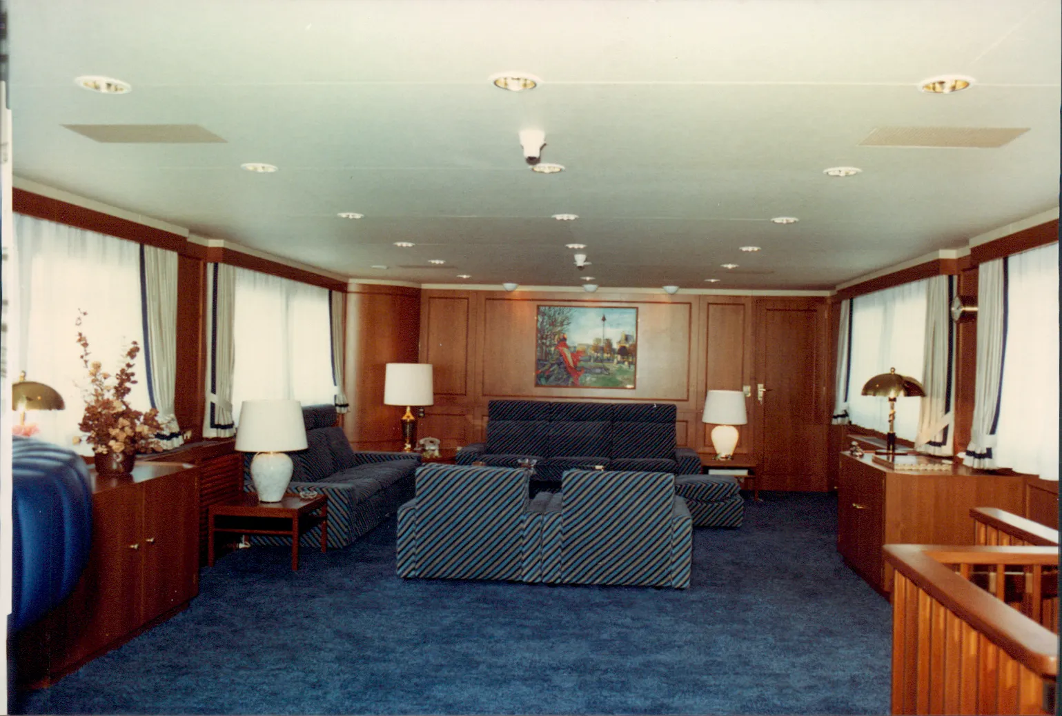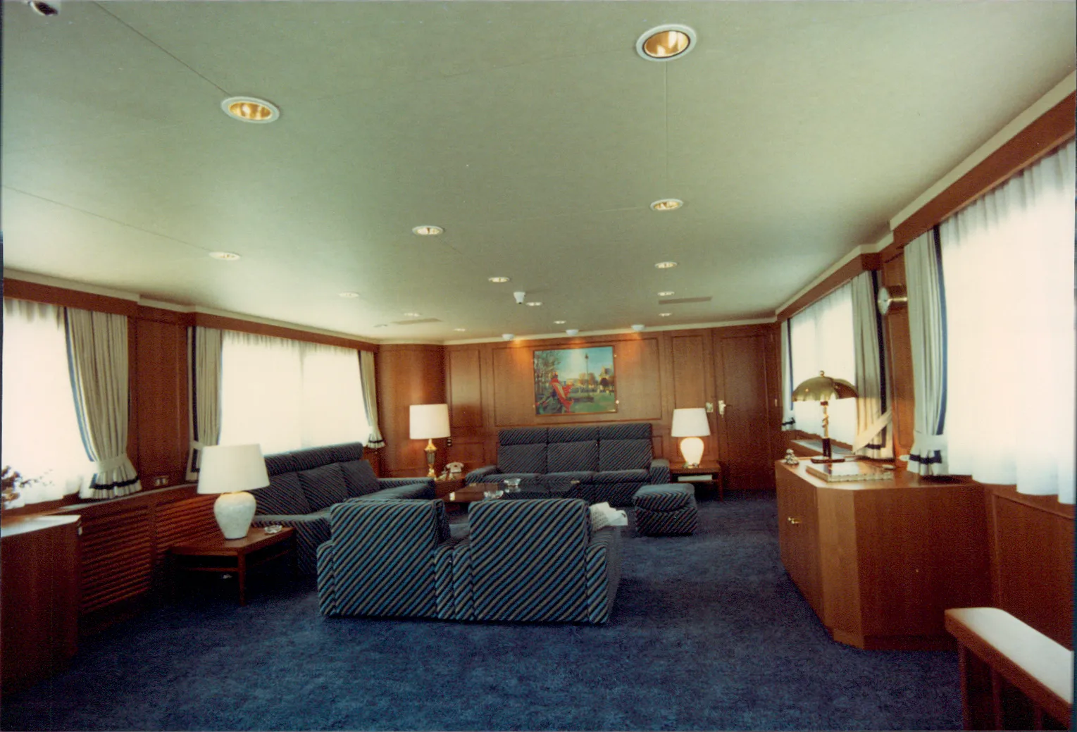 Launched during a Dutch winter so cold workers skated to the yard at Kaag, Arkan showed clear evolution of styling from predecessors such as Enterprise III and Karina C. Long gone was the fantail stern, although the aft main deck remained well covered and could be enclosed in bad weather. The 37.95-metre Arkan changed hands in 1998 and was renamed Matanthar. When that owner upgraded to the 45.70-metre Carmac VII, this yacht was sold and renamed Monaco. As Monaco, this petit Feadship with a maindeck owner’s stateroom was a very active charter yacht.