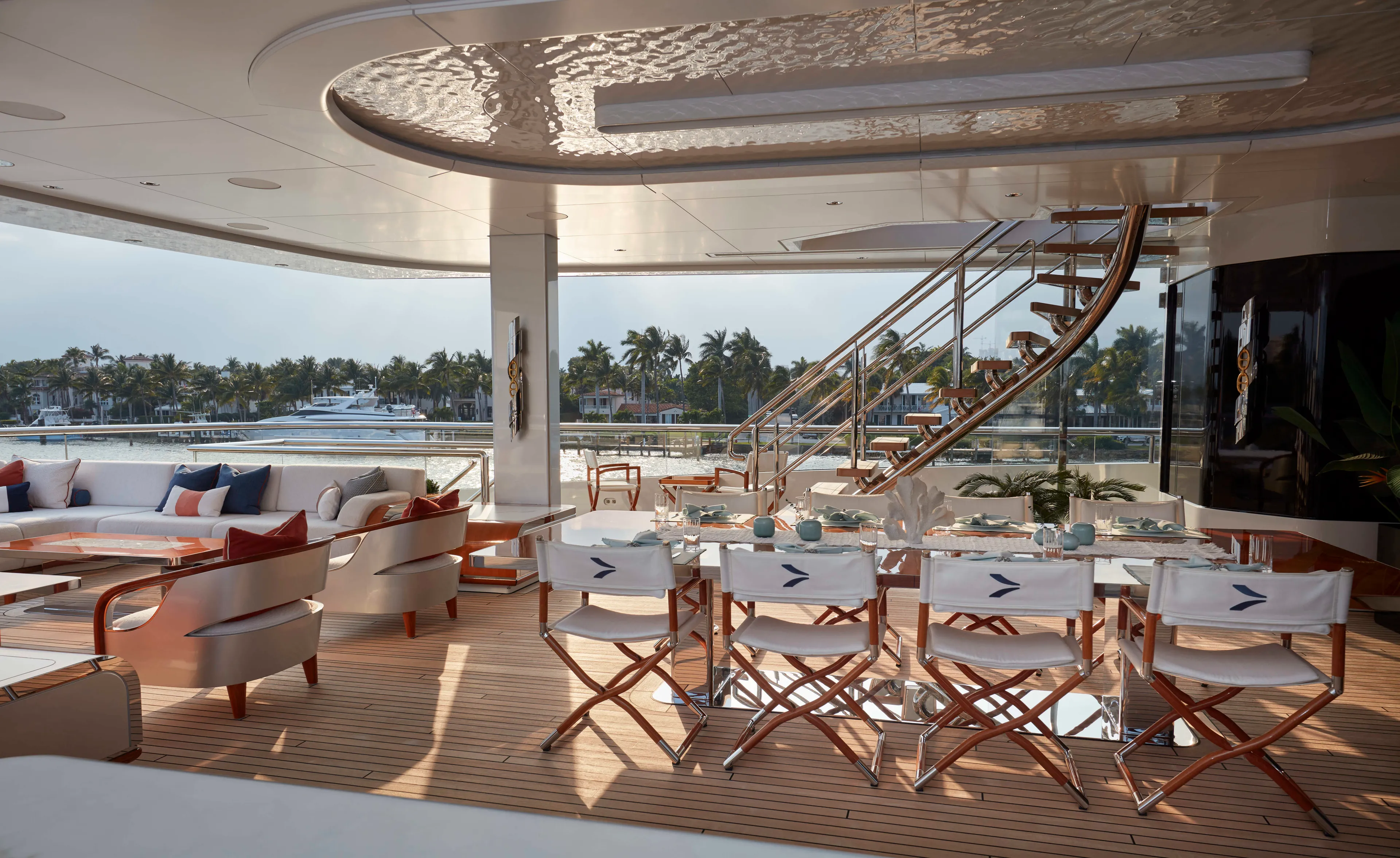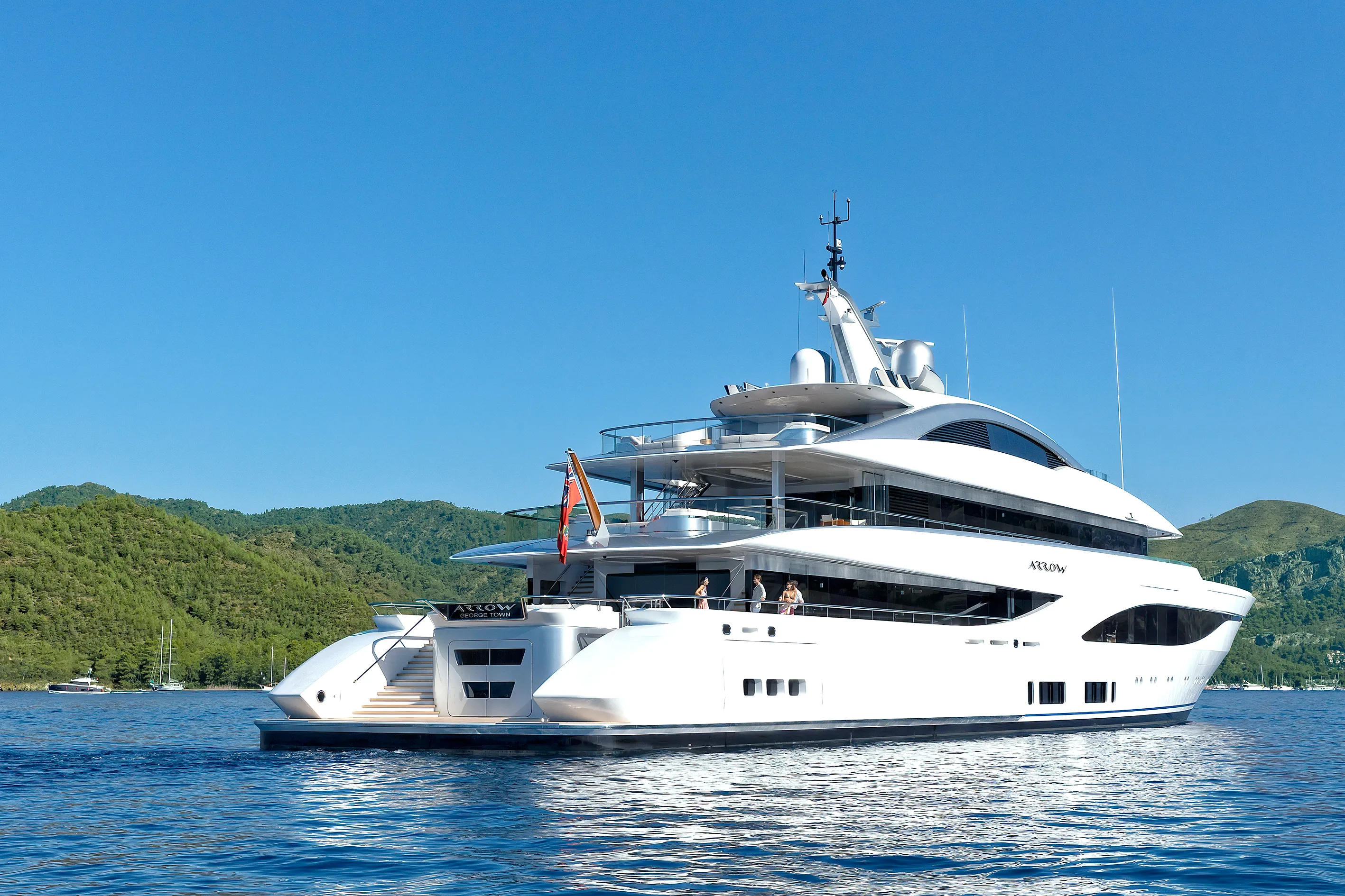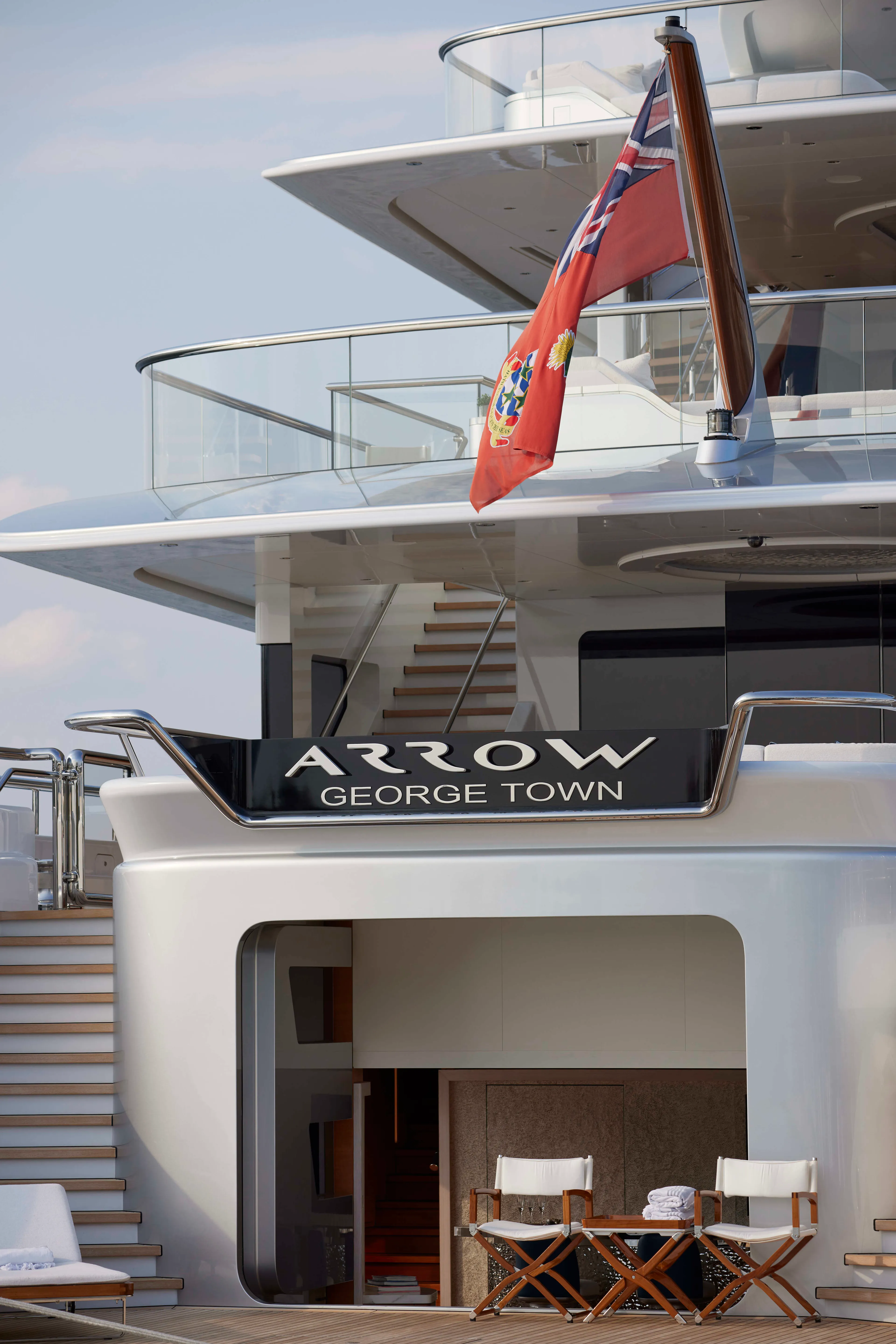 Arrow is a striking 75.00-metre Feadship with a complex exterior featuring elegant sculpted elements and shapes. The intricate outdoor spaces include elaborately detailed premium furniture normally associated with an interior with backlit marble and varnished teak. The low glass railing accentuates the sleek lines of the yacht as a whole. High deck heights and expansive gangways make for an outstandingly spacious feel as you walk between areas such as the sun deck with its bespoke mosaic-lined jacuzzi and the sensational beach club aft with a truly unique bar area.