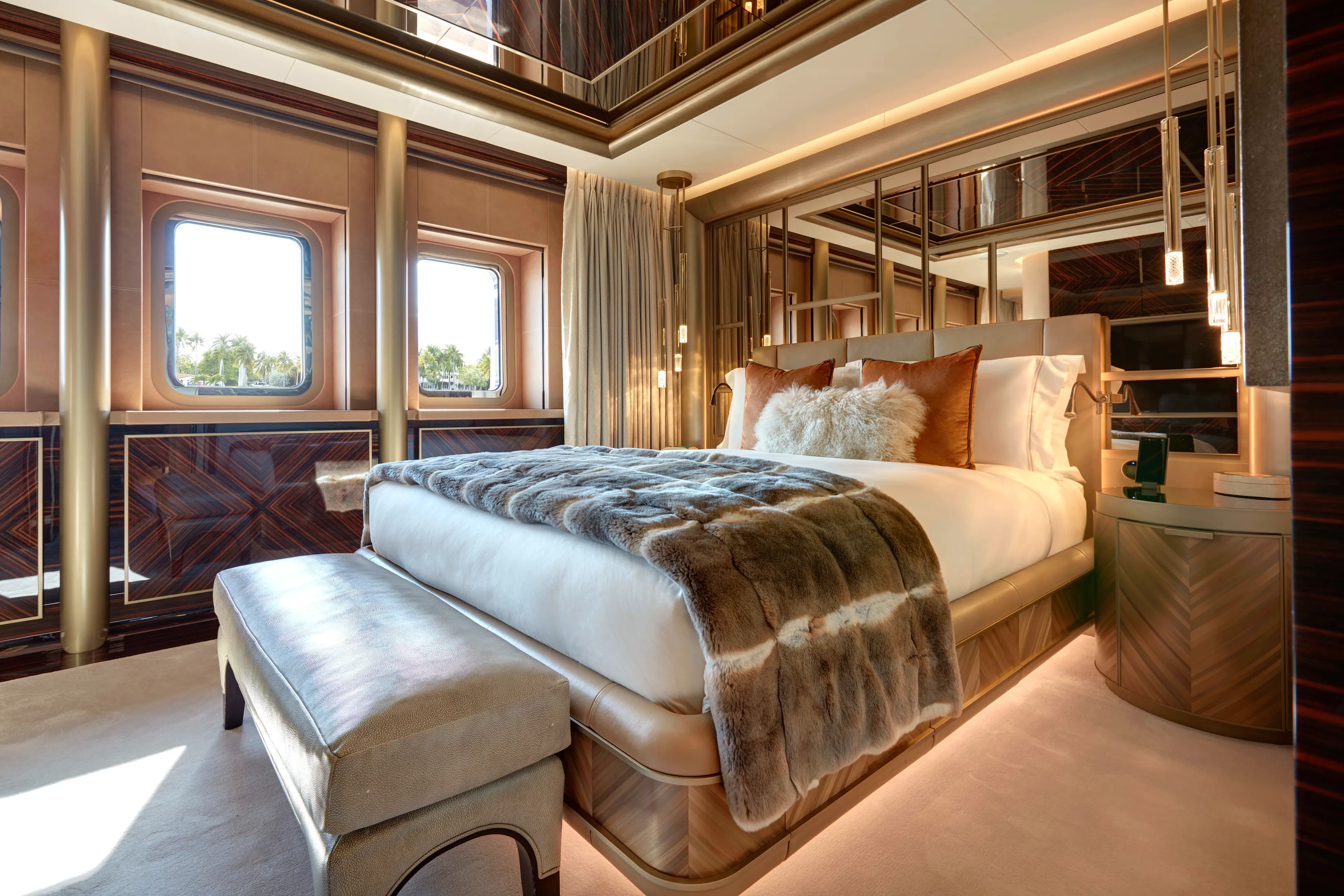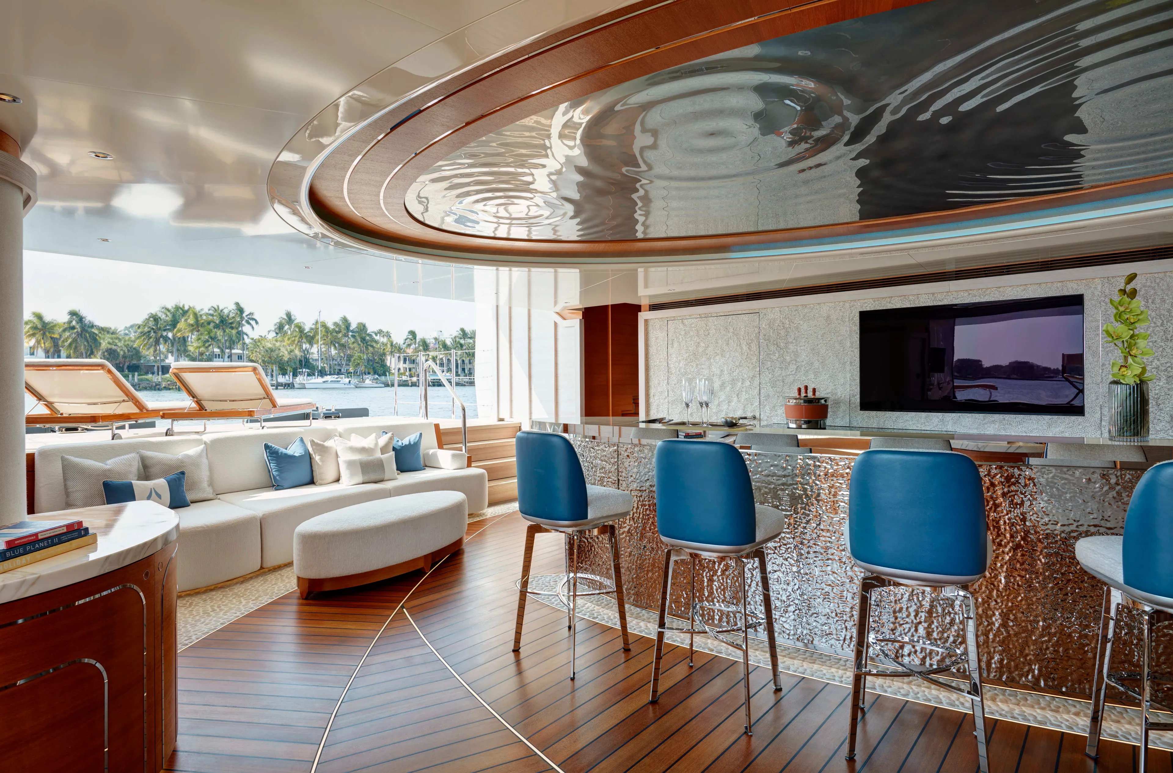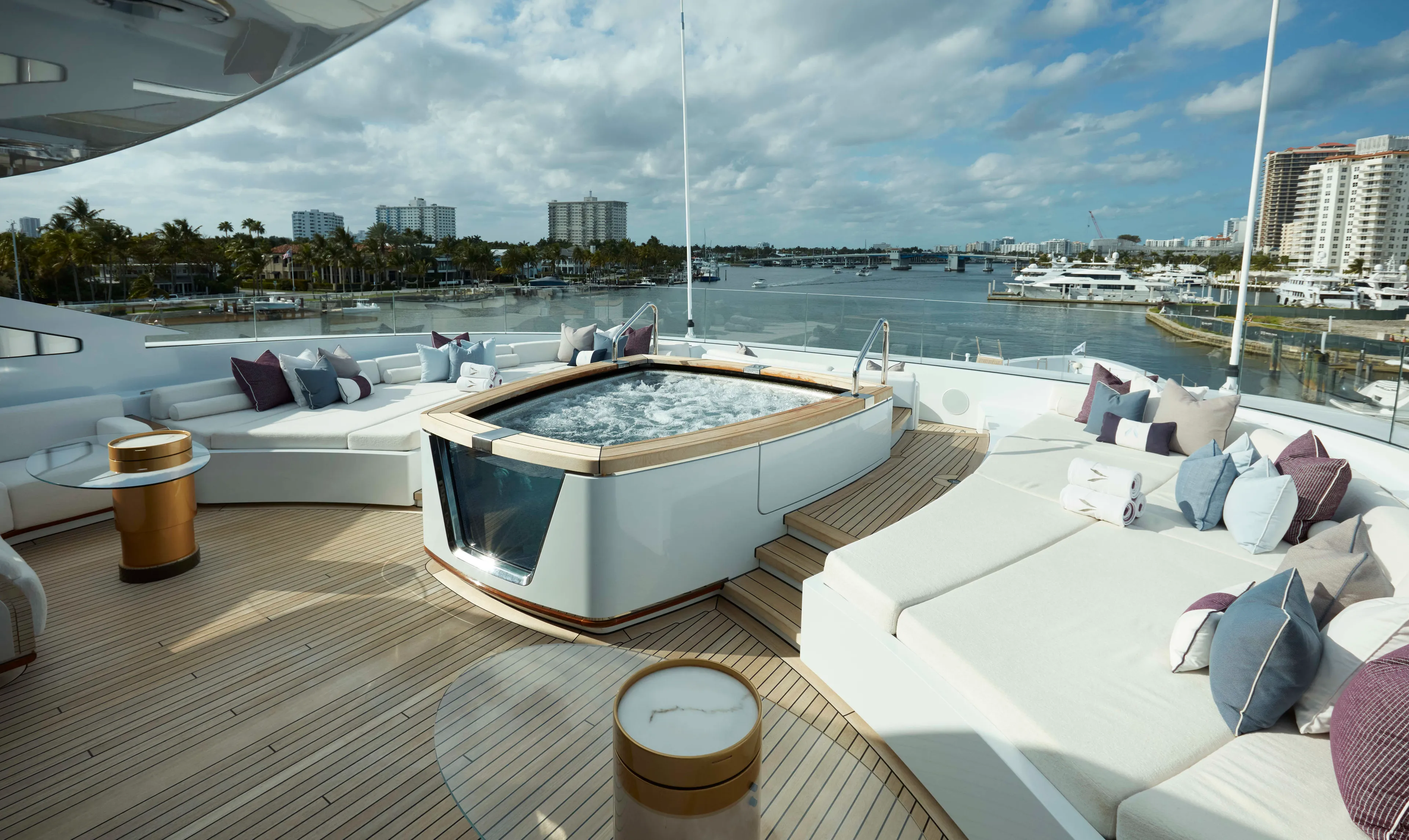 Arrow is a striking 75.00-metre Feadship with a complex exterior featuring elegant sculpted elements and shapes. The intricate outdoor spaces include elaborately detailed premium furniture normally associated with an interior with backlit marble and varnished teak. The low glass railing accentuates the sleek lines of the yacht as a whole. High deck heights and expansive gangways make for an outstandingly spacious feel as you walk between areas such as the sun deck with its bespoke mosaic-lined jacuzzi and the sensational beach club aft with a truly unique bar area.