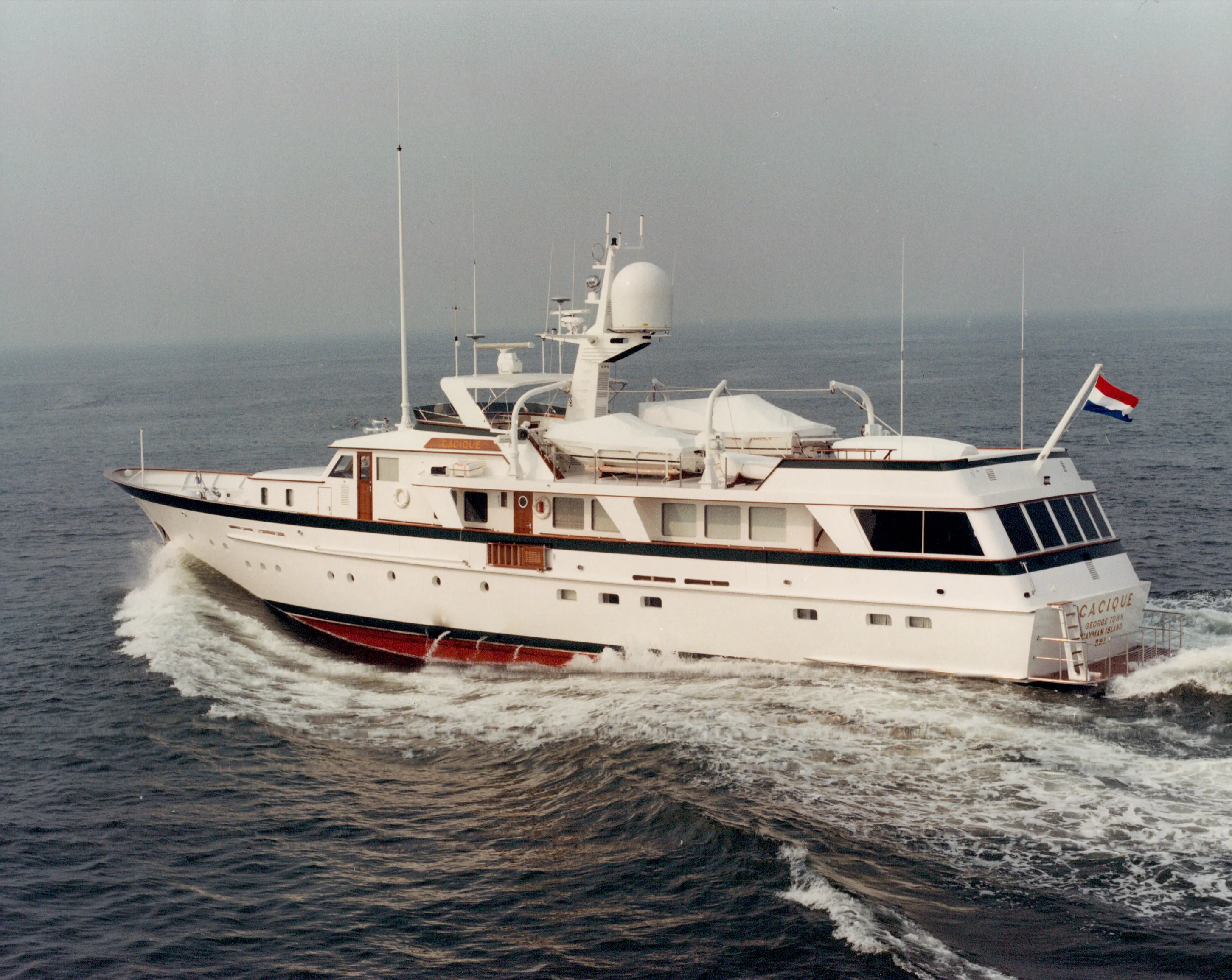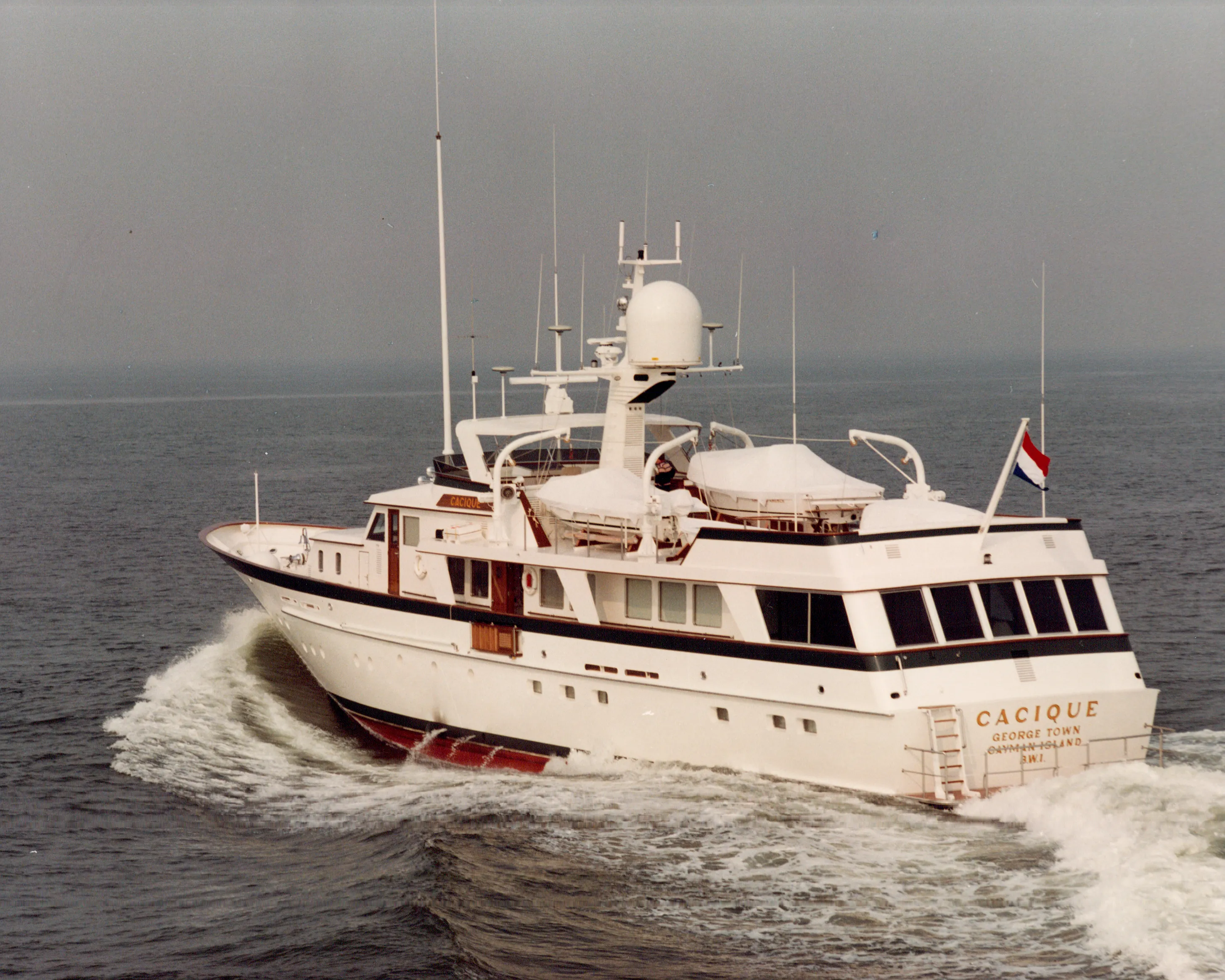 With a name that meant ‘chief’ in the Taino language of the indigenous tribes of the eastern Caribbean, Cacique’s raised pilothouse design had more in common with earlier yachts like Blackhawk and Prosit II from the 1970s than she did with her early 1980s sisters. Although the interior was designed by De Voogt, the 37.49-metre yacht was manufactured by Struik and Hammerslag. This signalled how complex the interiors were becoming during this period. She paved the way for a new Cacique, a much larger 55.10-metre launched in 1986.