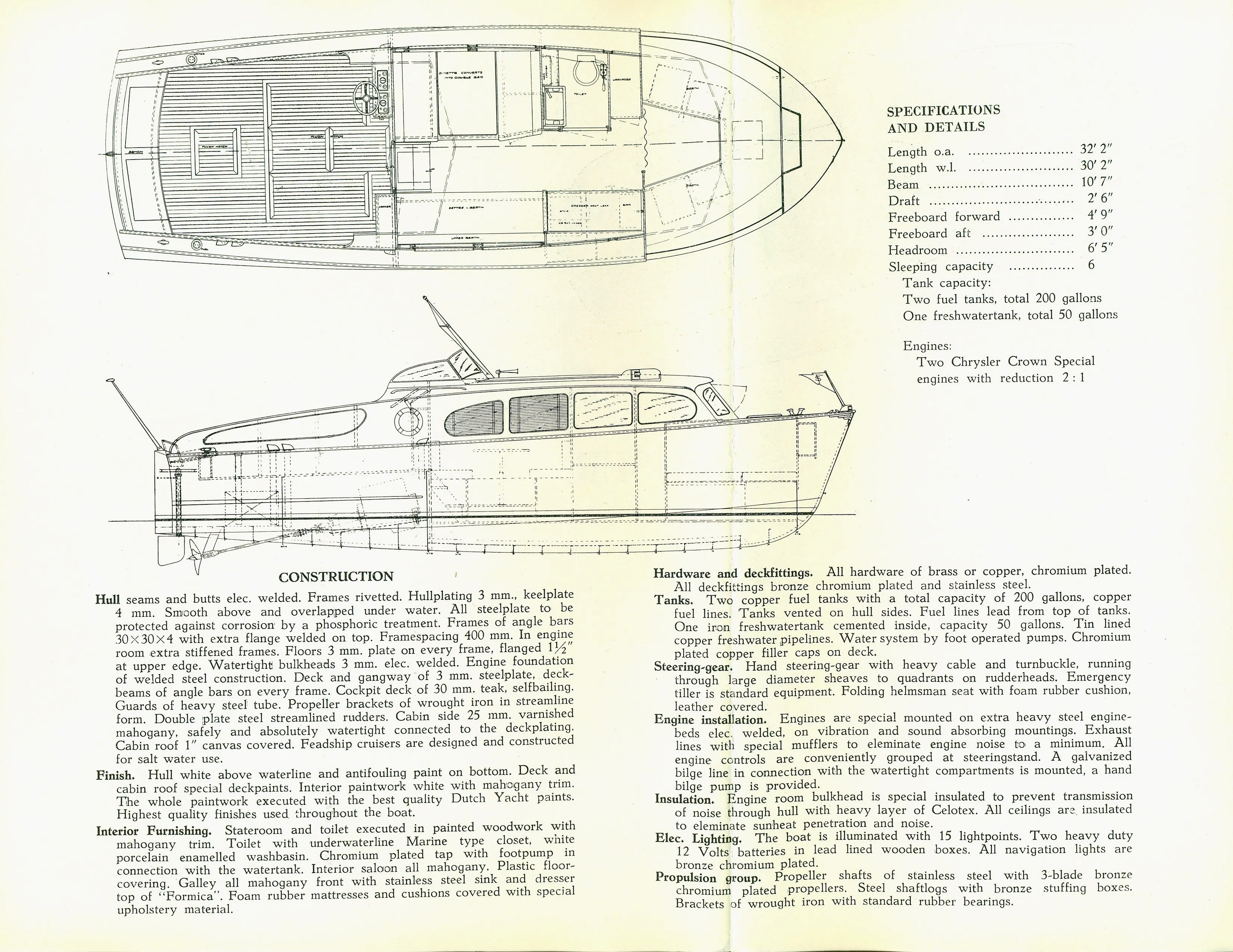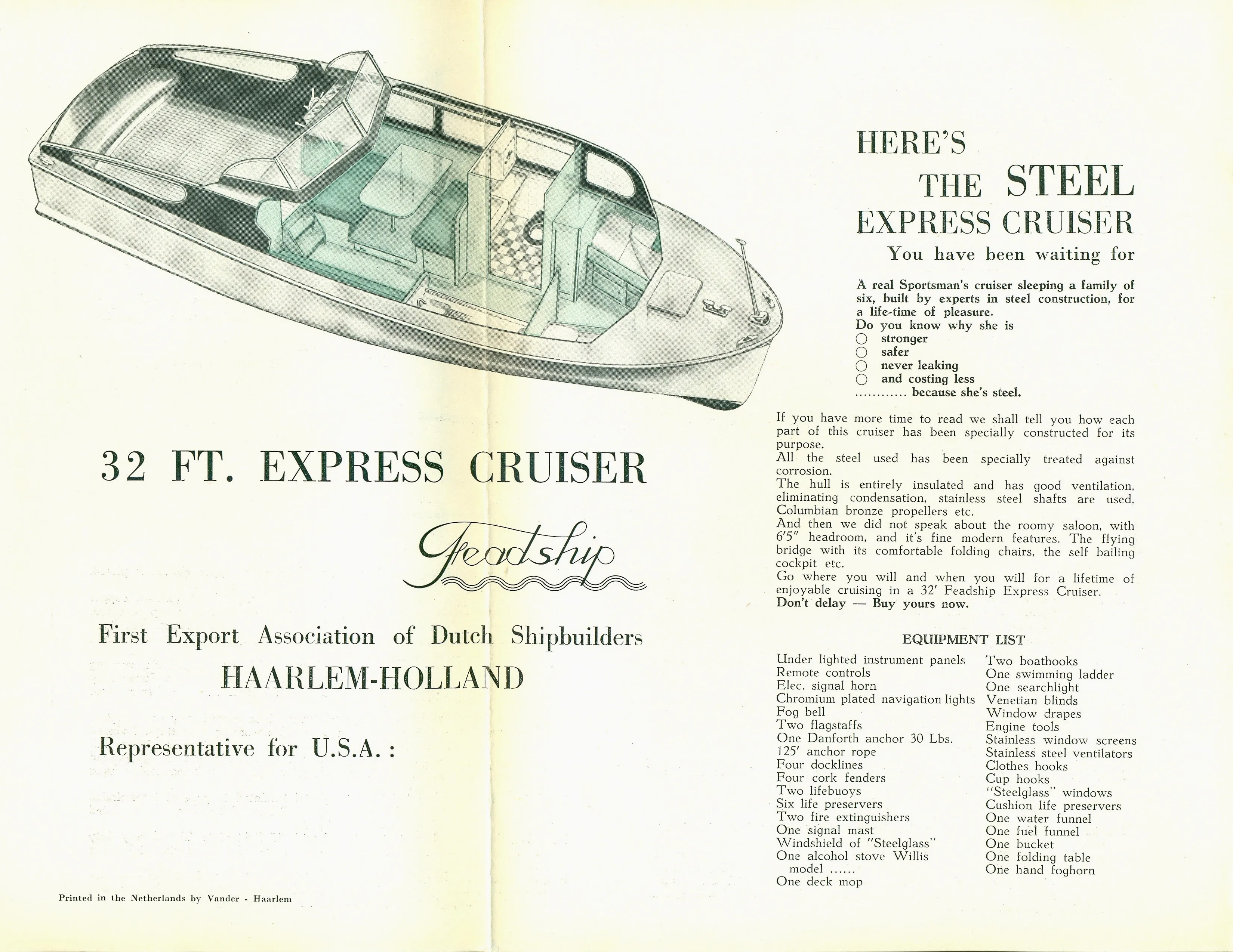 The 9.75-metre Express Cruiser built by former Feadship member Witsen & Vis was one of three vessels transported to American in 1951 for Feadship’s inaugural exhibition at the Motor Boat Show in New York (the other two yachts were Baby Holland, a cruiser, and Pampus, an open day sailer. Upon return Mr Vis and Mr De Voogt reported, “Both the press and trade were in accord that, as far as finishing was concerned, our boats were of a far higher standard than anything else on display. Our presentation was judged to be highly impressive overall and Feadship gained a good name immediately.”