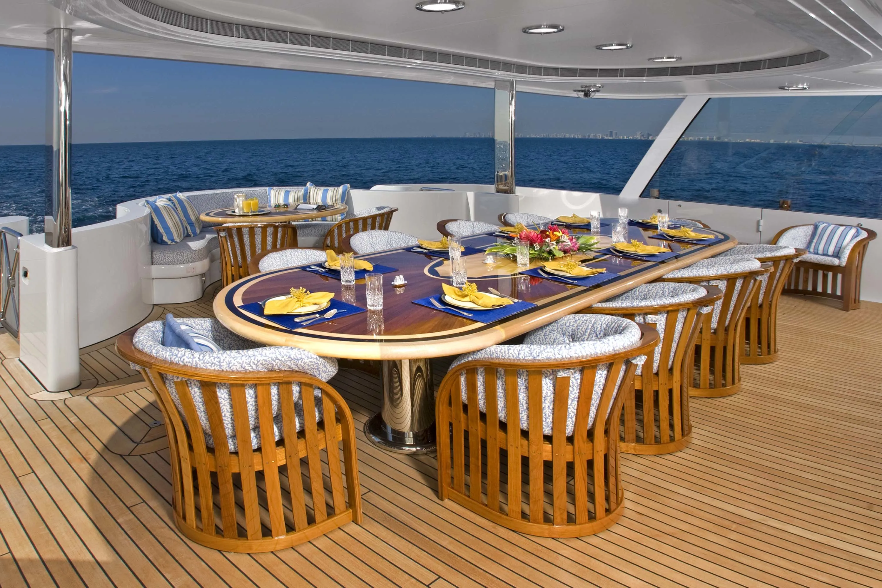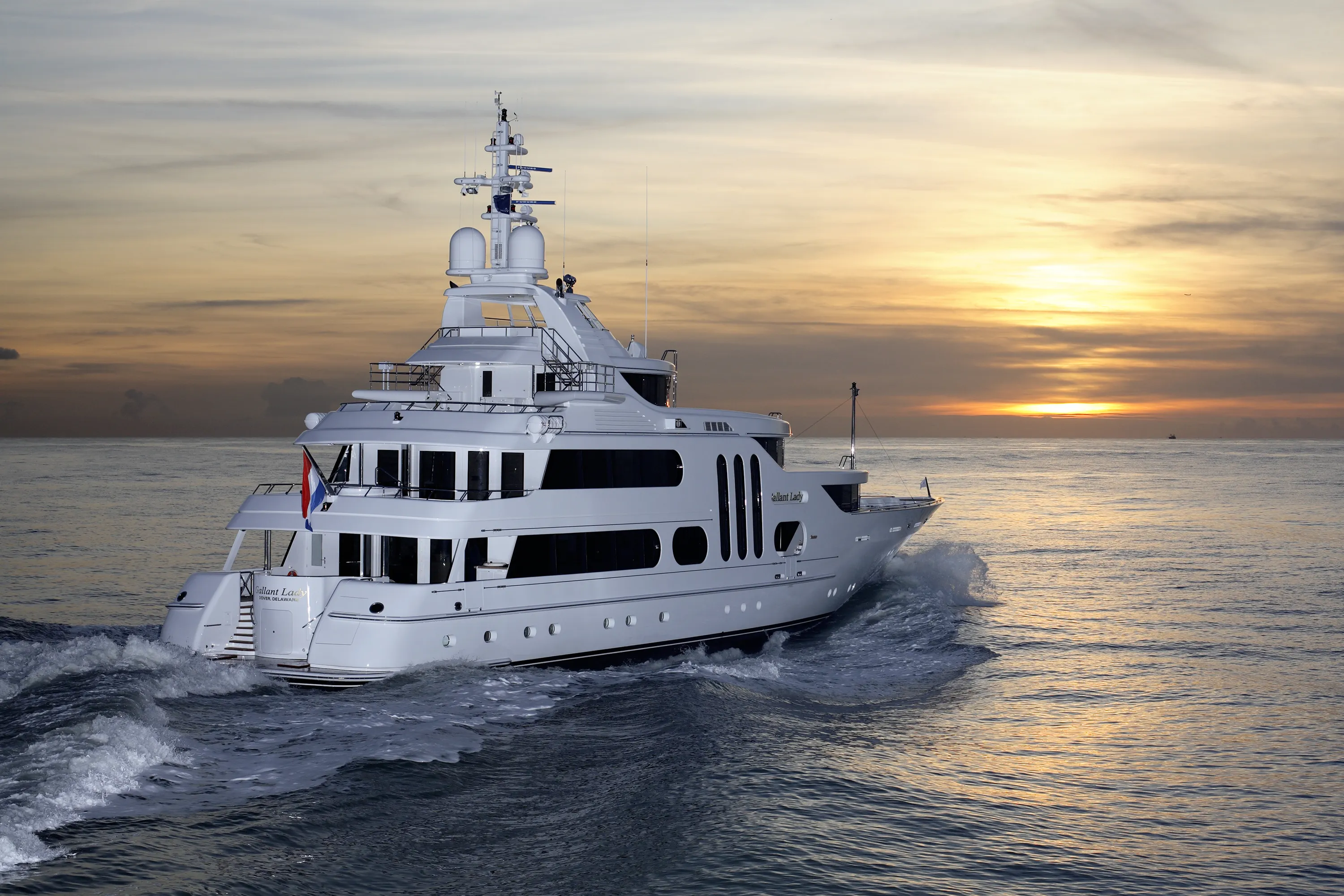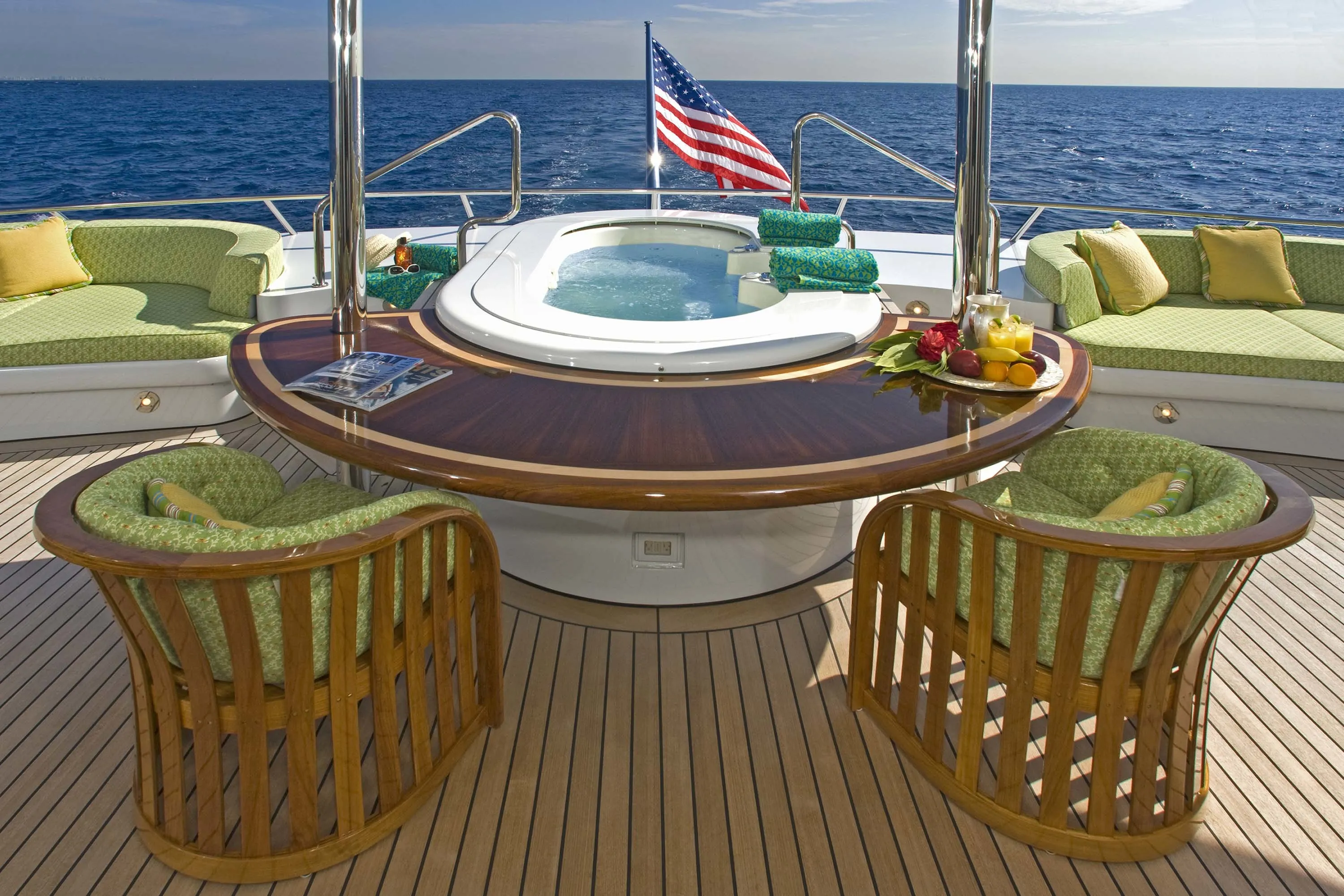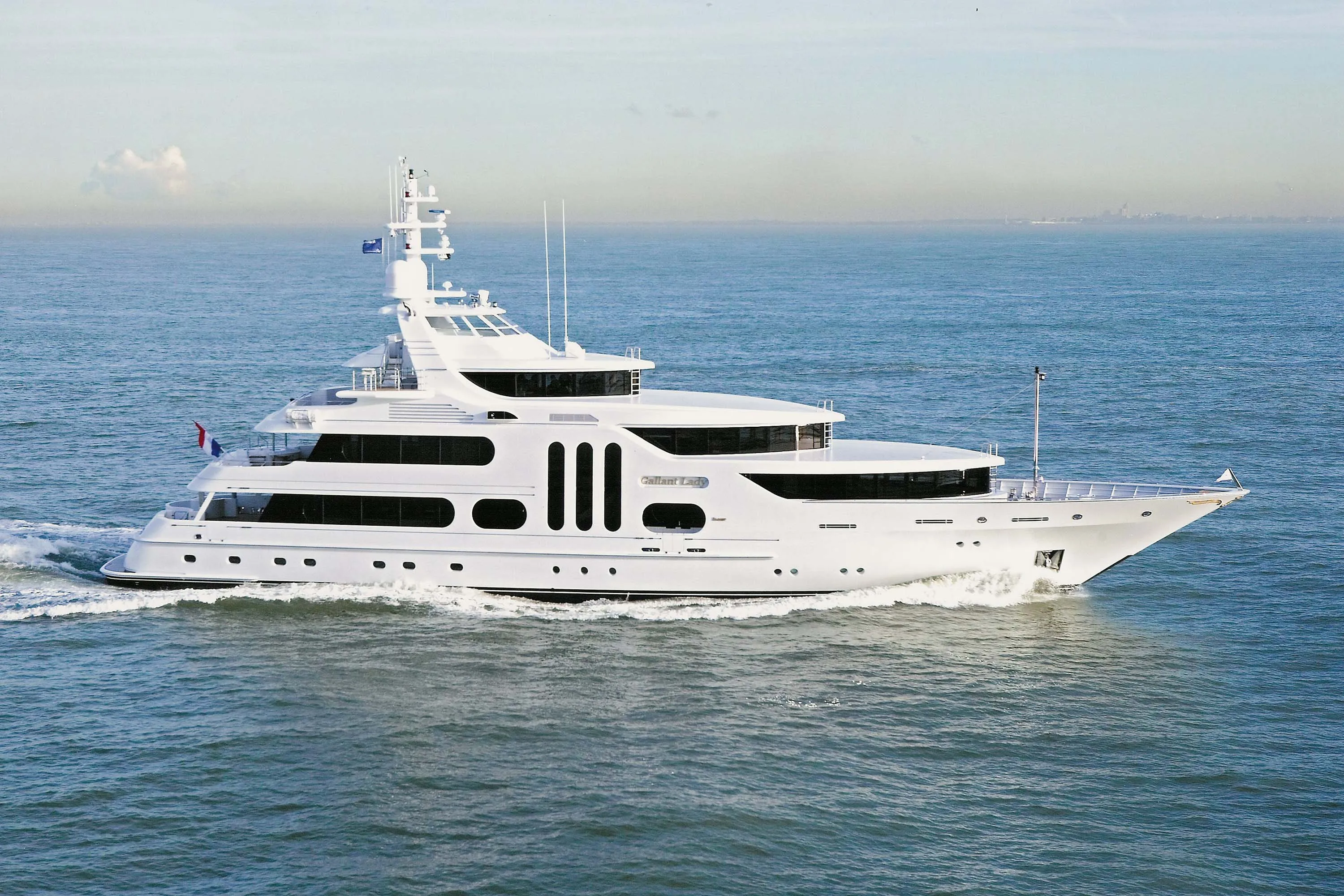 The eighth and final Gallant Lady was designed to be shallow enough to cruise the inland waterways and park at a designated dock behind the owners’ Florida home. She was built in aluminium with lightweight and high-tech composites for the upper decks. A key styling feature was the pointed oval design of the forward section of the three superstructure decks, giving the yacht a ‘sleeker’ look. The yacht features a dramatic central stairway in the centre of the vessel, making the most of the three vertical windows, and a glass elevator outboard, the first and only elevator on a Gallant Lady.
