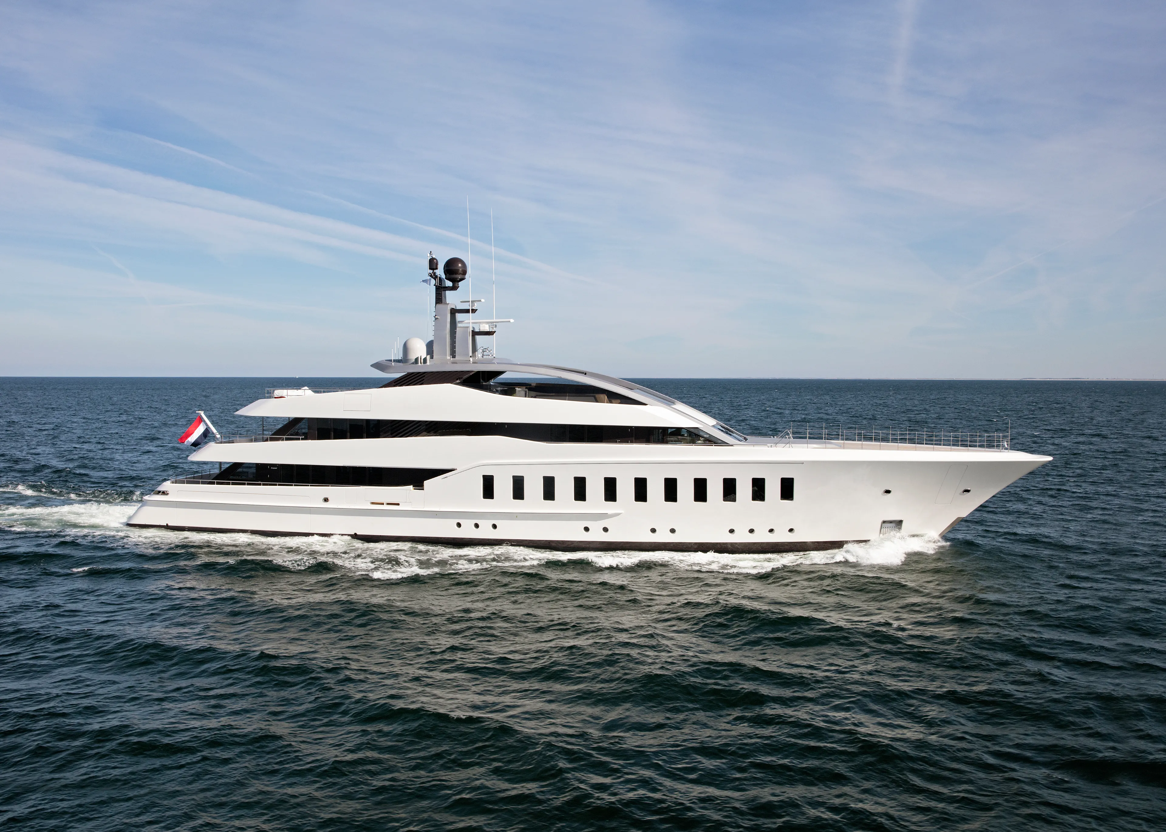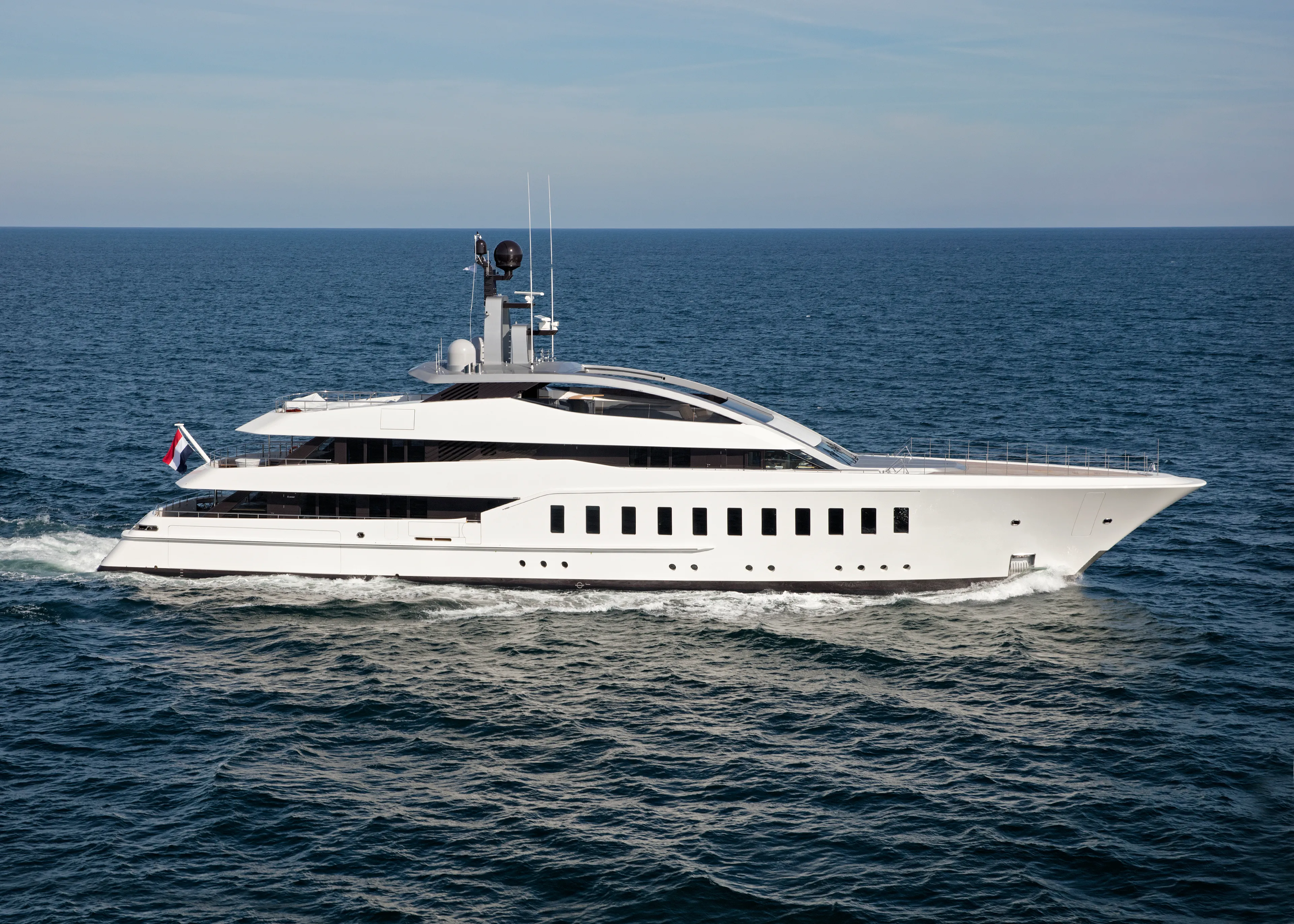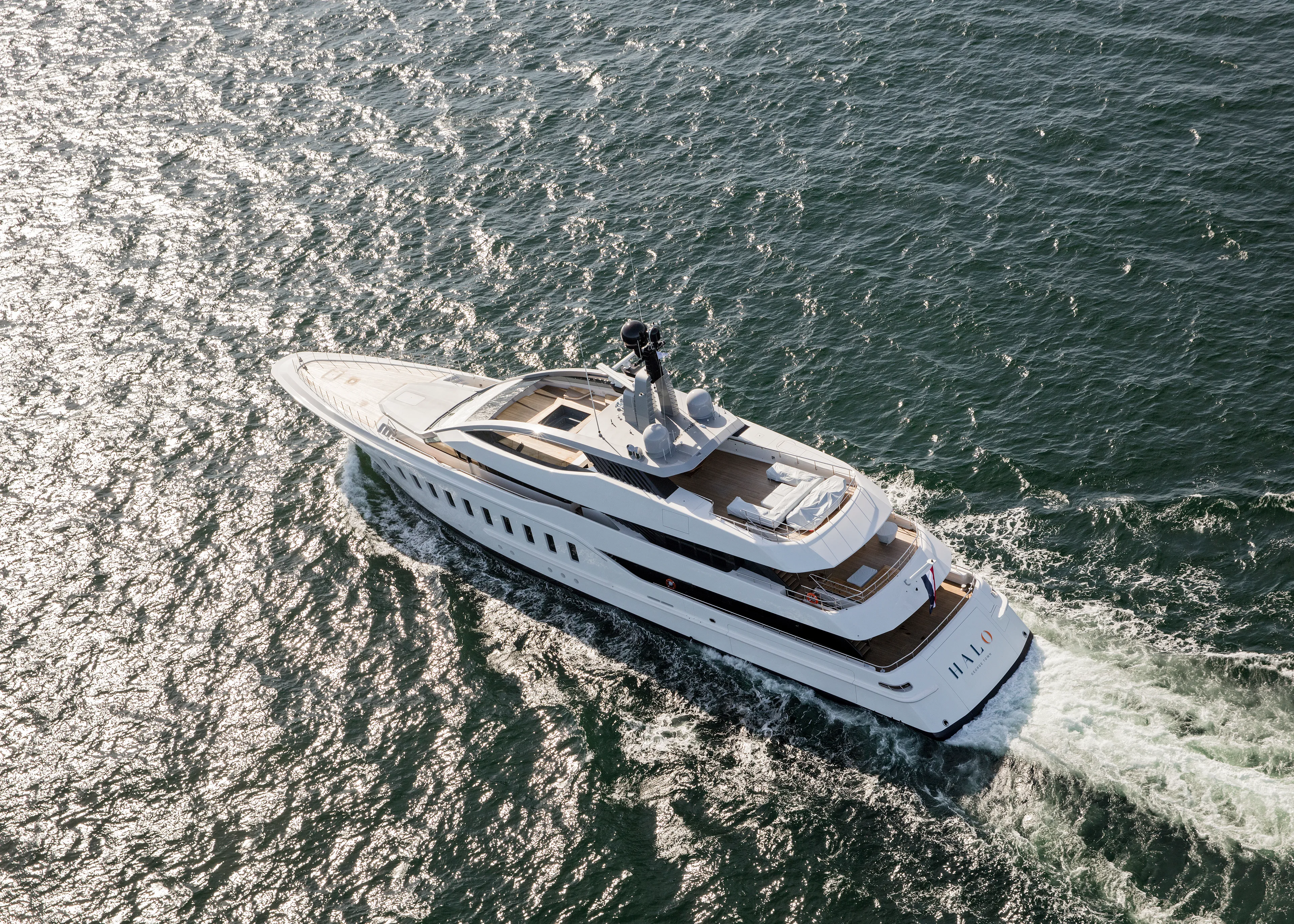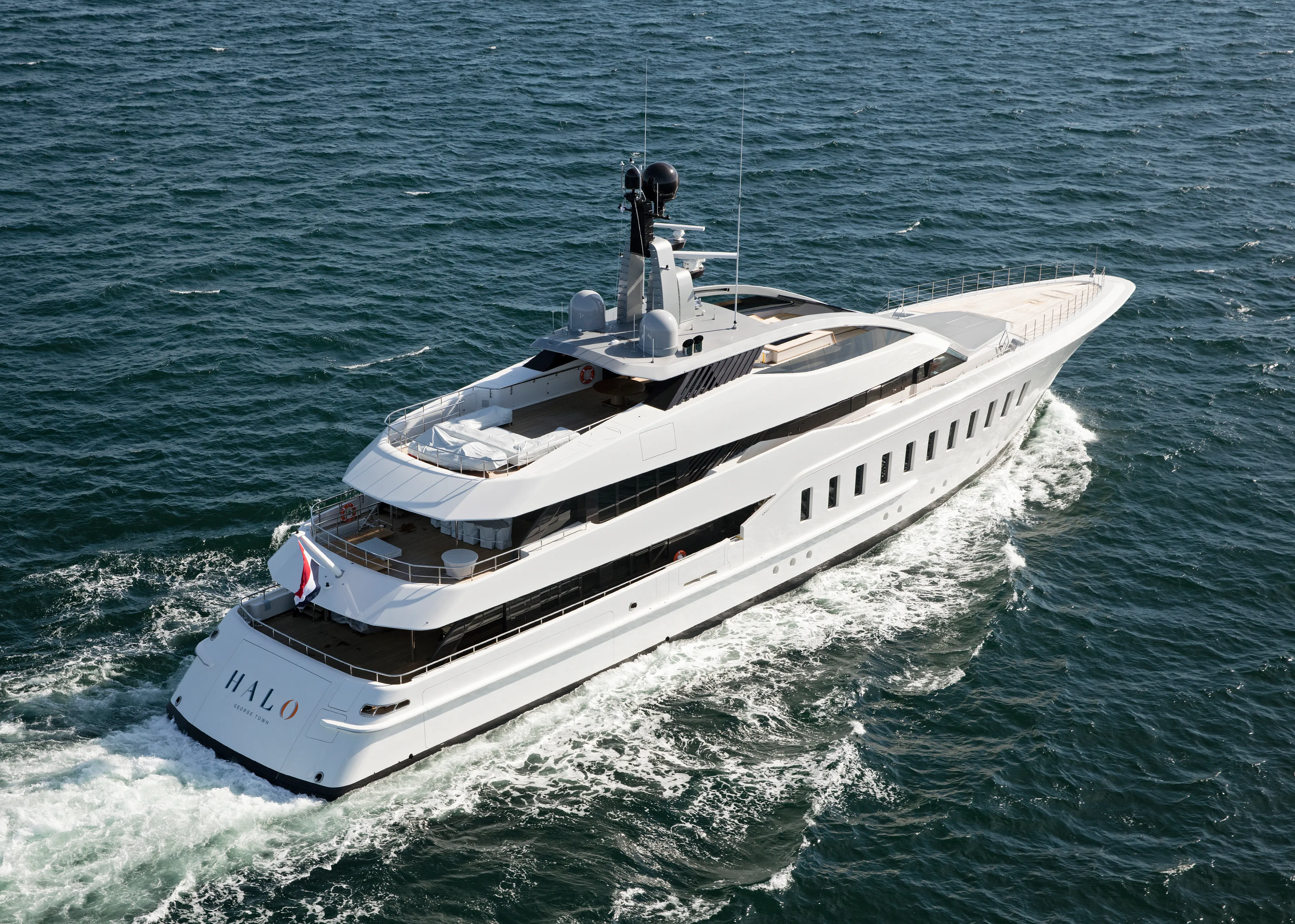 Halo’s radical exterior styling by Harrison Eidsgaard was created in close cooperation with the owner. Dark window bands in a warm grey Awlgrip Mocca unite the side deck windows, and the dark grey coloured custom Jacuzzi stands out visually. Further forward, Halo has an enclosed mooring deck with hatches that open on both sides and a helicopter platform. Aft are two large garages either side of the centreline beach club that house two custom 8.00-metre tenders.