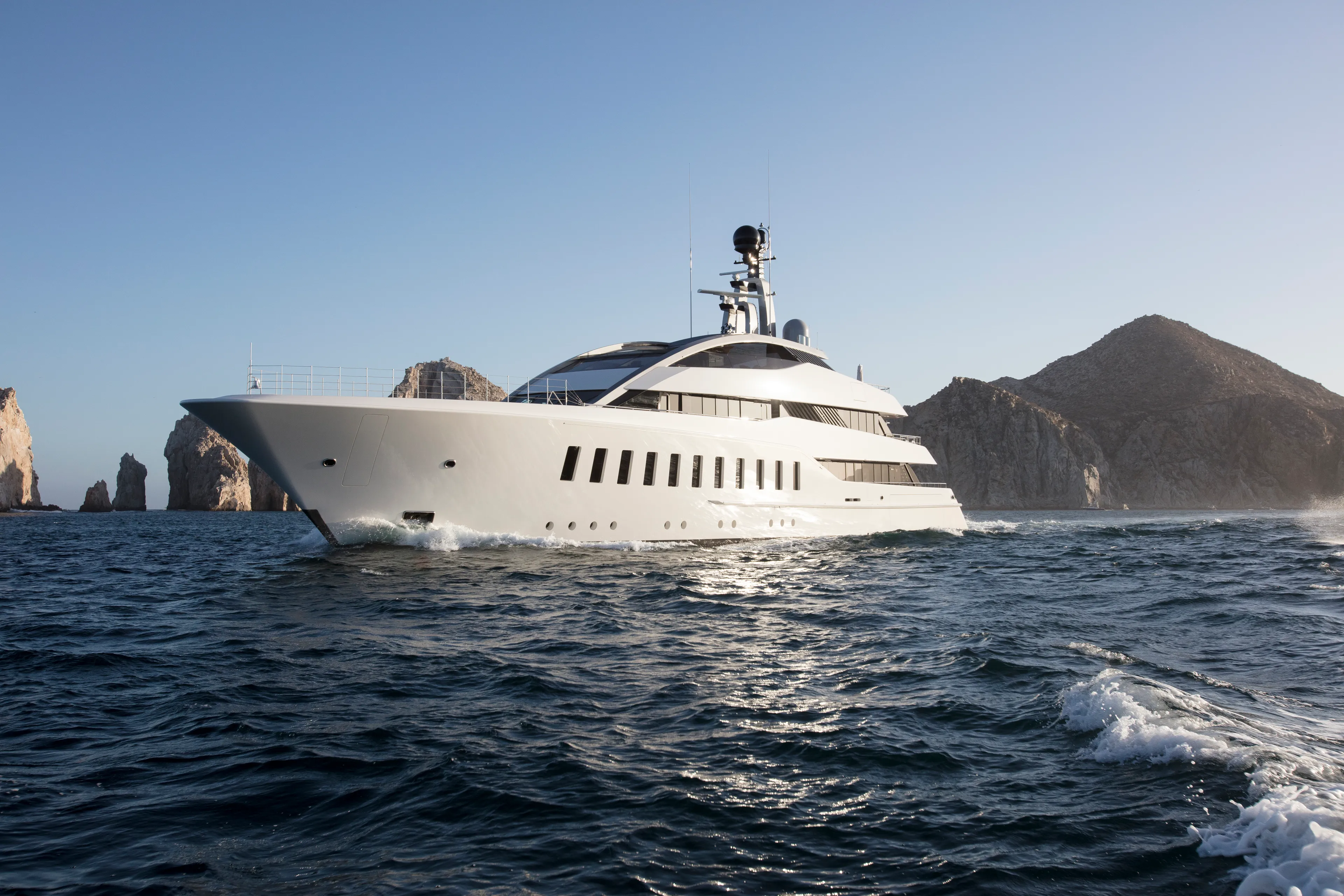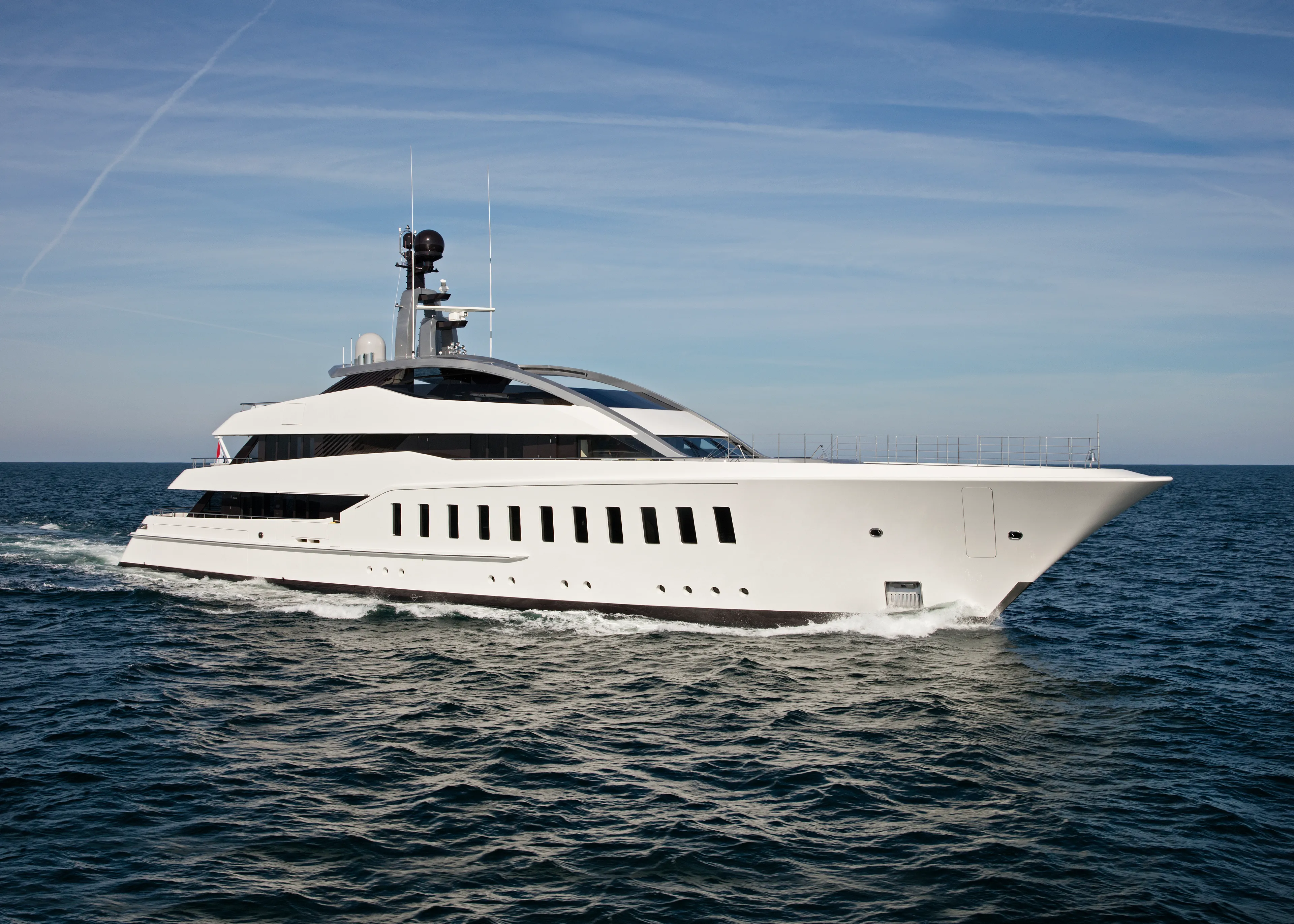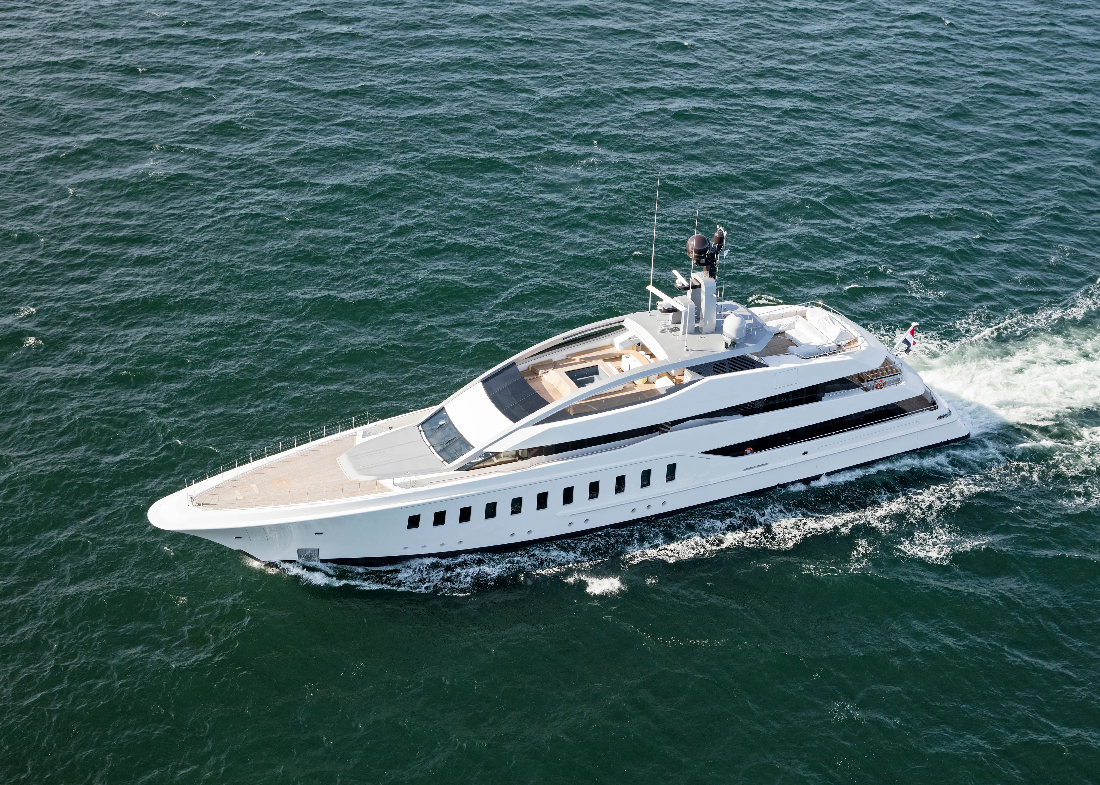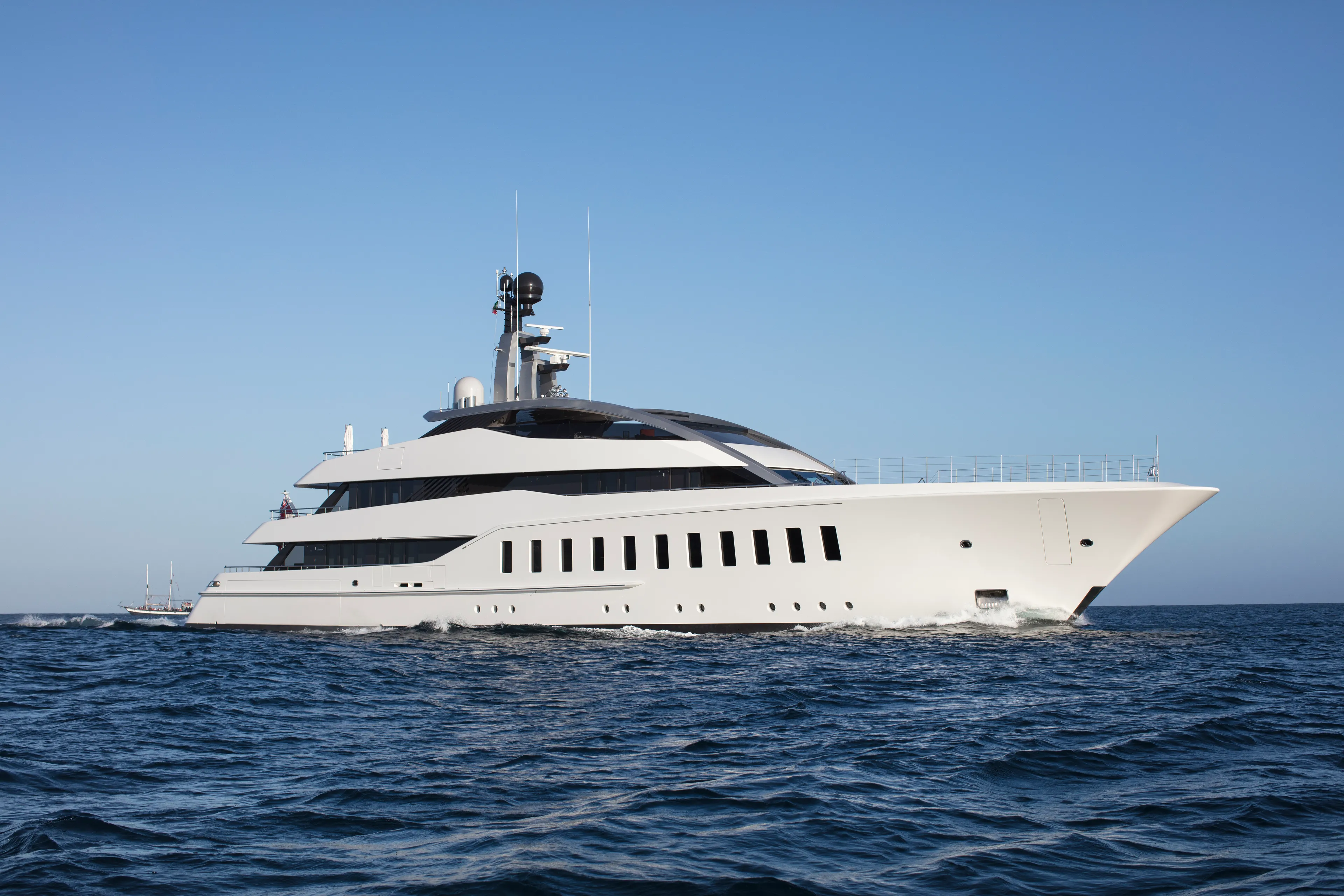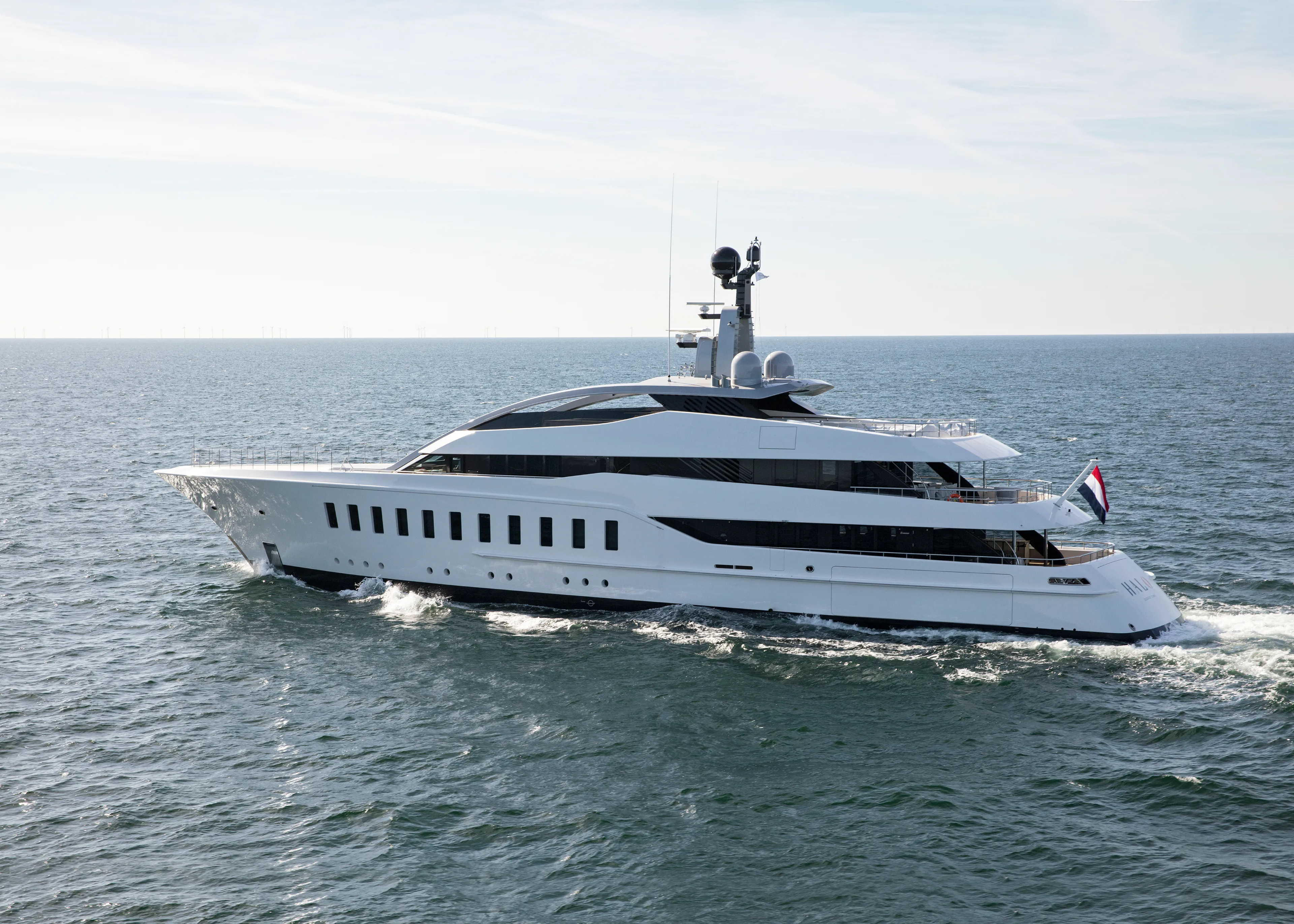 Halo’s radical exterior styling by Harrison Eidsgaard was created in close cooperation with the owner. Dark window bands in a warm grey Awlgrip Mocca unite the side deck windows, and the dark grey coloured custom Jacuzzi stands out visually. Further forward, Halo has an enclosed mooring deck with hatches that open on both sides and a helicopter platform. Aft are two large garages either side of the centreline beach club that house two custom 8.00-metre tenders.