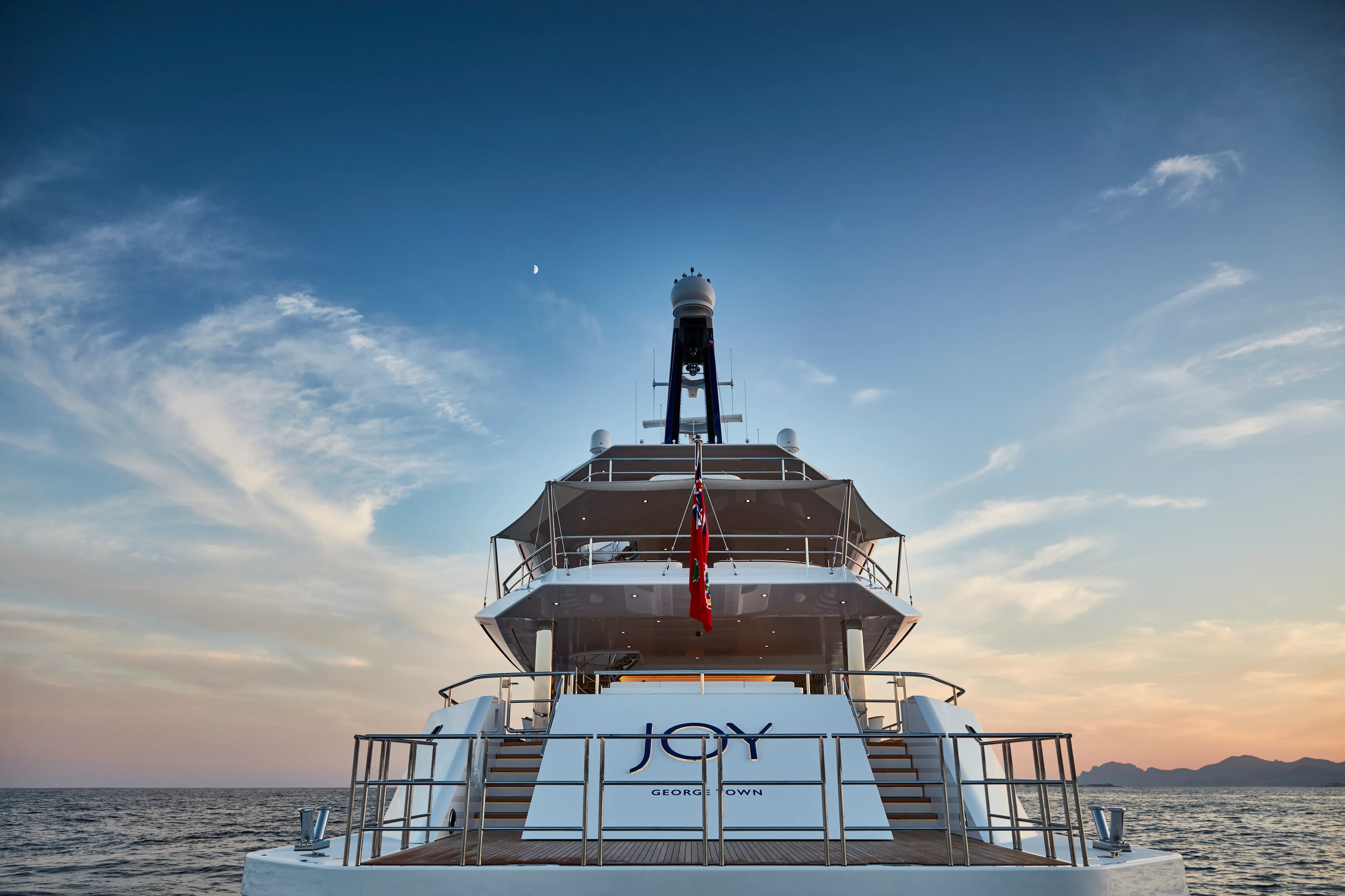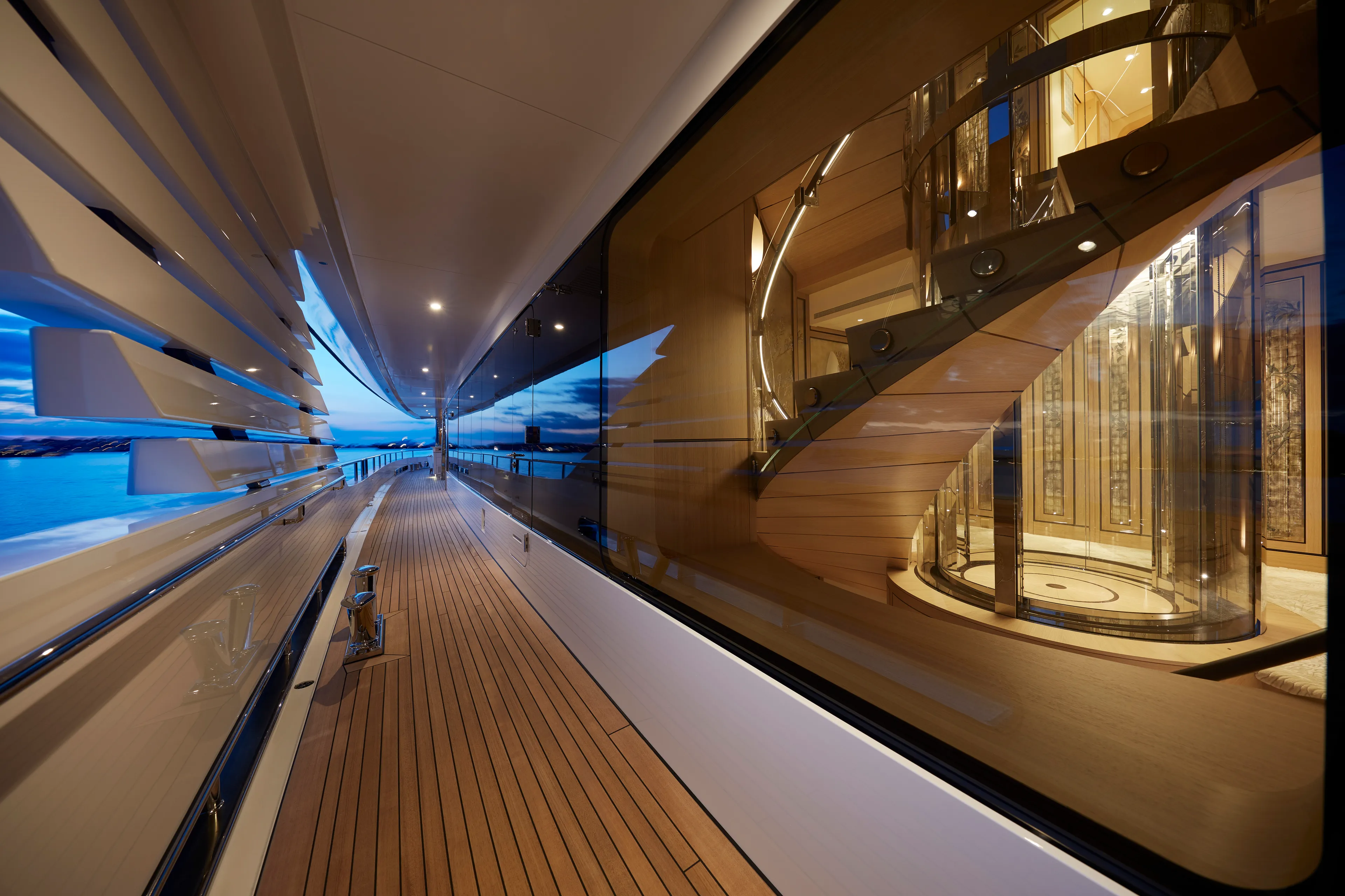 JOY was the first Feadship to have an exterior design by Bannenberg & Rowell since the legendary Jon Bannenberg passed away in 2002. The dynamic profile showcases the owner’s progressive insights into how yachts will look in the future, successfully blending a very narrow superstructure with super-wide sidewalks and four outside decks. This crisp and radical design incorporates some amazing surface geometry with countless concave contours in the superstructure and lots of surface texturing that defines the yacht’s shape. JOY was an incredibly intricate yacht to build and tested the Feadship fairing and painting teams to the absolute limit.