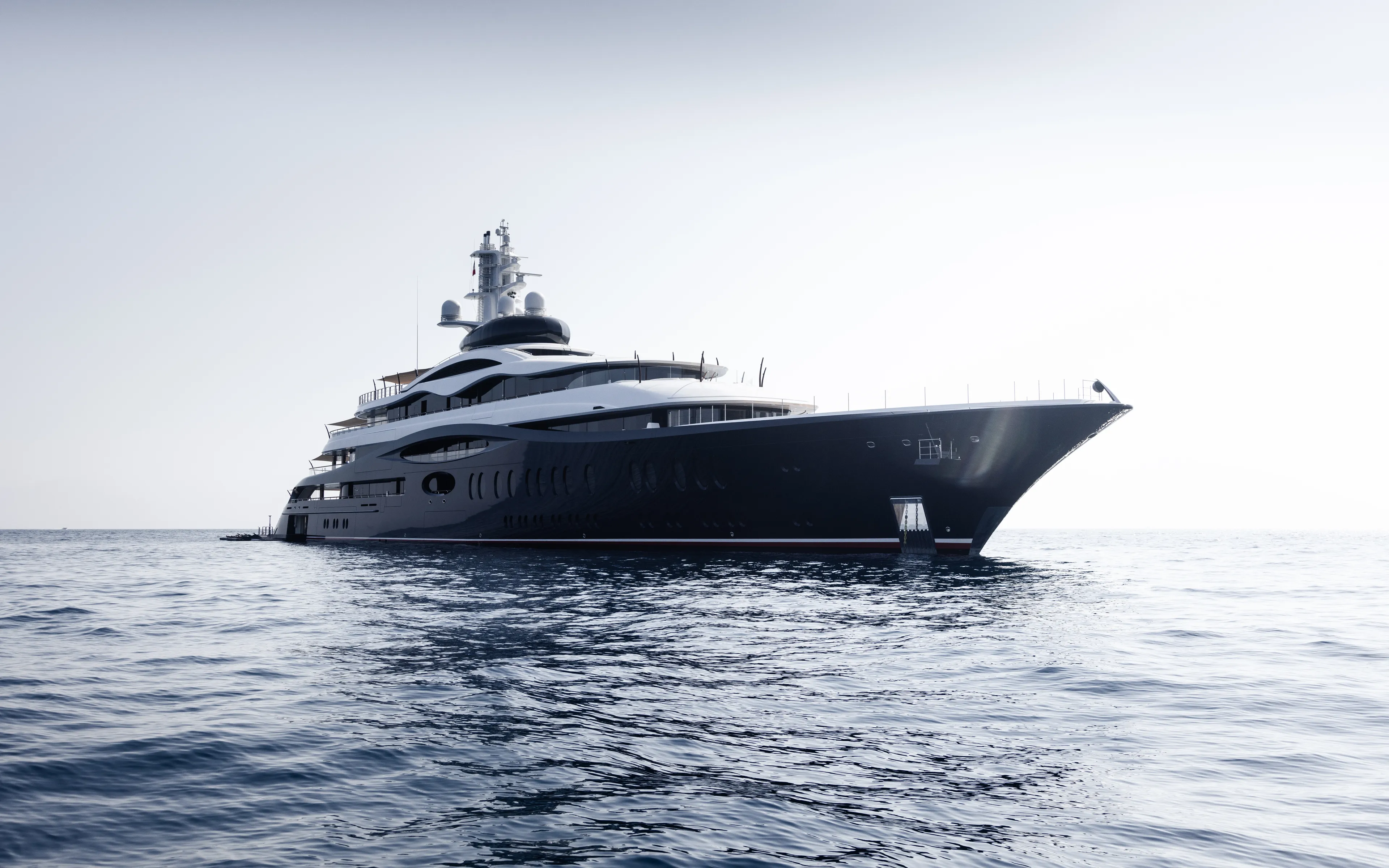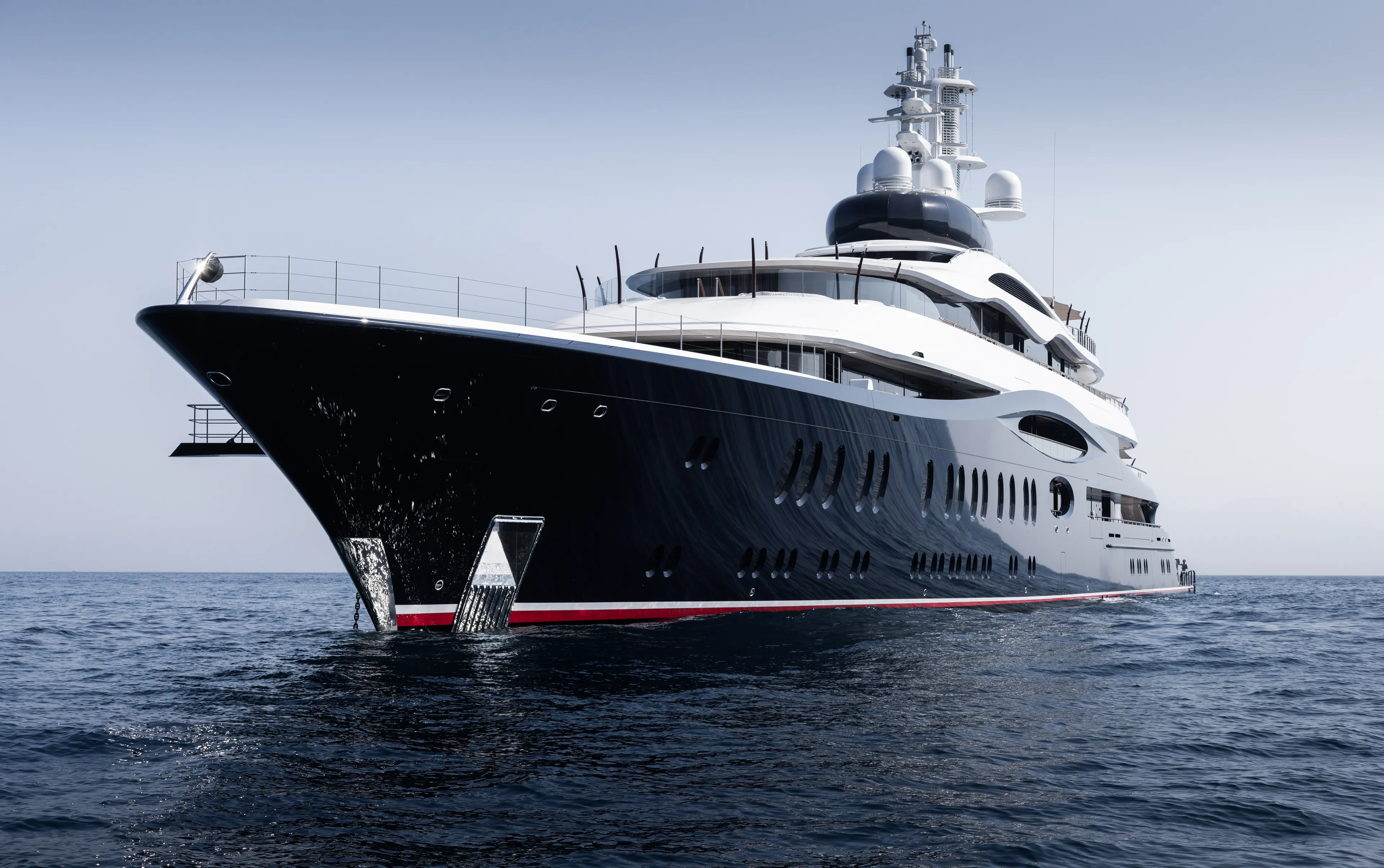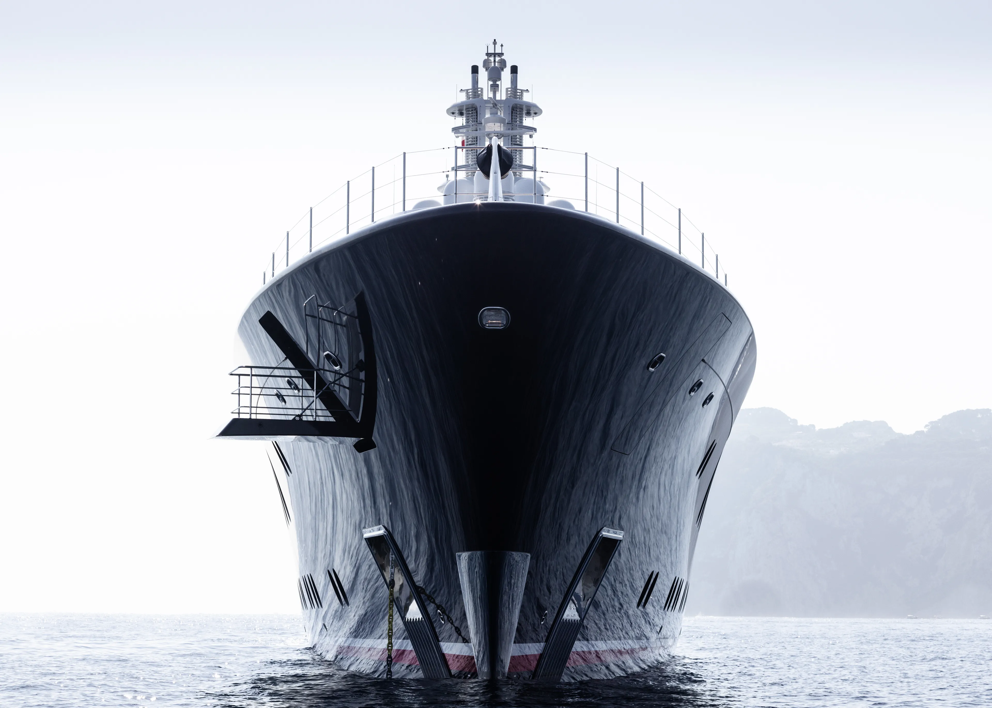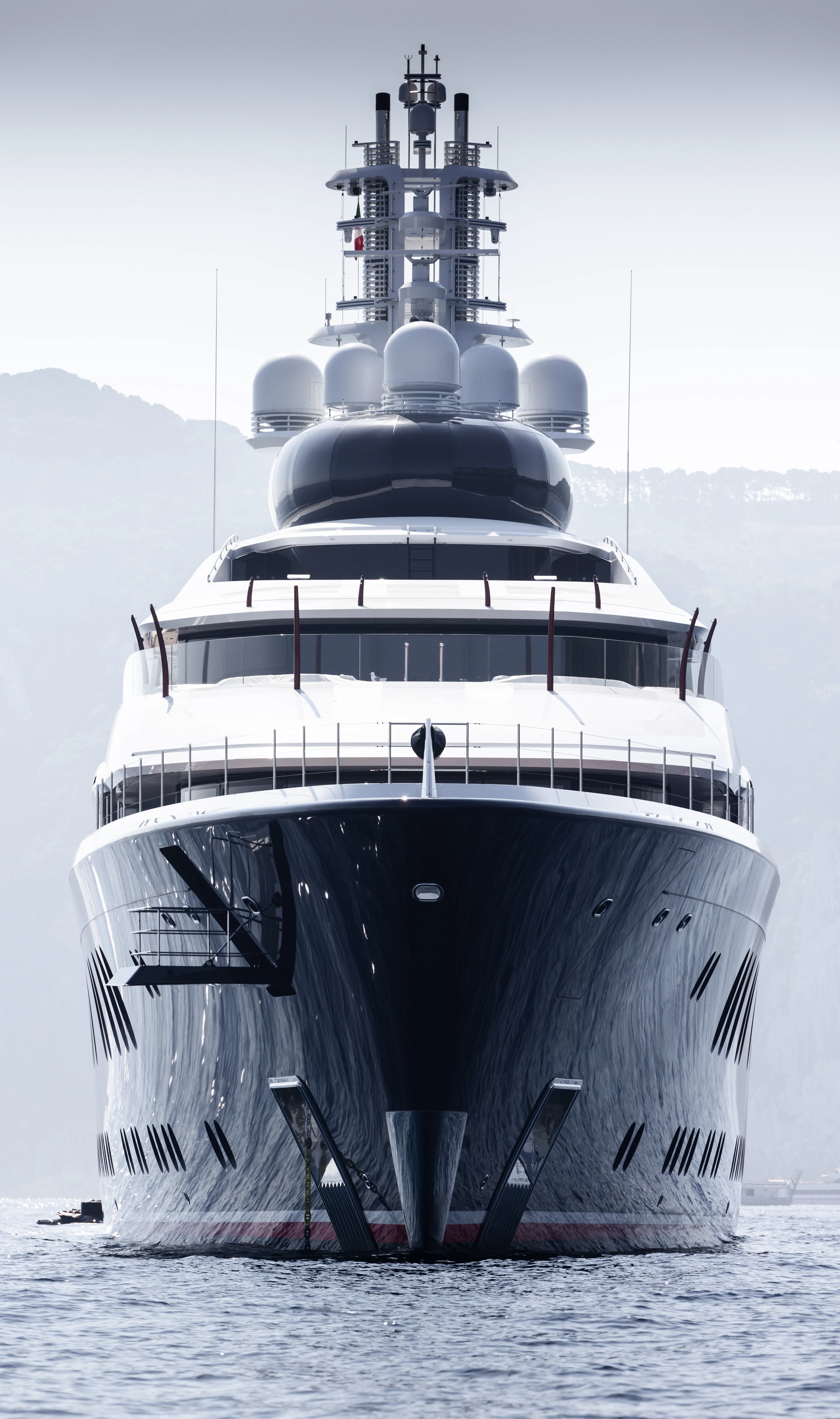 At take-off, LAUNCHPAD was by far the largest yacht Feadship had ever built – an accolade it would retain until 2024. A classically balanced yet edgy and innovative yacht, her unique wavy lines give the impression the Flag Blue hull rises beyond the main deck. Her contours are chamfered to emphasize the sleek white superstructure. A defining feature is the fully enclosed, pod-like observation lounge on the top deck. The curved glass windows in this unusual space offer outstanding forward-facing vistas. Stand-out features include a private outdoor owner’s deck with Jacuzzi; two certified helipads; swimming pool with movable floor; and a spacious beach club.