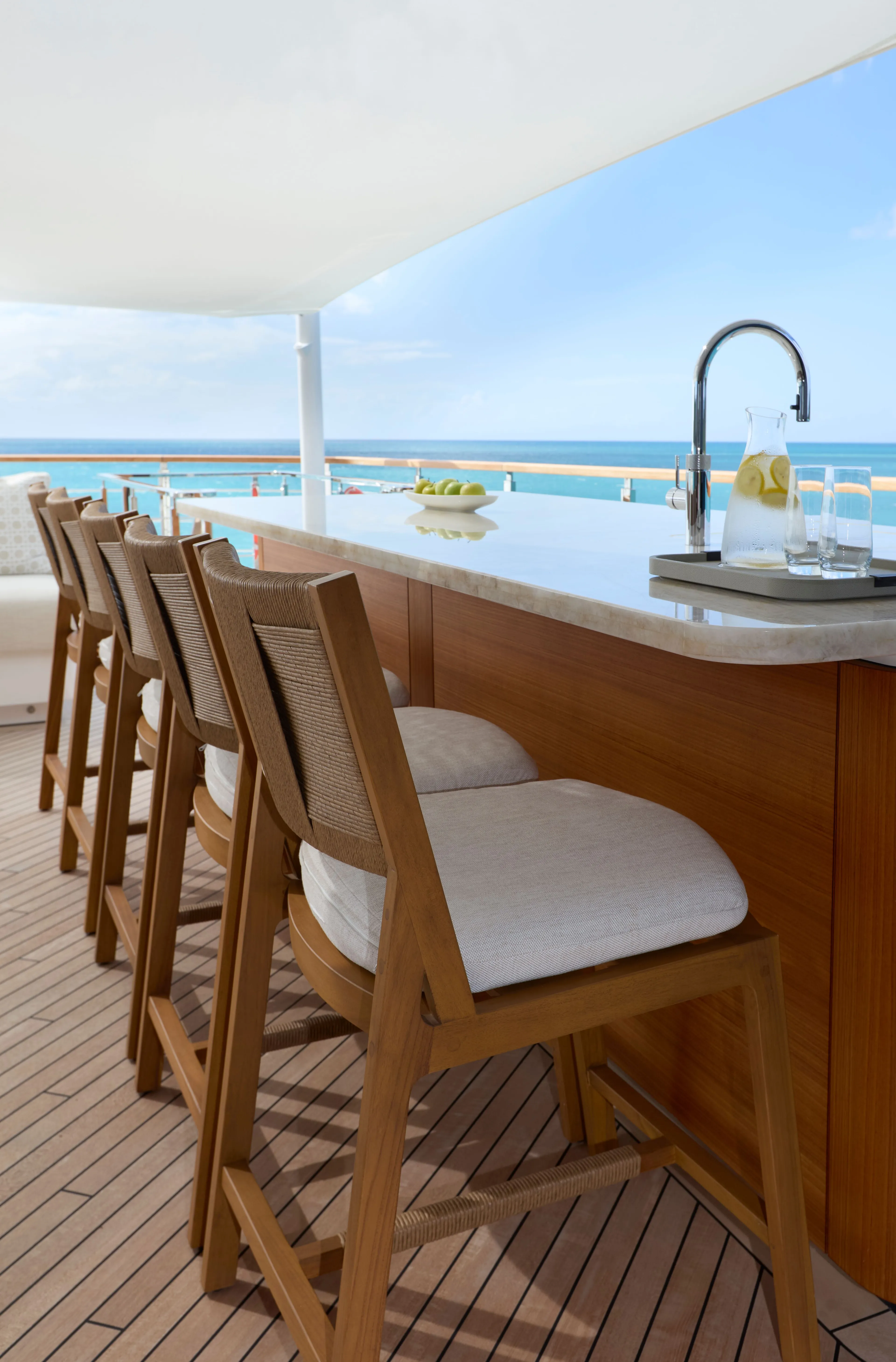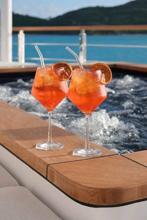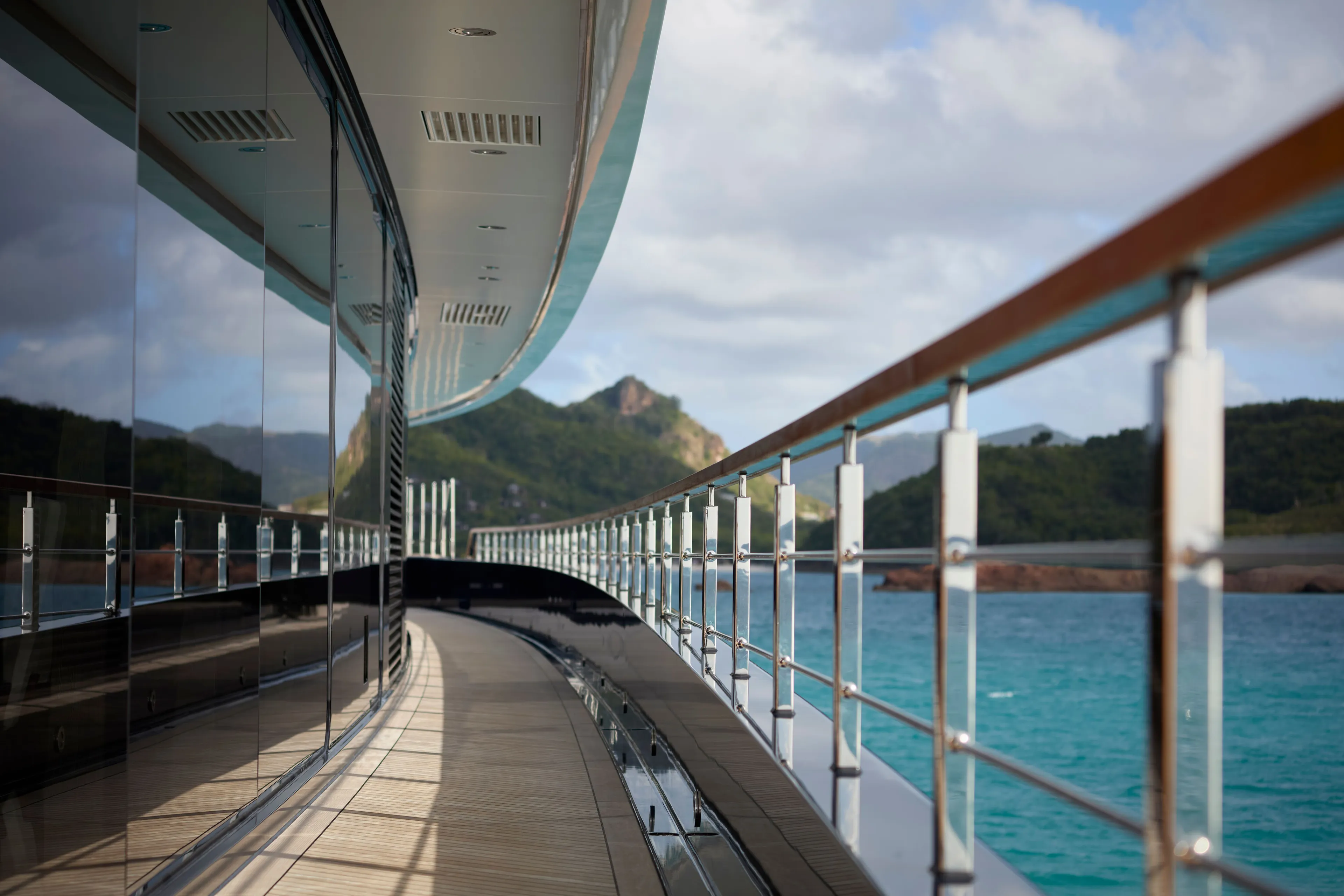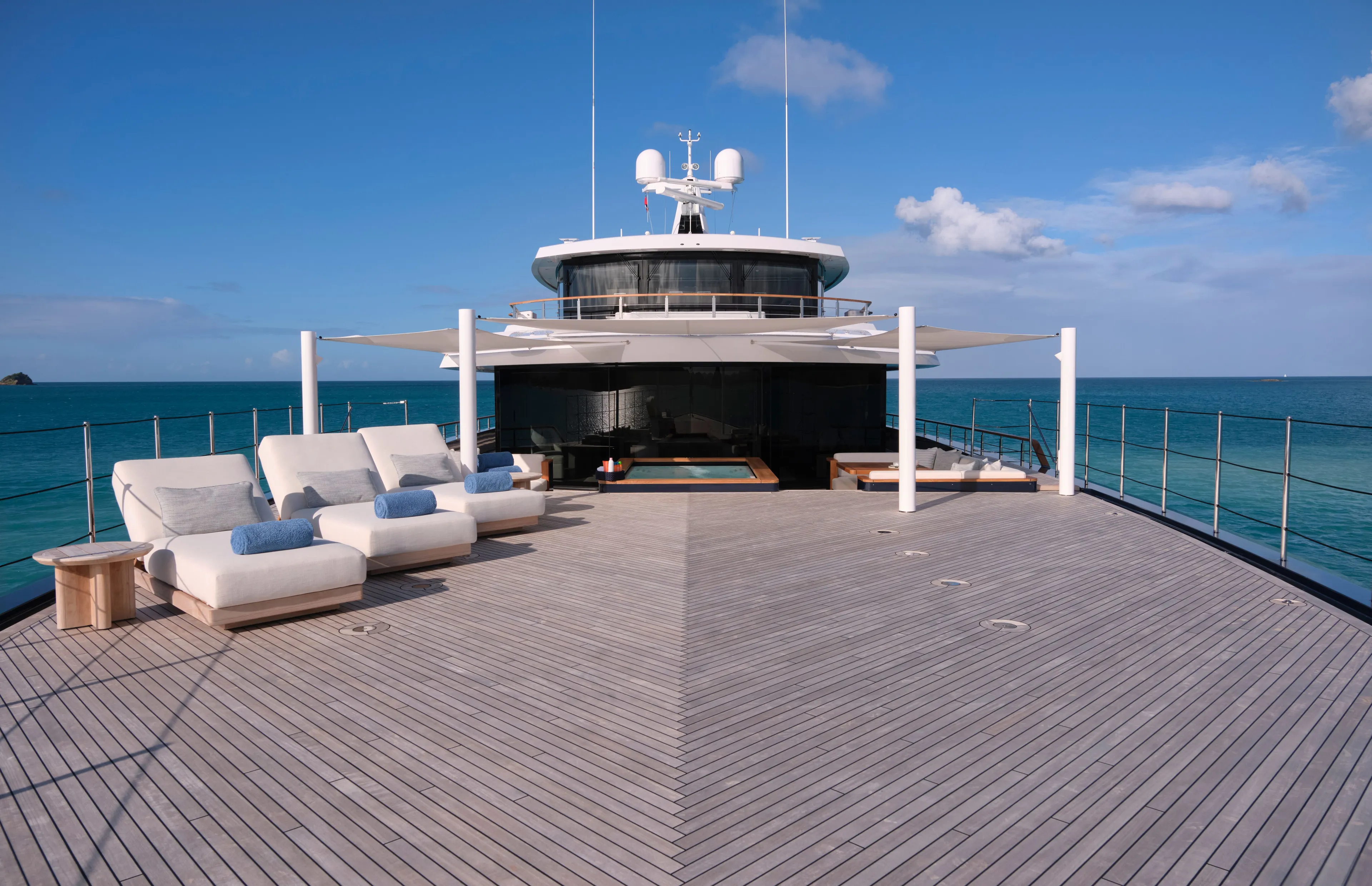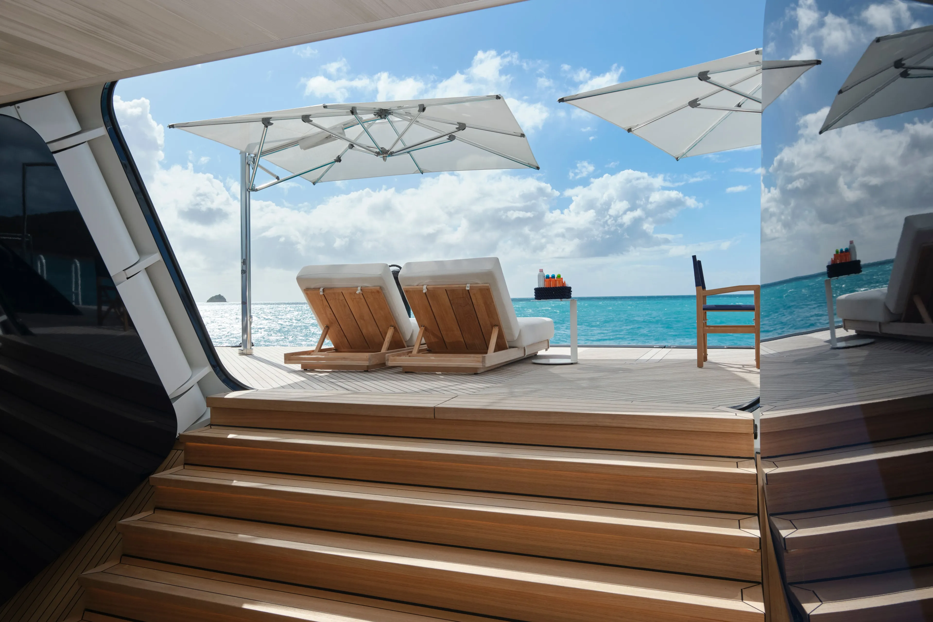 The 75.75-metre Feadship Les Cinq blends modern elegance with precision engineering. Her clean lines and generous 12.50 metre beam support a layout that balances luxury with privacy. The sun deck’s 6.5 by 4 metre infinity pool sets the tone for relaxed sophistication, complemented by panoramic salons, six serene staterooms and a full beam owner’s suite. Forward on the main deck lies a lavish VIP suite, complete with a private lounge and its own balcony. This exclusive space offers a peaceful escape, a retreat within the retreat. A beach club with spa and gym connects directly to the sea, while a vast tender garage holds everything needed for true exploration.