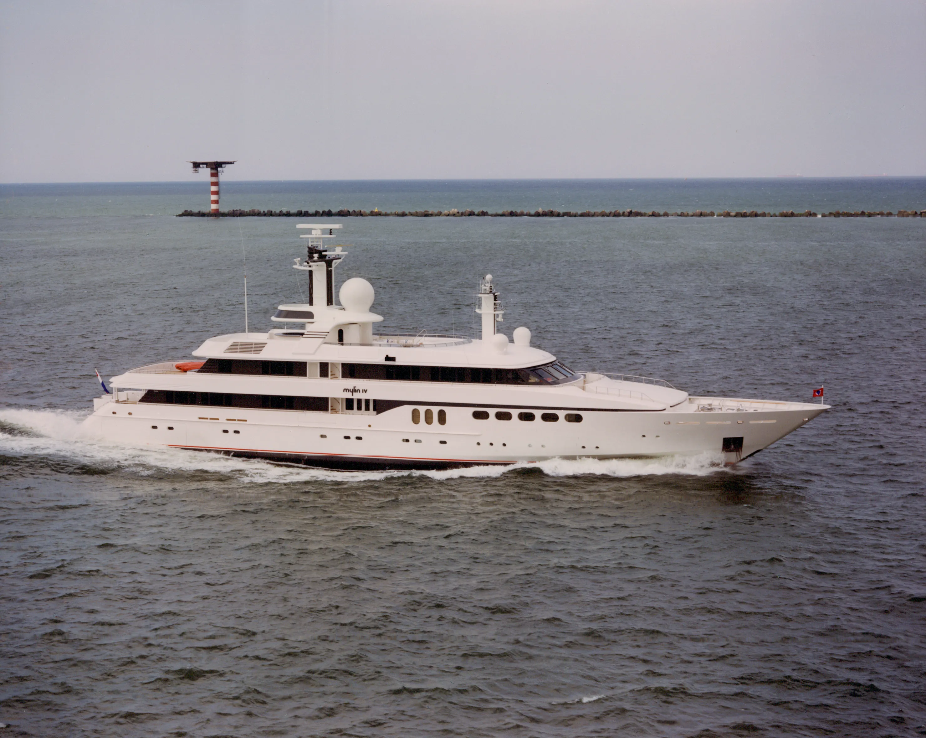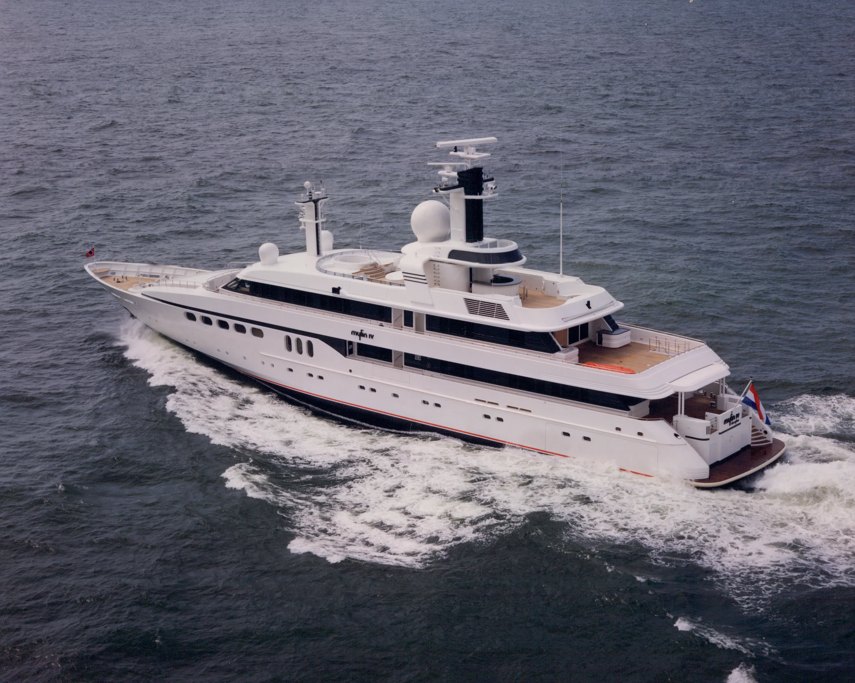 Combining style with functionality, Mylin IV was the first Feadship to have a bulbous bow, designed and developed in cooperation with the Dutch Maritime Research Institute (MARIN). Used on commercial ships for over forty years, such a bow offered a 10% reduction in hull resistance at top speed for Mylin IV – as it would three years later on White Rabbit - allowing these yachts to reach speeds of 20 and 18.3 knots, respectively.