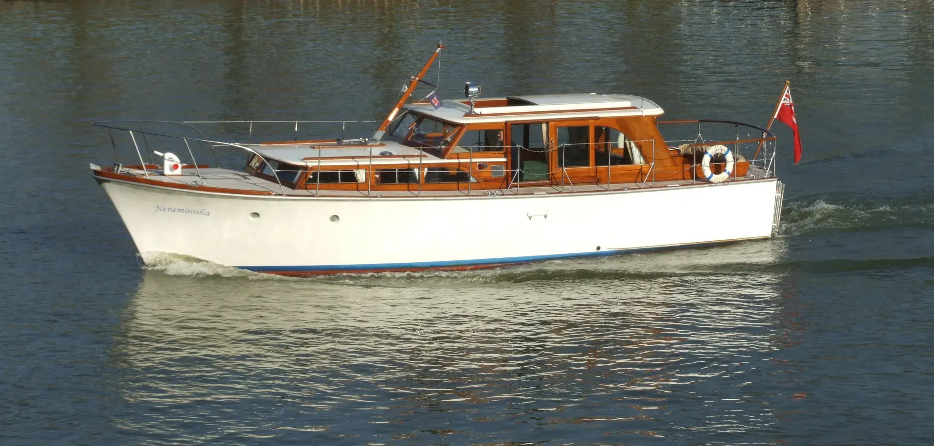 The 11.44-metre Nenemoosha was built for the proprietor of a toy manufacturing company in London. She has remained on the River Thames since and is now with her fourth owner.The name Nenemoosha comes from the vocabulary of Longfellow’s The Song of Hiawatha and means ‘sweetheart’.