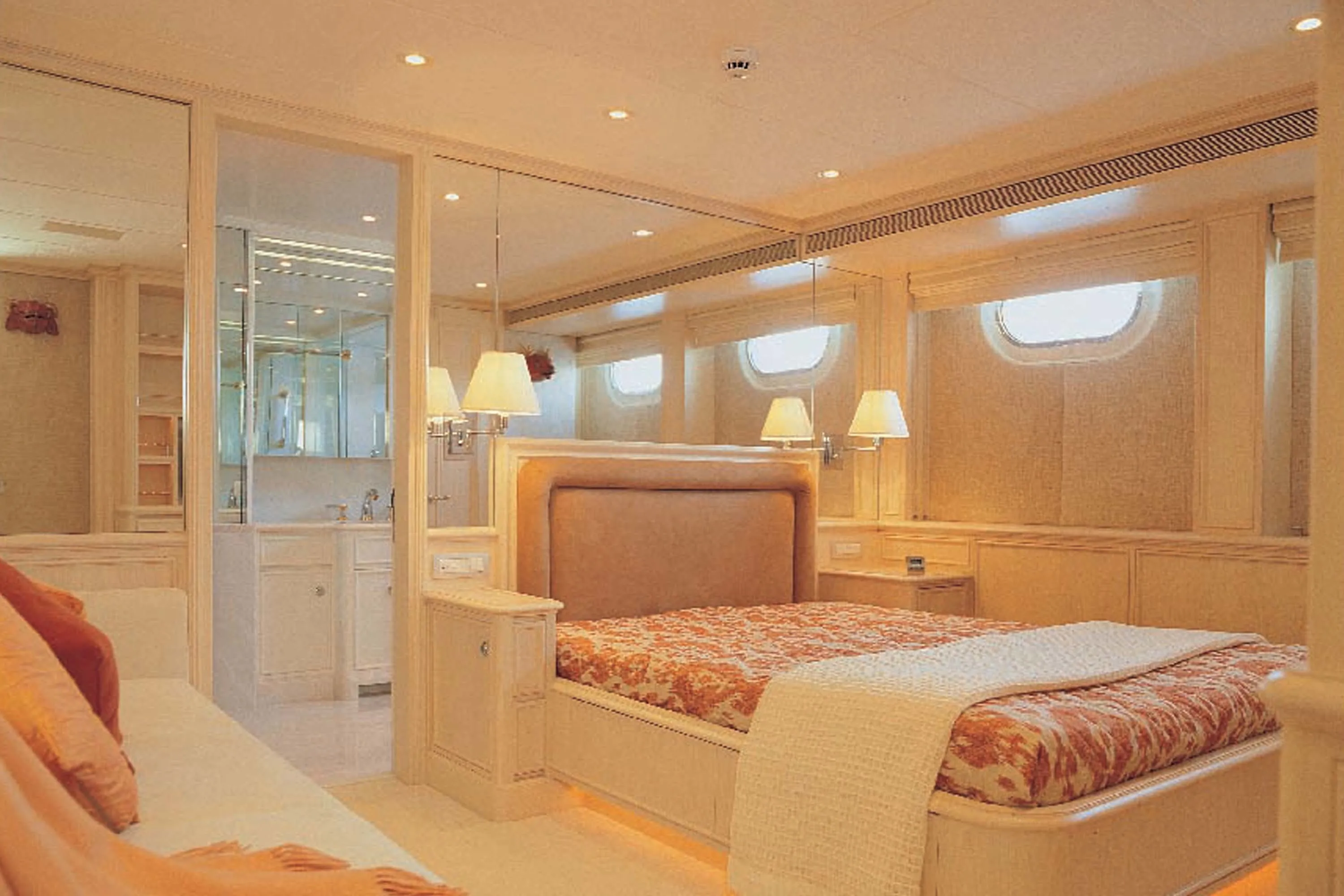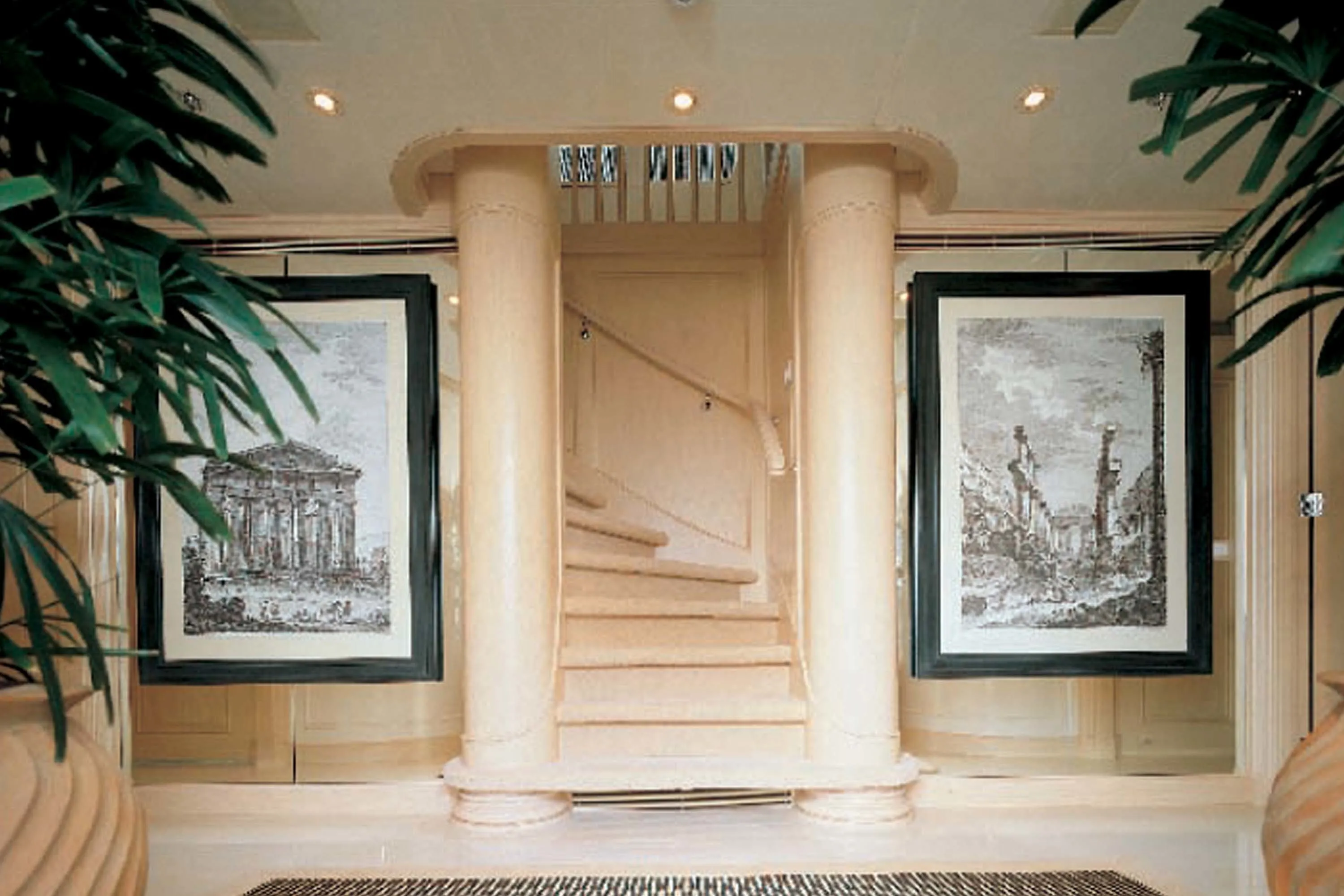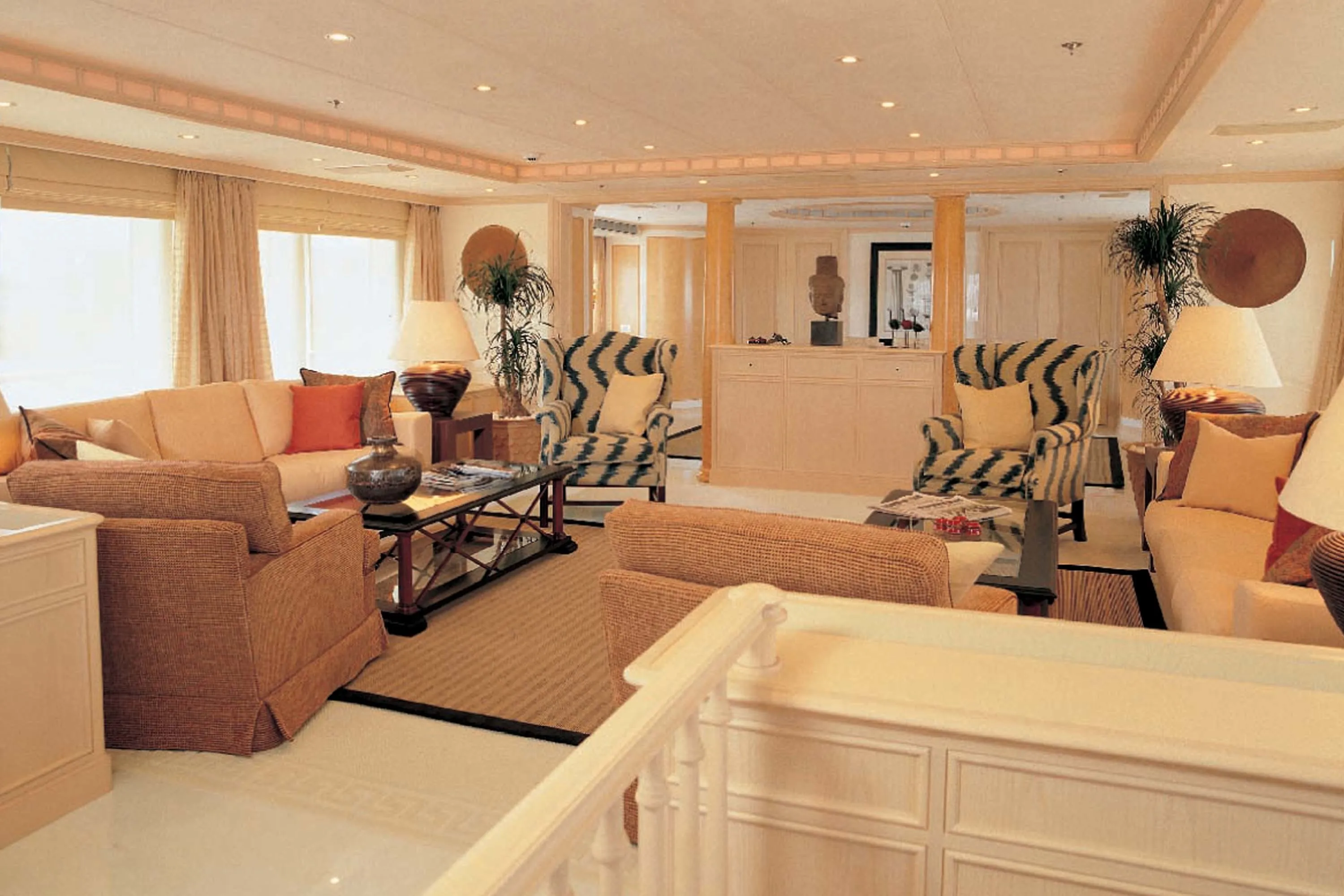 Olympia is very much a classic Feadship in terms of her exterior profile, with a gentle continuous sheer line over her entire length. Graceful flowing lines ensure the superstructure is perfectly balanced with the visually lowered hull. Various styling features give a subtle modern flavour to this traditional concept, such as the reverse transom with its architectural stairways and the large mullions between the window panes.