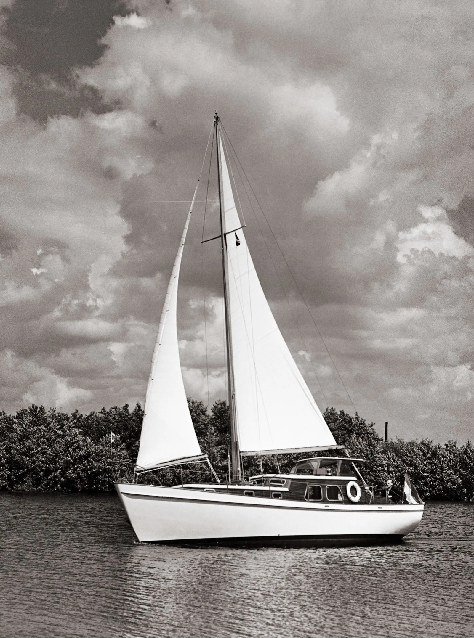 Shortly after construction of motor sailing yacht Flevo had started, the yard decided to build a sister ship at its own expense: Trio. A buyer for the yacht soon emerged, the Frenchman Jean M. Frankel, but he proposed several major changes to the design that greatly lengthened the construction time. After a trial run behind the shipyard Trio left Aalsmeer for Rotterdam, and from there transported to Marseille on board the MS Leiderkerk.