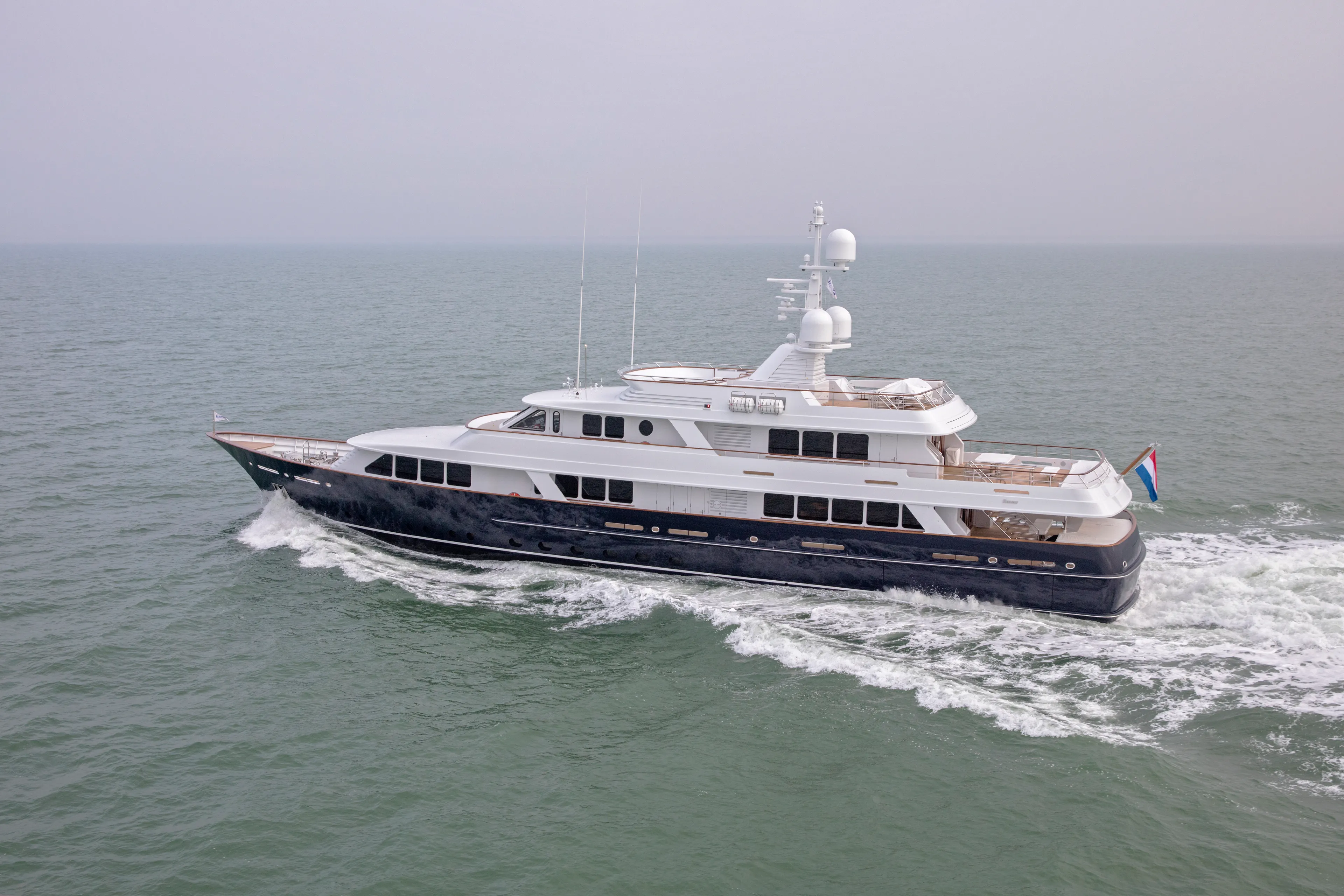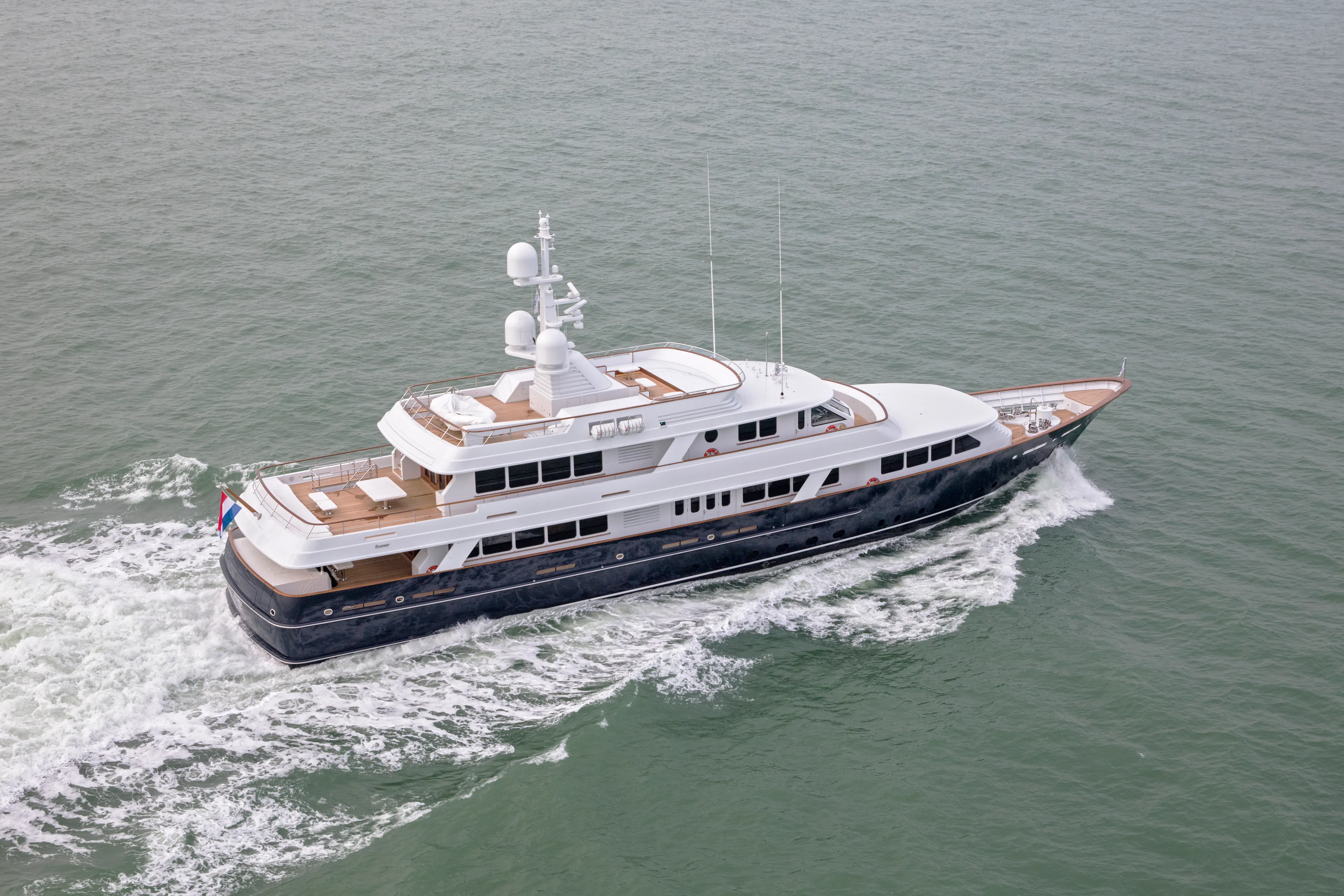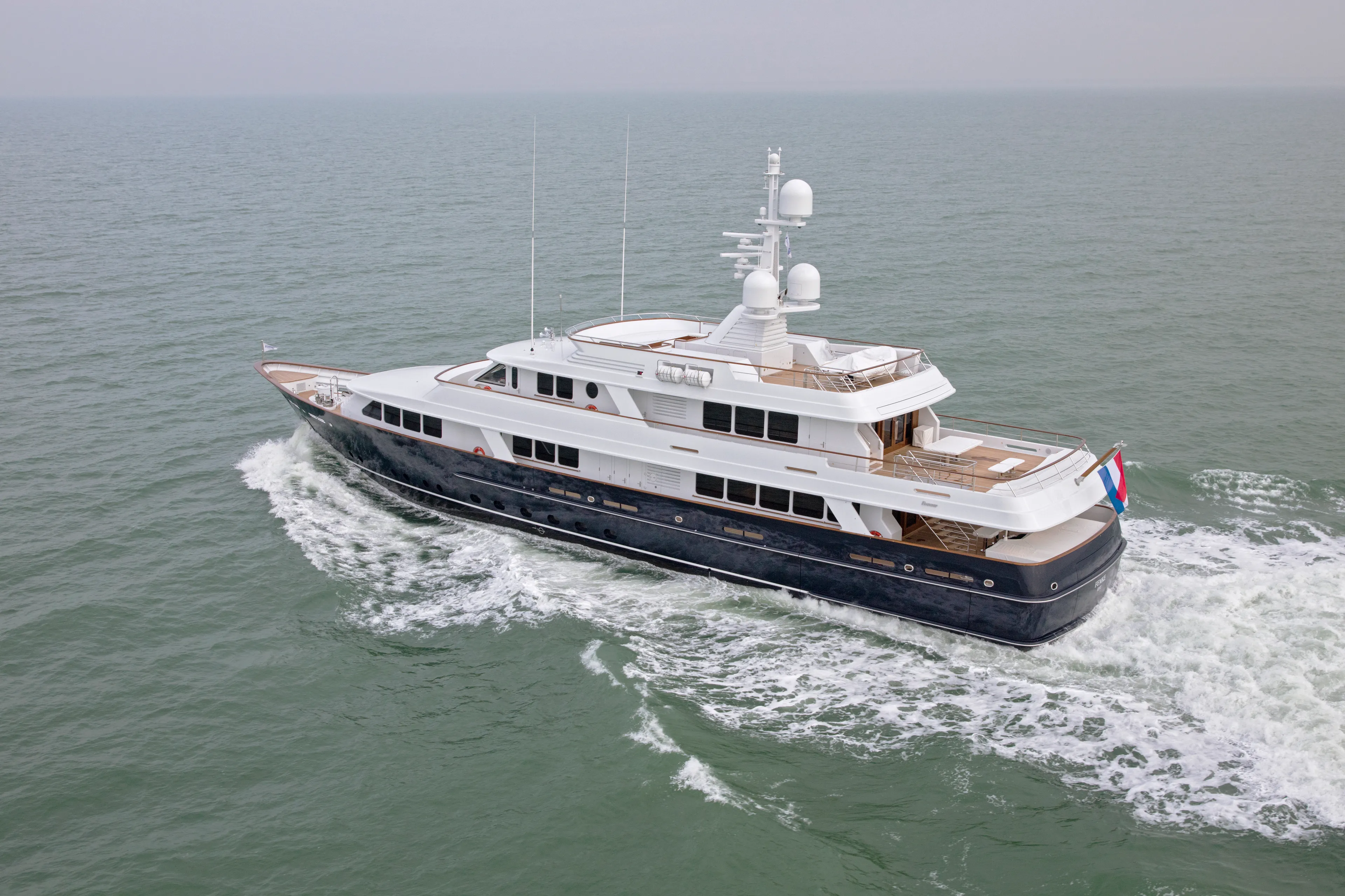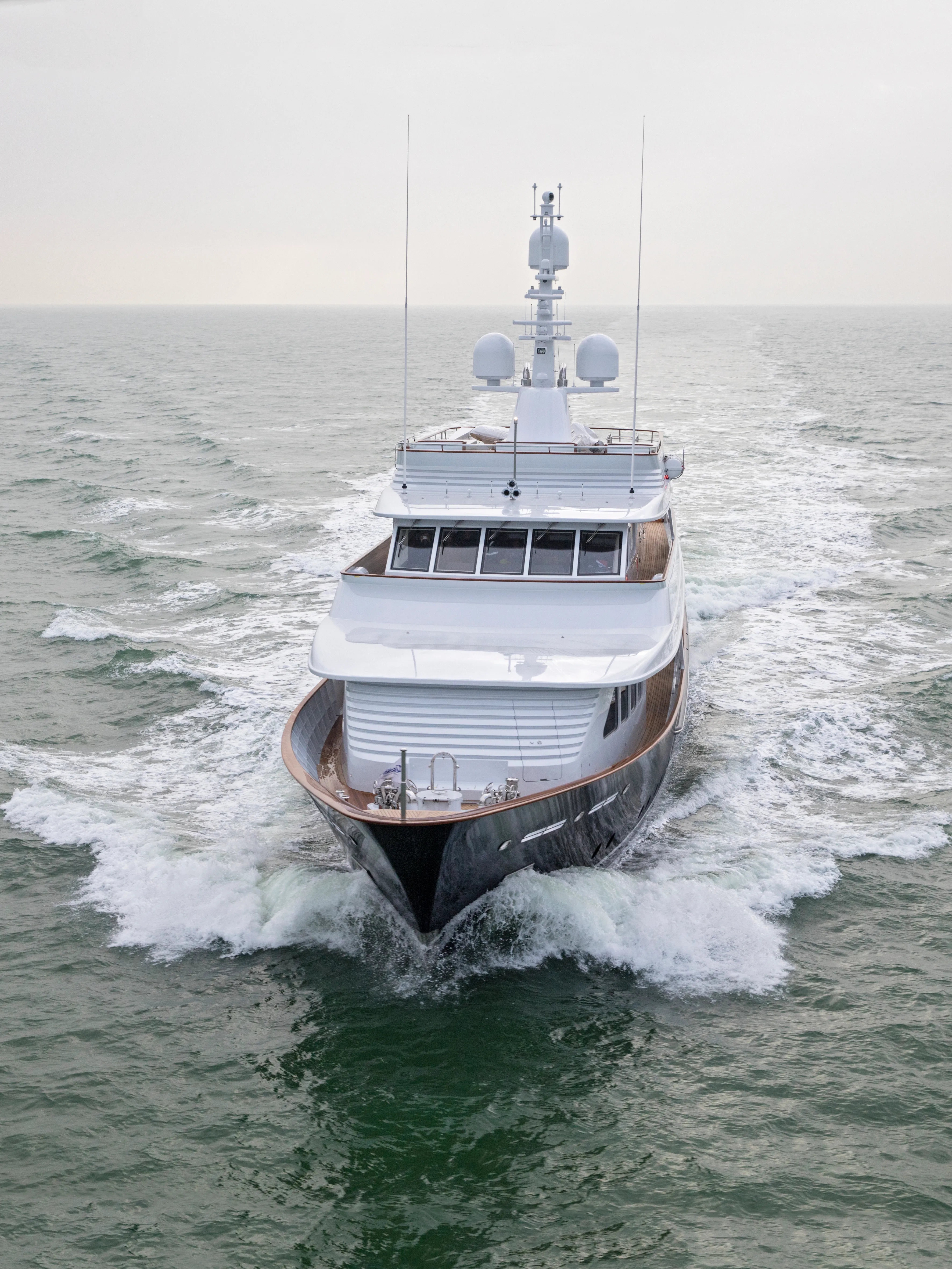 Valoria was built for an experienced owner keen to revisit the classic era of Feadship while enjoying a rich range of cutting-edge onboard facilities. Reminiscent of beauties such as Aurora B, she marries a striking Midnight Blue hull with a sophisticated superstructure in Matterhorn White aluminium and exterior teak woodwork with stainless steel details. Designed by Studio De Voogt, the yacht’s profile appears deceptively simple until you notice the delicate grace of her silhouette, the walkaround deckhouse, the curved gunwale of the sun deck forward and the cambered teak deck – all discreet characteristics underpinned by superlative craftsmanship.