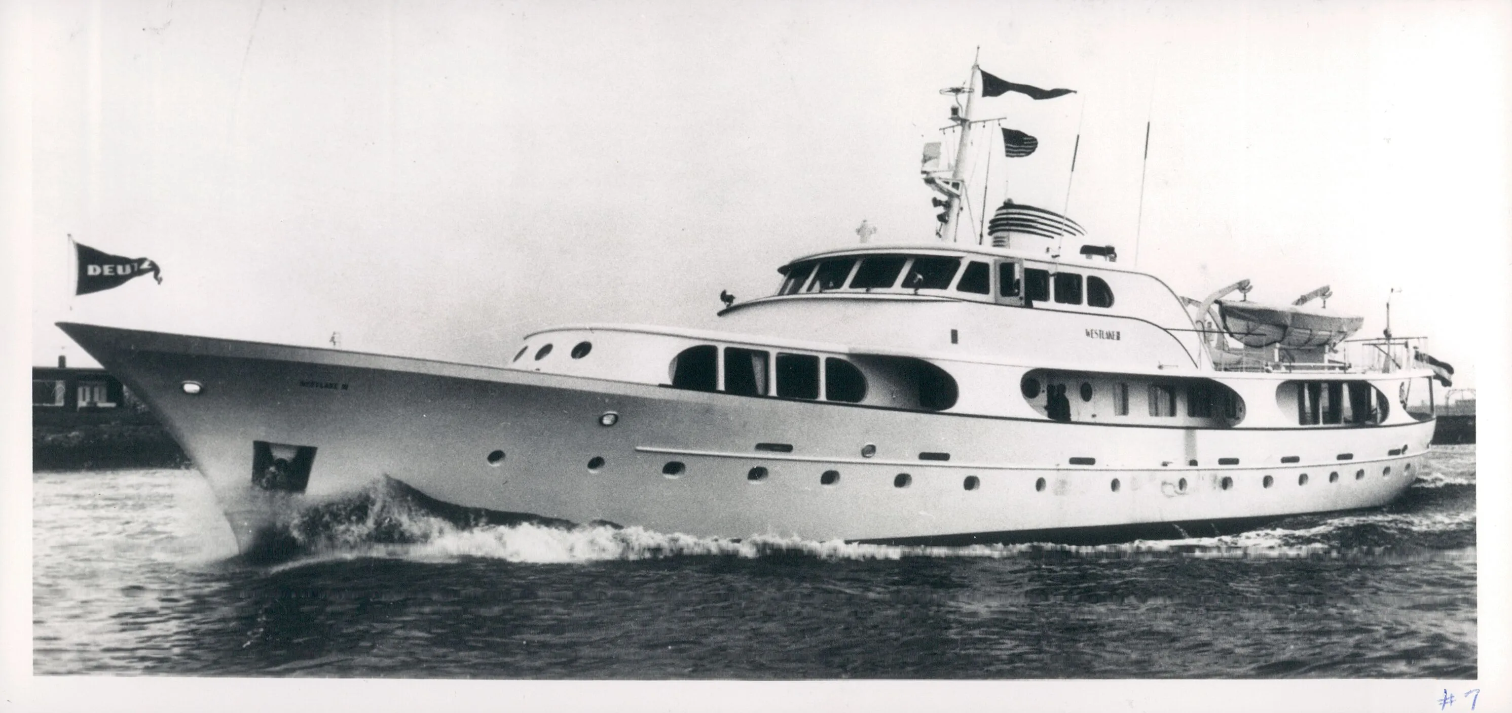 The 44.80-metre Westlake III, launched in 1966, was the first Feadship to have a fully-raised wheelhouse. She was advertised by Feadship in America as such: “Experienced, discriminating yachtsmen look to Feadship for the finest in quality, design and seaworthiness. 147’ Westlake III is capable of world cruising in safety and comfort. One of the largest new yachts built in recent years. May we assist you in selecting your new yacht?”