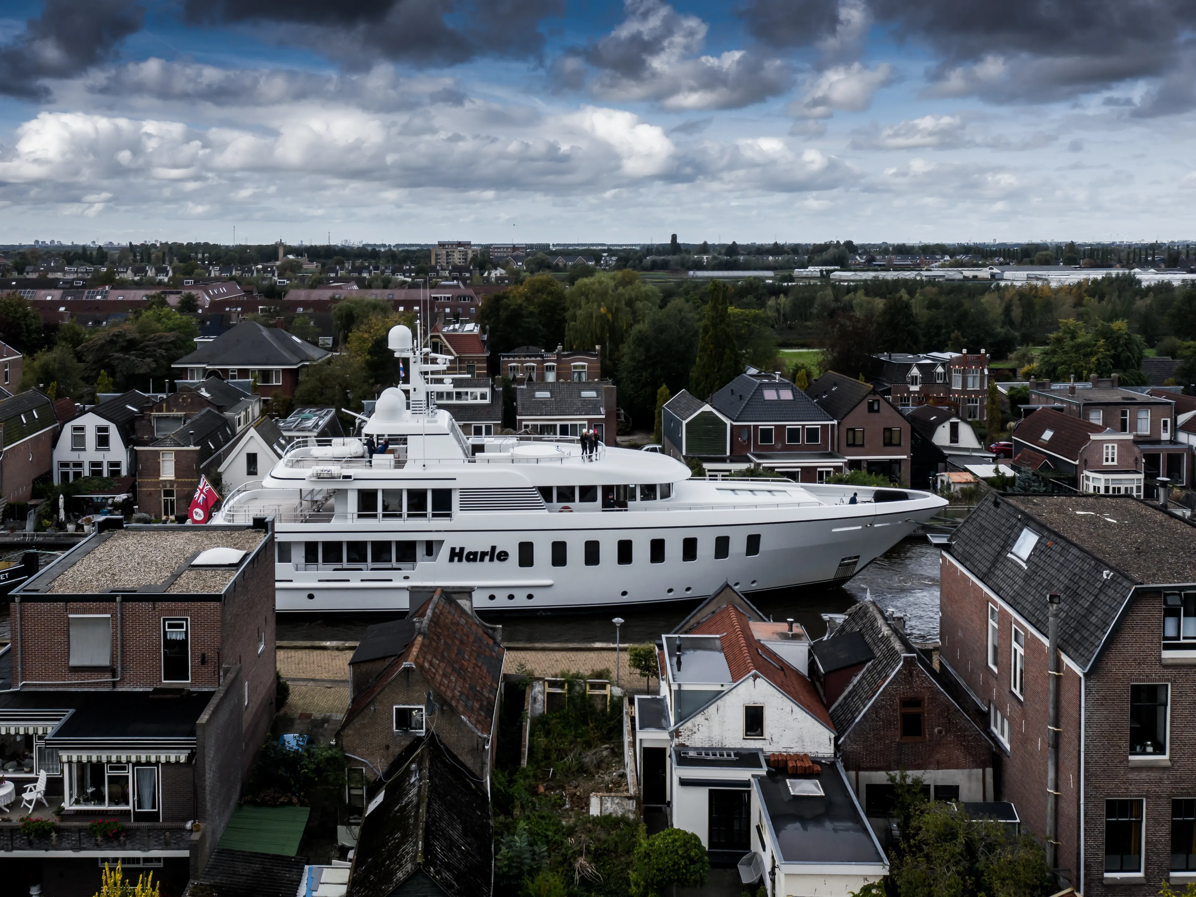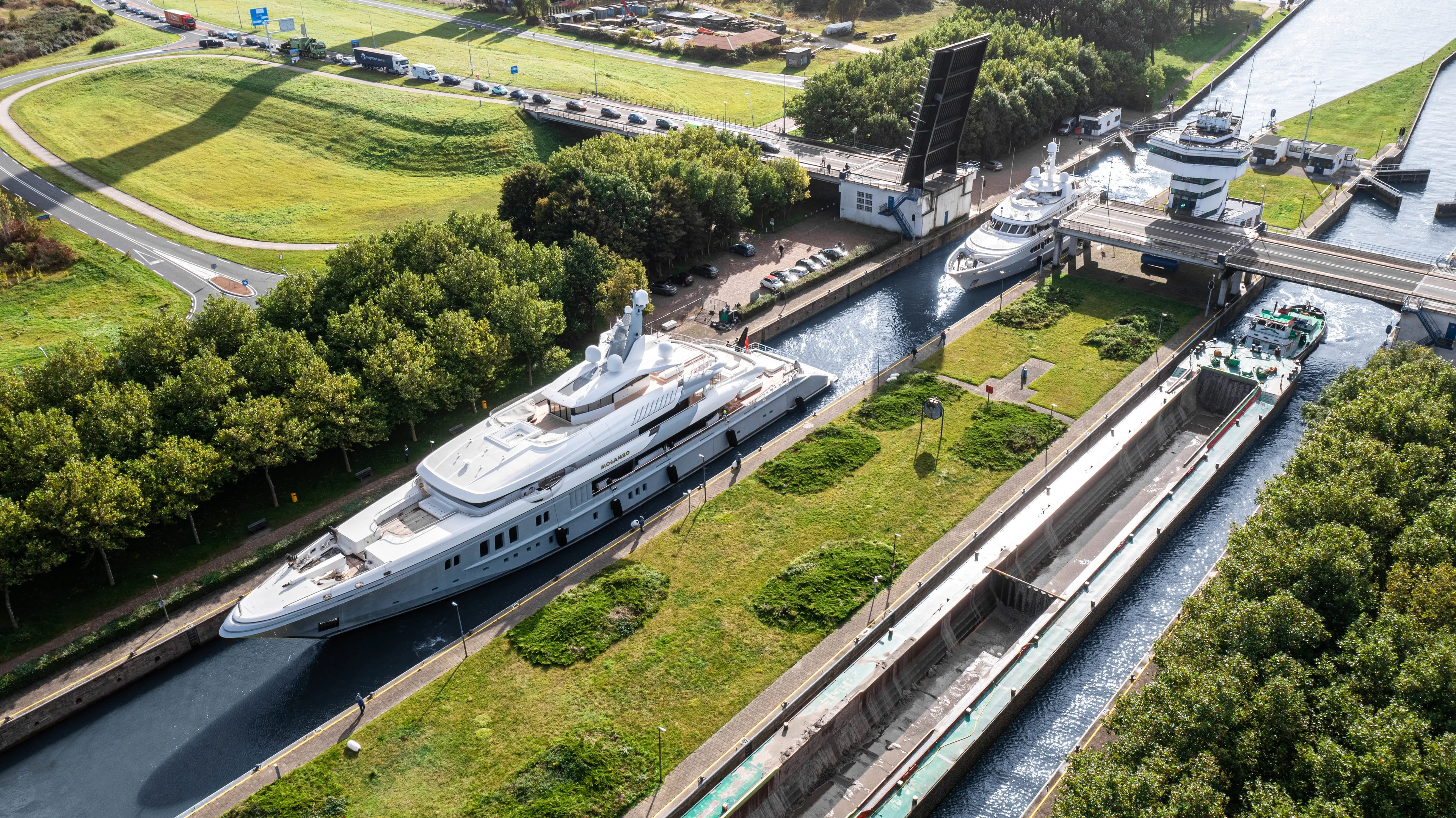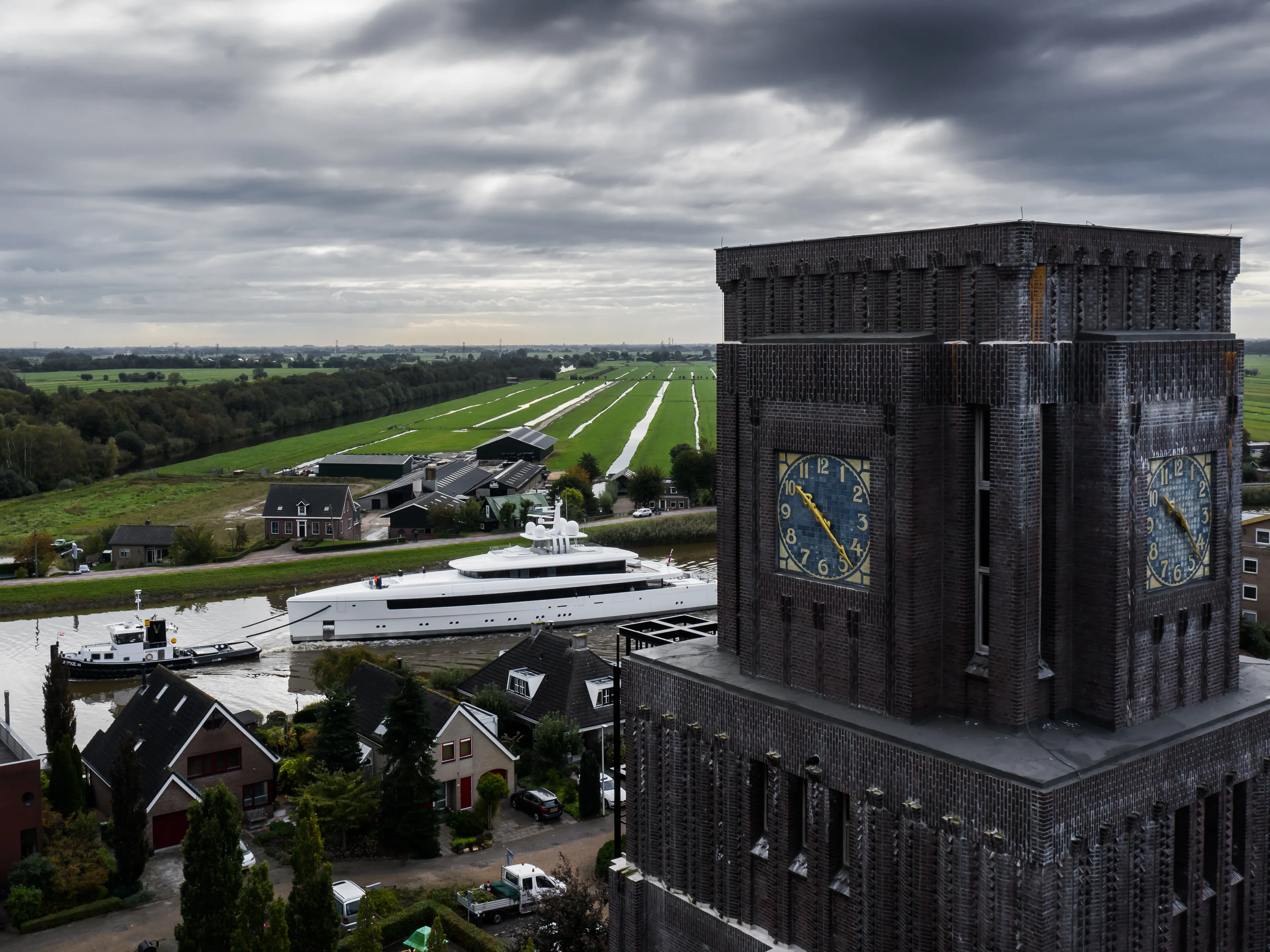 It took centimetre precision and perfect planning for this new 67.40-metre Feadship to pass through the eighteen bridges, locks and aquaducts to reach our outfitting facility in Kaag. As we went to press, Feadship workers were performing their magic on this beauty.