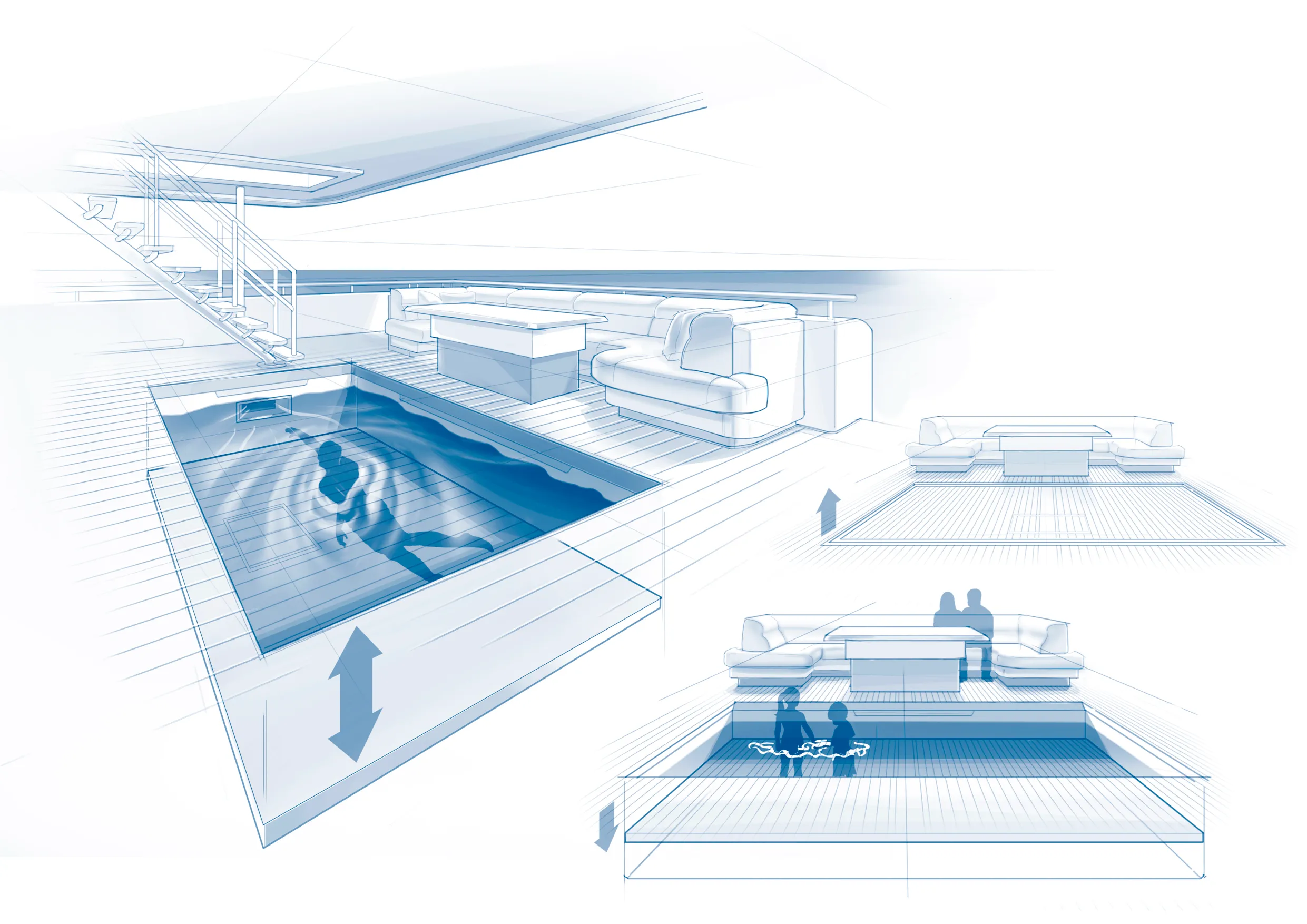 Moon Sand is a textbook example of how projects evolve in terms of size, layout, features and interior décor. Take for instance the contraflow swimming pool on the aft deck, one of the first major additions during the design phase after the owners decided they would like to be able to exercise on the aft deck. Fitting such a pool on a 44-metre yacht called for considerable ingenuity, as well as a lengthening of the design. In a Feadship first, we engineered a floor system whereby a section of the deck lowers to create the pool depth required. It only takes twenty minutes for the pool to fill up, after which the contraflow system can be switched on and the pool used to its full effect.