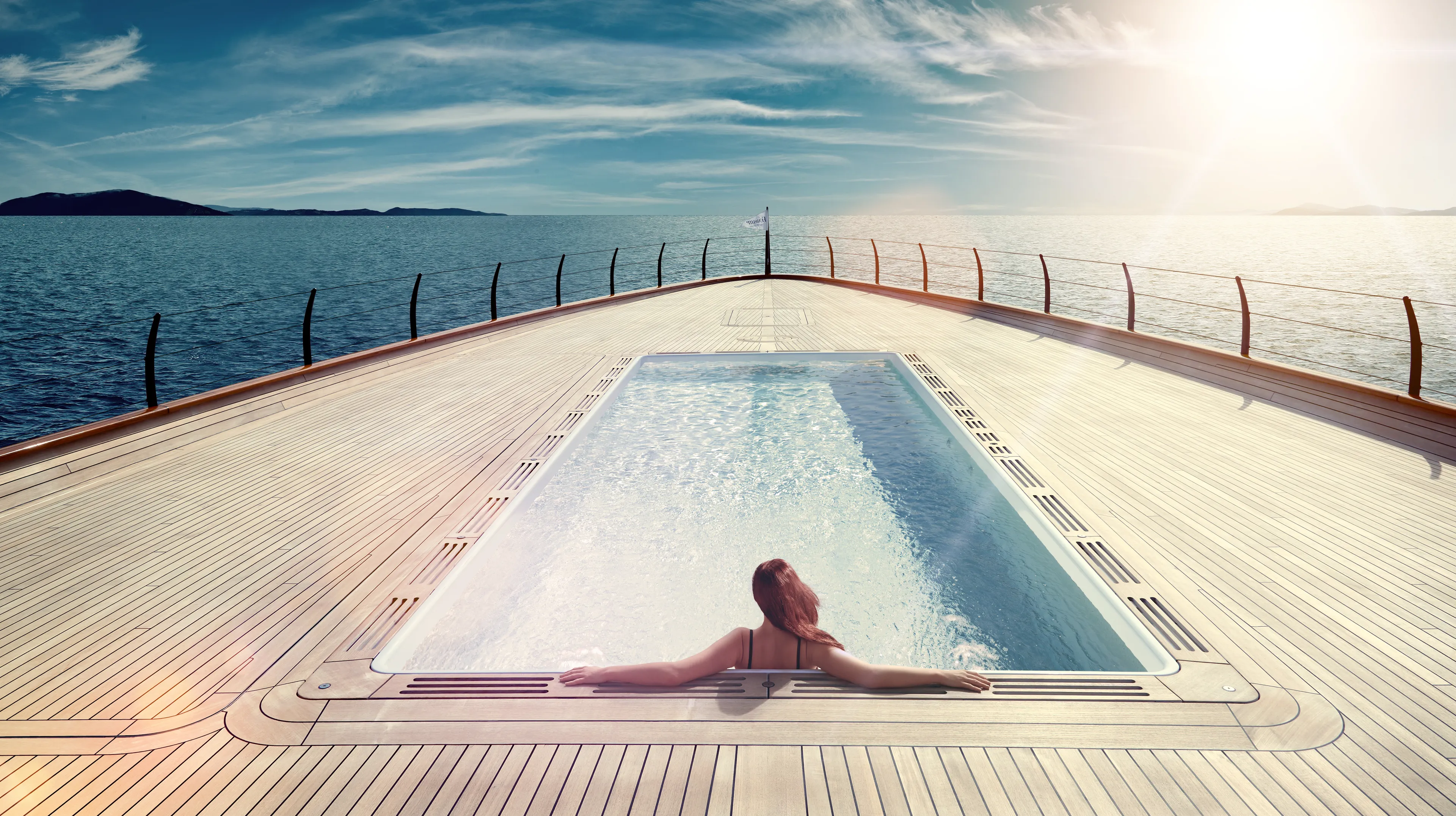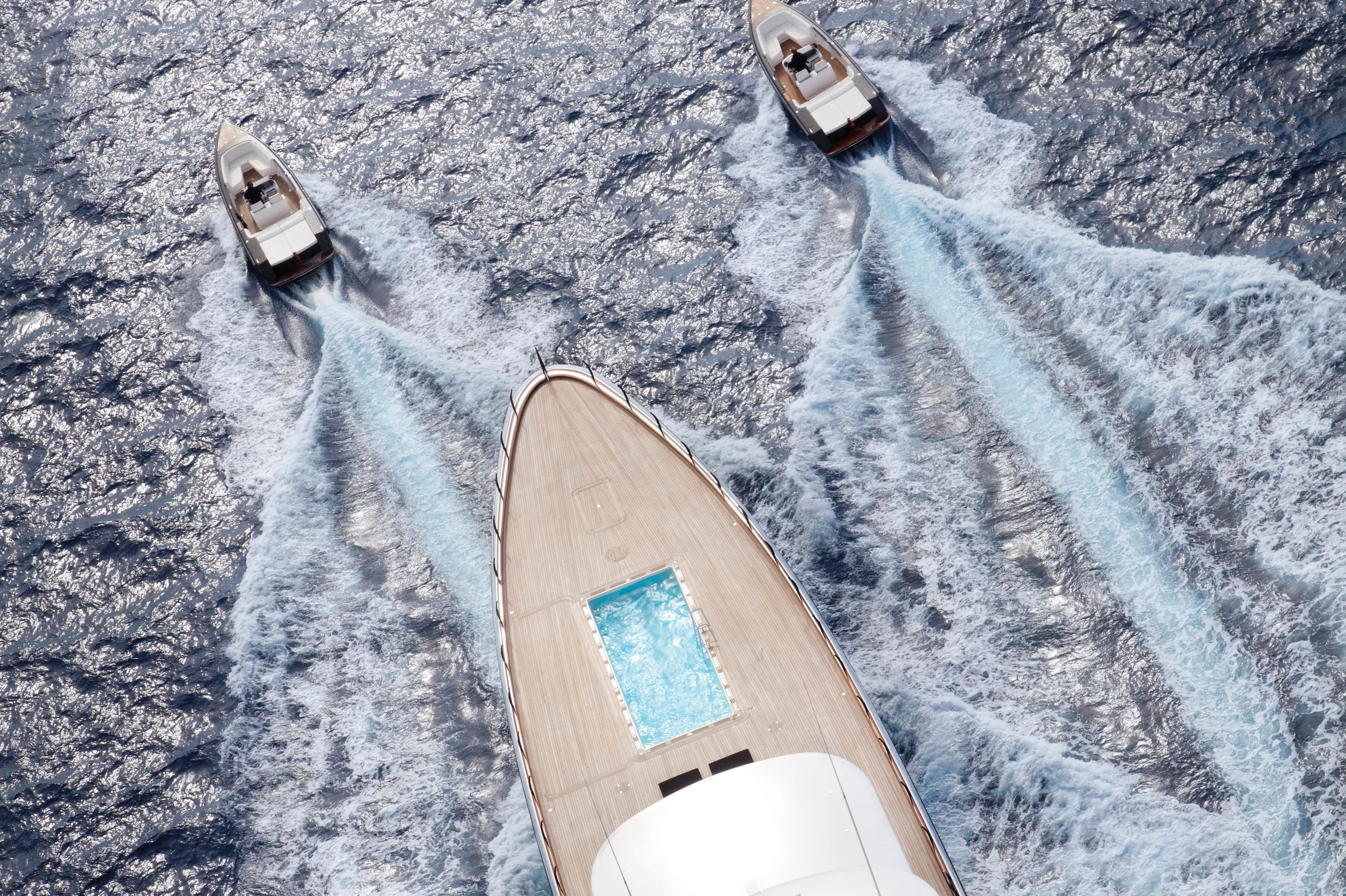 Air is extremely spacious and can accommodate twelve guests in seven large staterooms including an impressive split level owner’s suite, two guest cabins on the upper deck, one on the main deck and three on the lower deck. The owner's observation lounge boasts a breath-taking view over the eight-metre long pool on the vast main deck forward area. The magnificent sun deck offers a well-equipped gym, lounging areas aft and forward with Jacuzzi, and a 102” pop-up television screen for outdoor movie viewing.