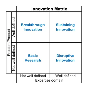 Disruptive innovation. Not a clear business model without a problem or clear purpose with a high probability of failure. Requires freedom, out-of-the-box mentality, brainstorming and broad expertise.