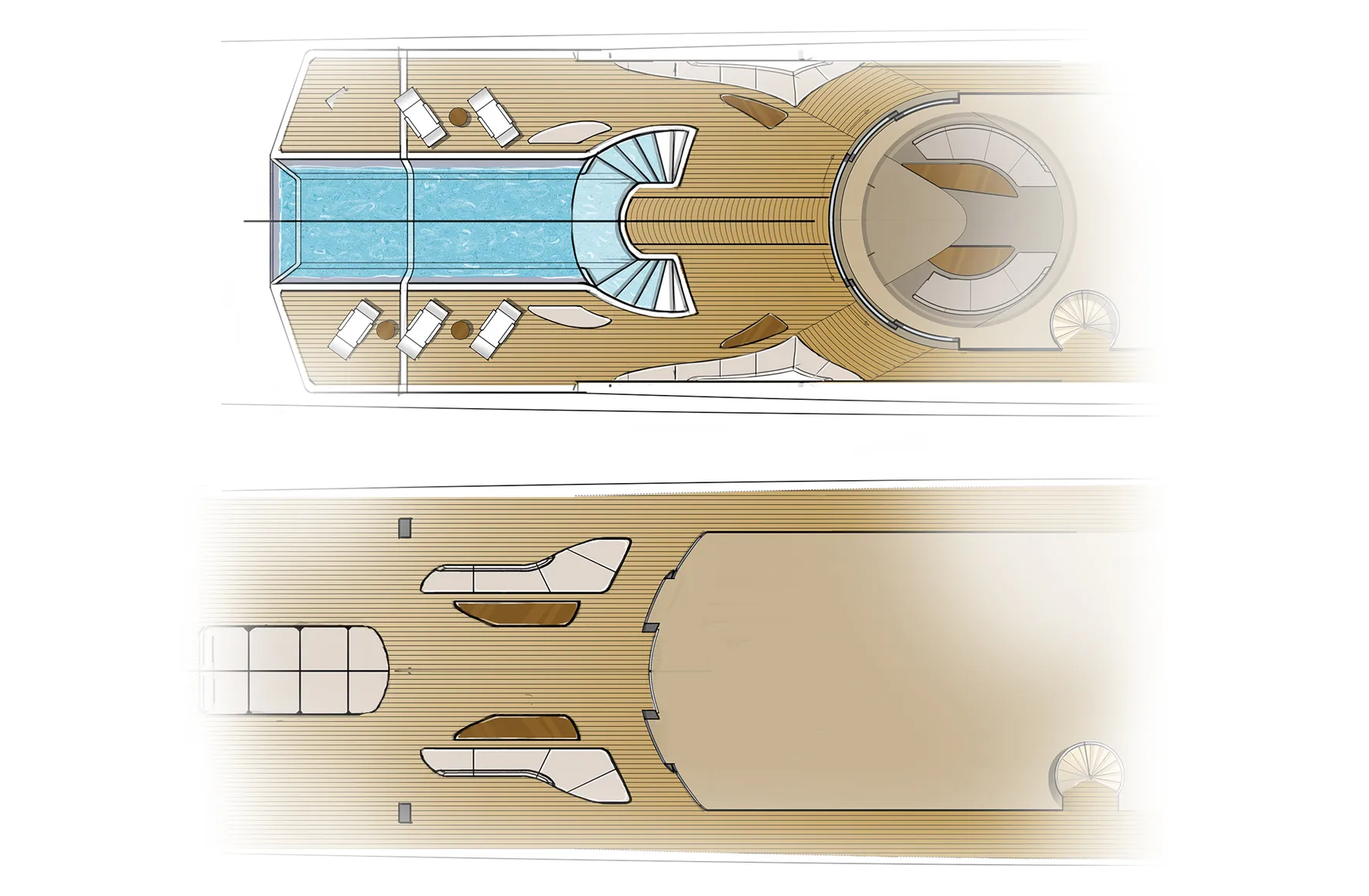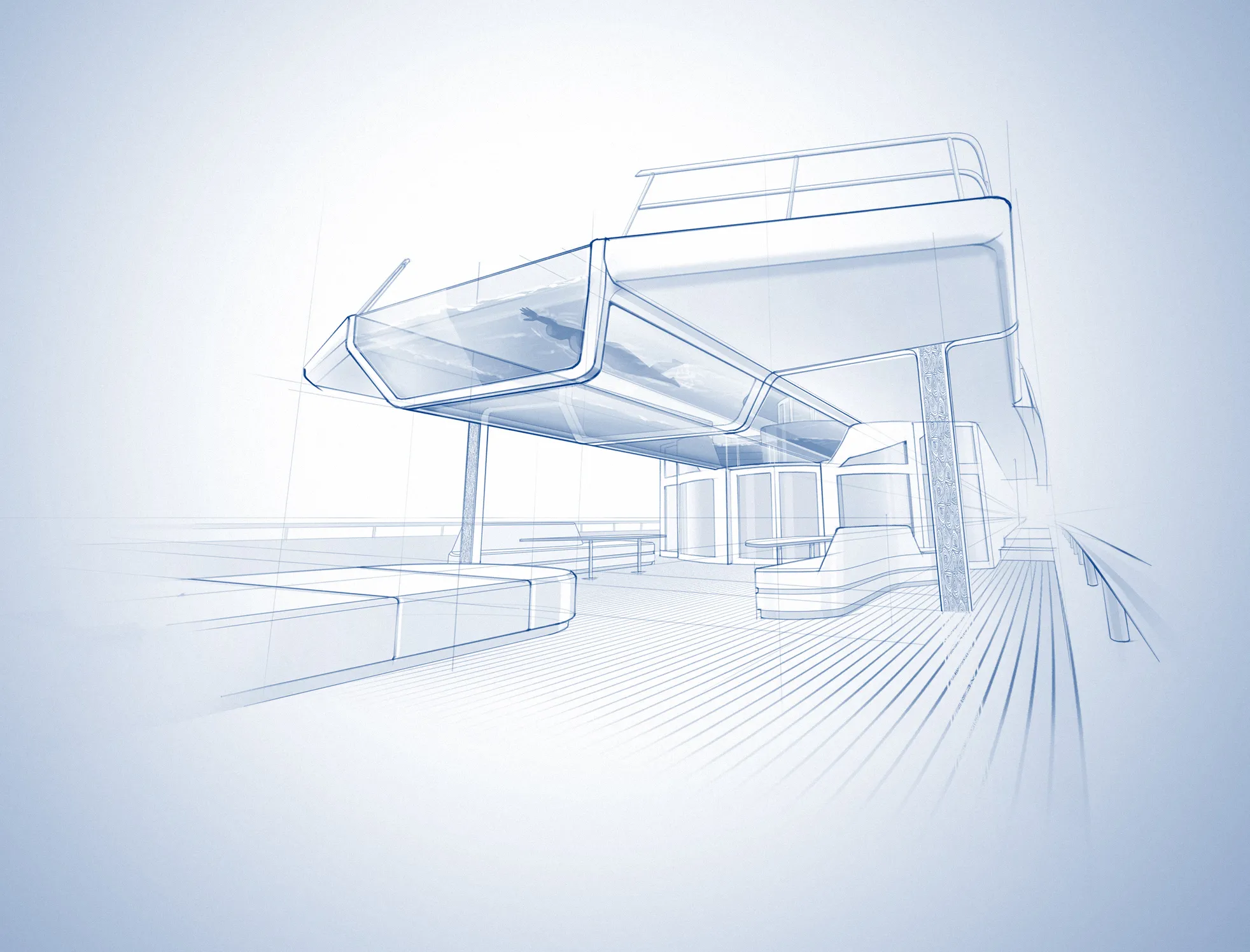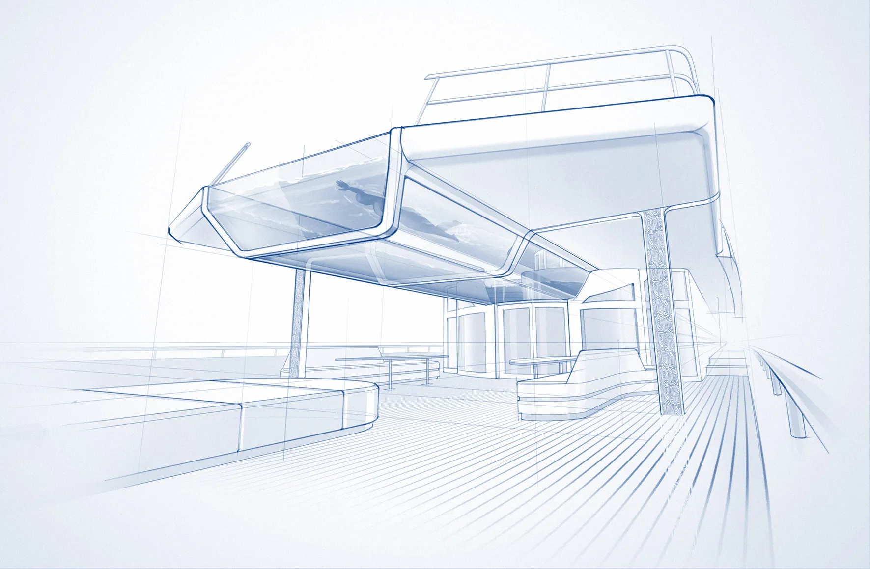 There are already a number of Feadships out on the oceans where guests can see what is happening in the pool on the deck above because the bottom of the pool forms part of the superstructure roof. The suspended pool concept takes this interactive feeling a step further: by ‘hanging’ the pool from an aft deck, the sides and aft end are also visibly exposed, connecting the decks by increasing view lines. To facilitate the impact of this gravity-defying feature, the thickness of the deck from which the pool is hanging is kept to an absolute minimum.