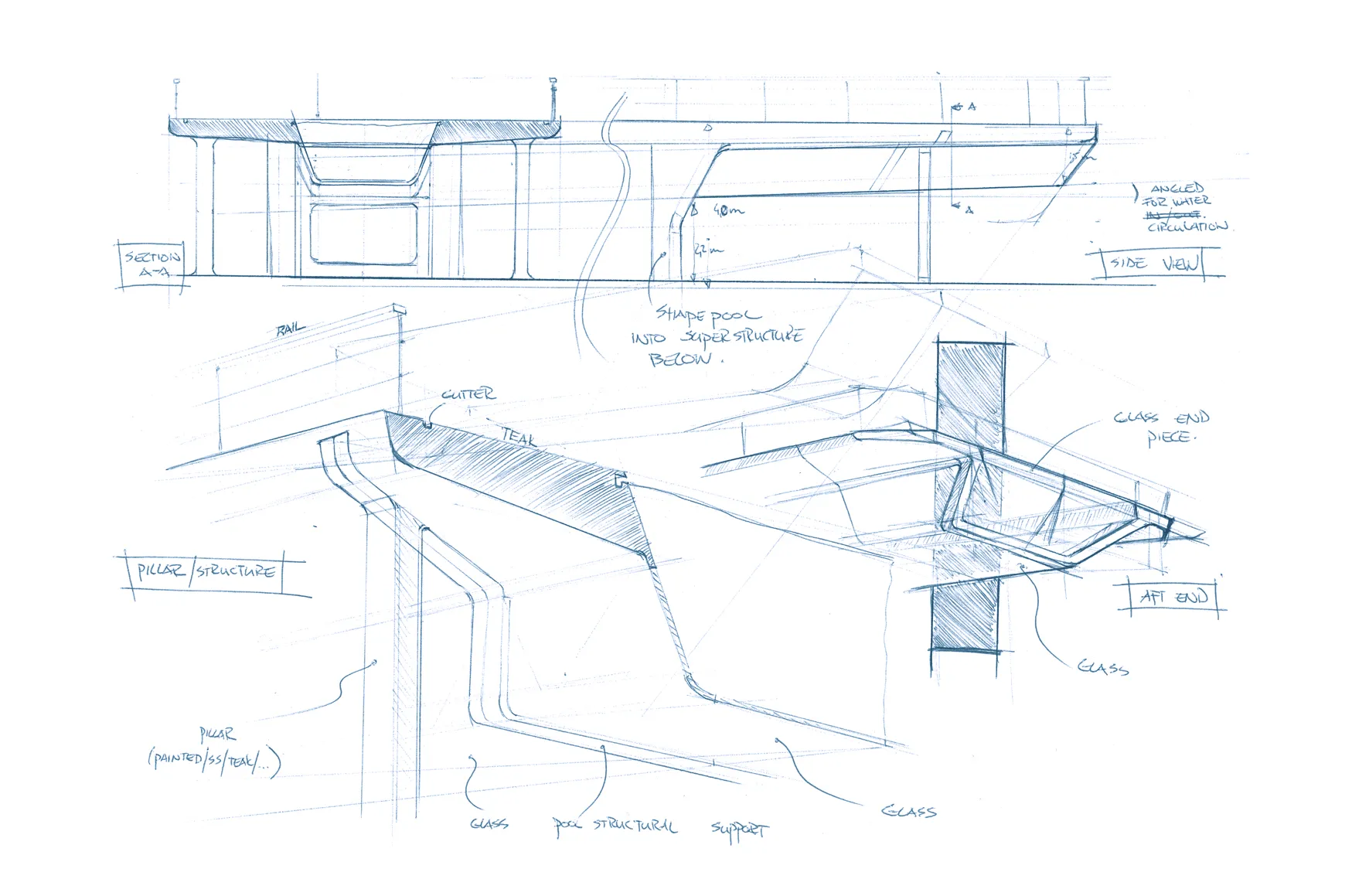 To make guests feel safe when passing under the pool, the bottom of the structure slopes forward to meet the superstructure in front of it. This also helps with water circulation and makes it easy to drain the pool under any yacht load condition. To support the weight of the water, struts sprout out of the ceiling and meet the teak below. The overall outcome is an awesome optical feature as well as a fabulous additional spot to relax or throw a party.
