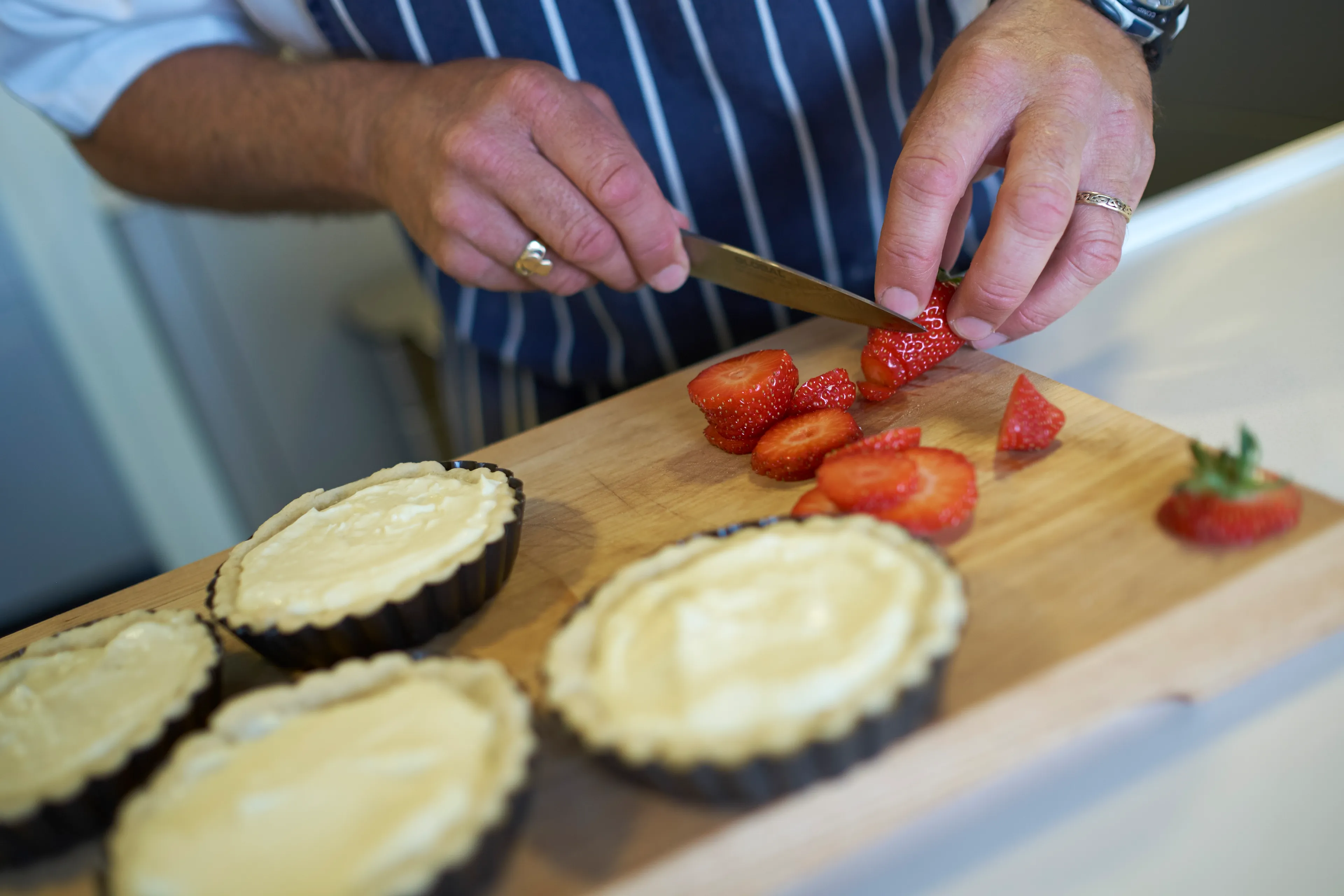 Apart from a good set of knives? You have to have a good head on your shoulders, be focused and extremely well organised. Personally, I like seafood and doing a lot of pan work. Excellent induction pans are essential: I buy a new set every year because you don’t want things sticking when working under pressure.