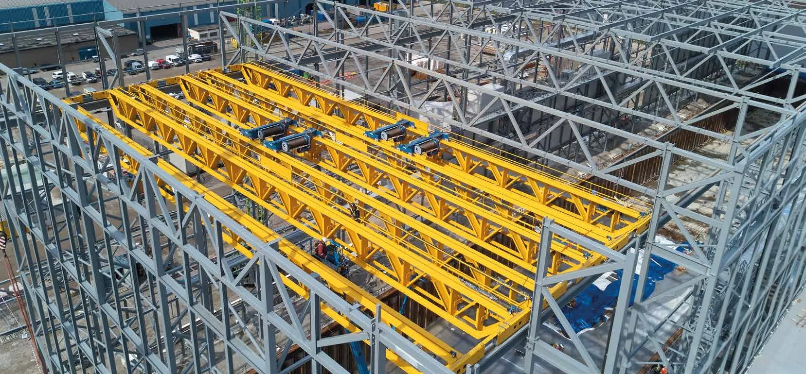 The construction hall has three V-type overhead cranes with a span of 36.65 metres and a capacity of 2 × 12.5 tonnes each. Open-truss beams make the cranes lighter than standard versions, exerting less pressure on the building structure. They’re also 50% faster, offering major savings over time. Frequencycontrolled hoisting motors allow for perfect precision – a key issue given each crane can lift 25 tonnes. The two hoists on each crane can be used individually or in fiftytonne tandem, synchronising the hoist rpms and safety circuits. The size of the cranes meant they had to be fitted in the short time window available between completing the hall walls and placing the roof: this was achieved using two mobile 250-tonne hoisting cranes.