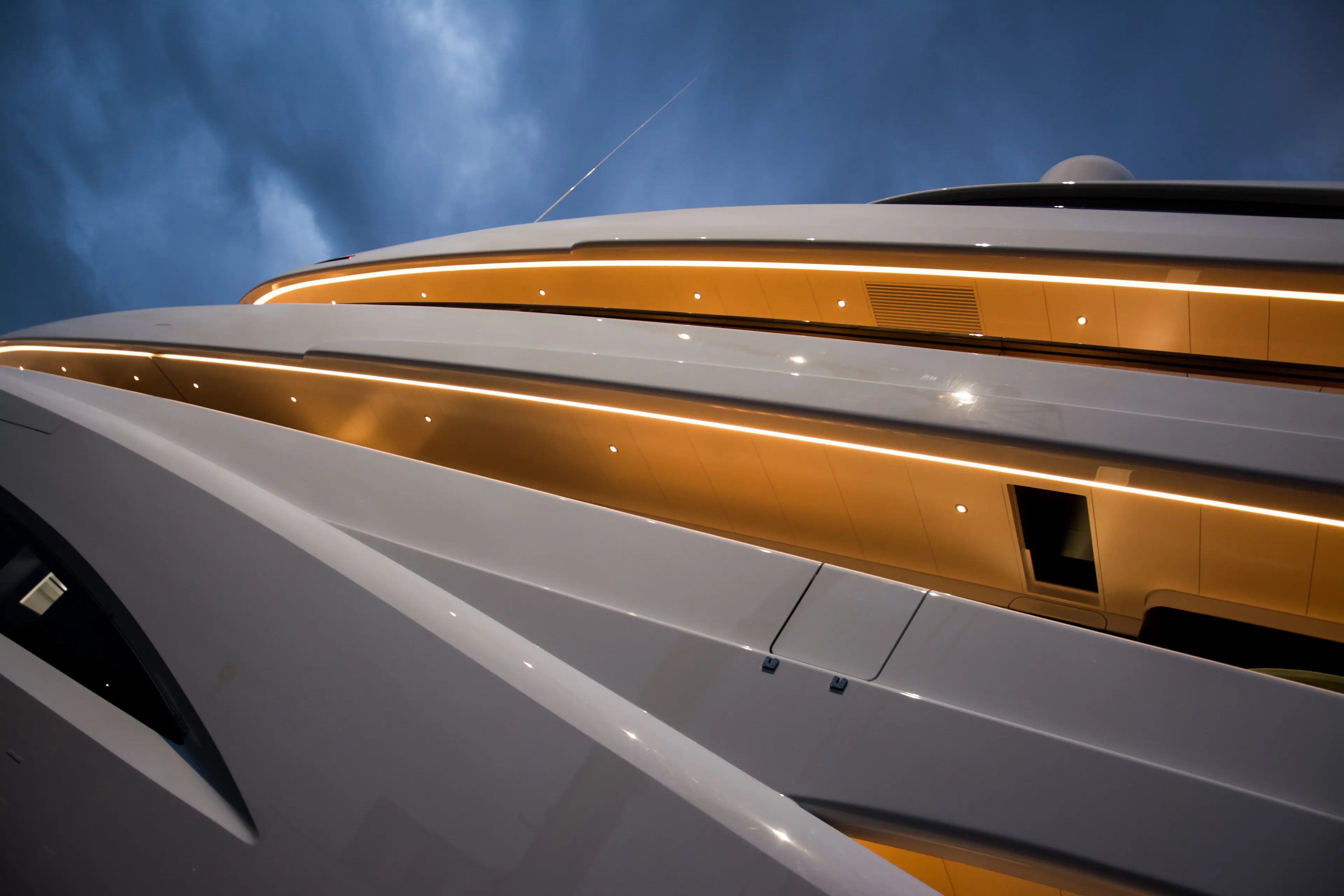 Hidden behind her super-elegant exterior profile are some amazing features including a 42,000-litre swimming pool which forms part of the beach club ceiling, and an awesome forward-facing owner’s stateroom with a three-metre-high skylight ceiling above the bed.