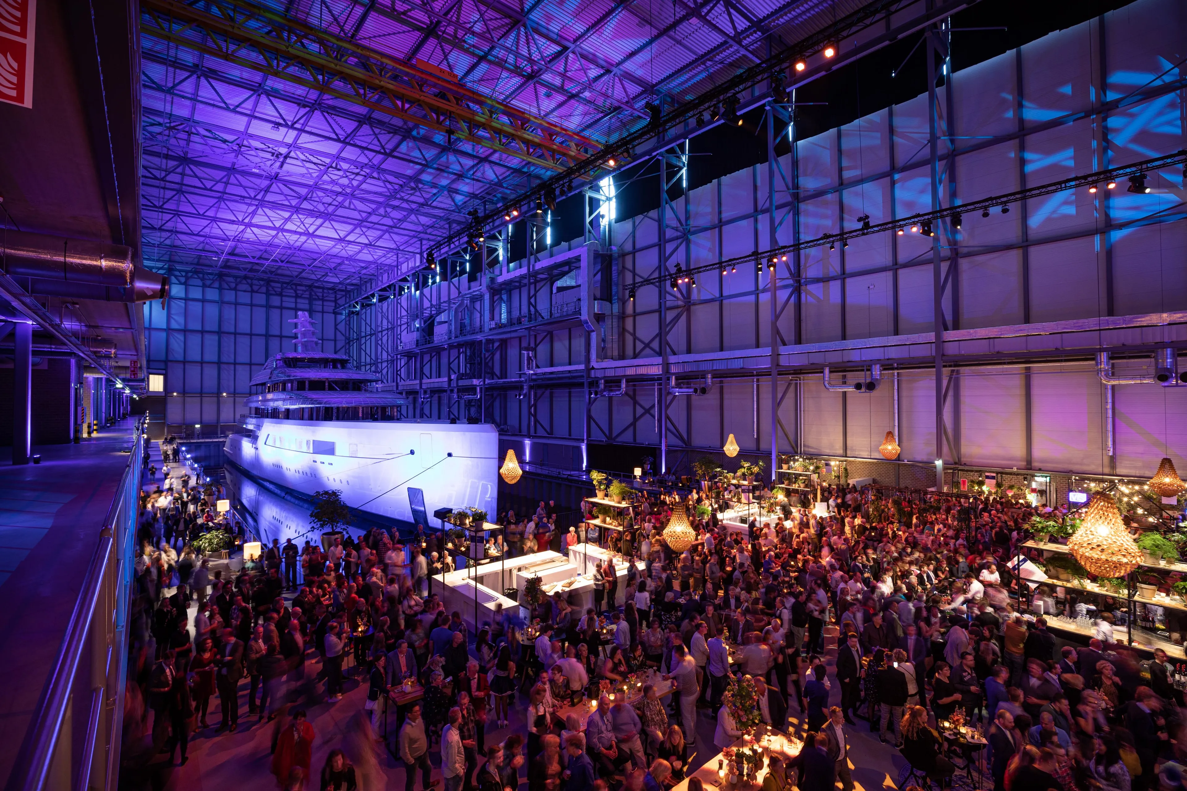 This fourth Feadship facility in the Netherlands is now going to build and refit Feadships of up to 160 metres in length. Measuring a mighty 425,000 cubic metres – it’s quite the experience to step into the main building for the first time – this is the most eco-friendly superyacht yard in the world and the pinnacle of contemporary design. On this warm night in May, however, the giant construction hall had been converted into the coolest party venue in a city famed for having a good time, resplendent in a purple blaze of decoration.