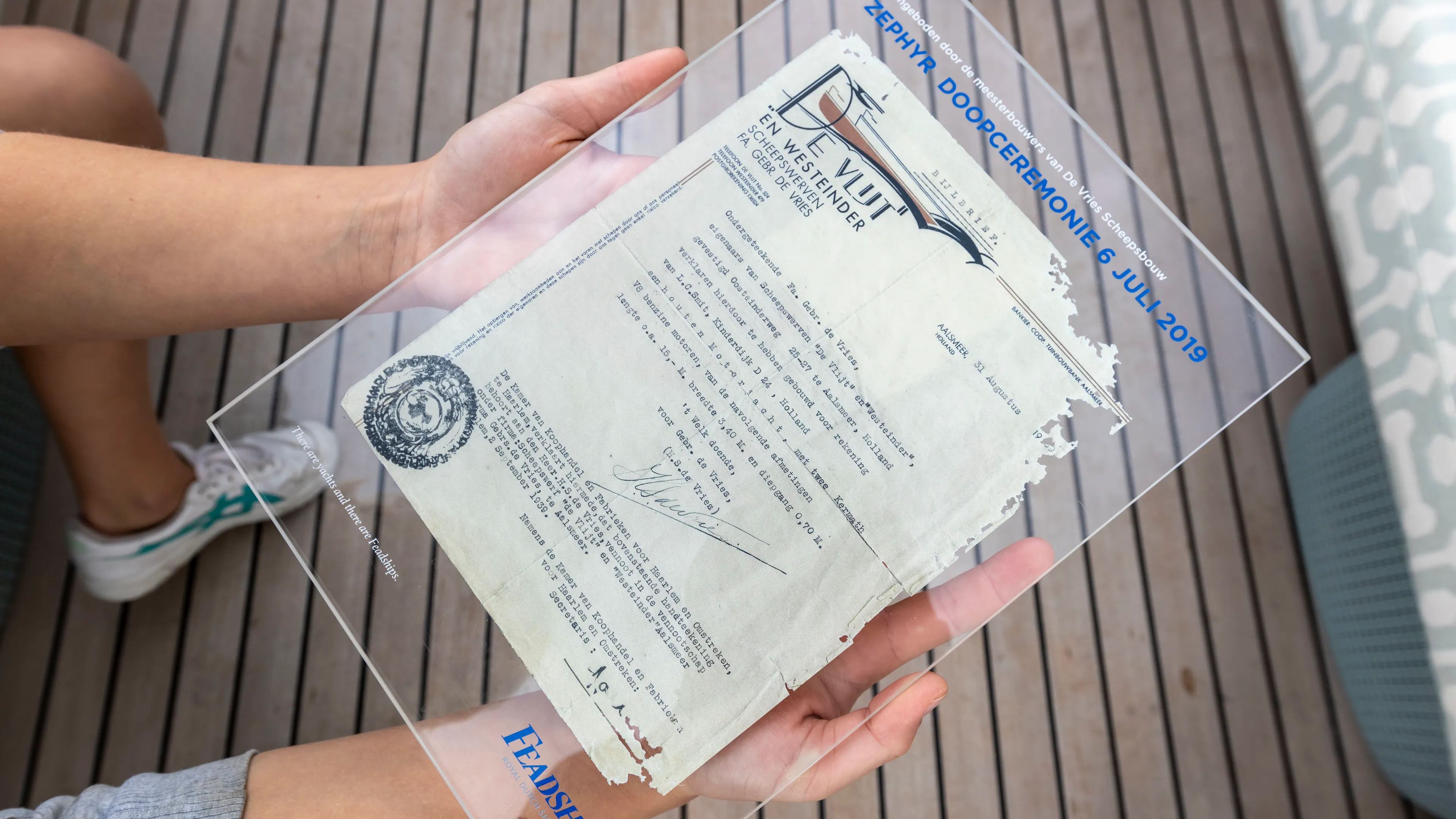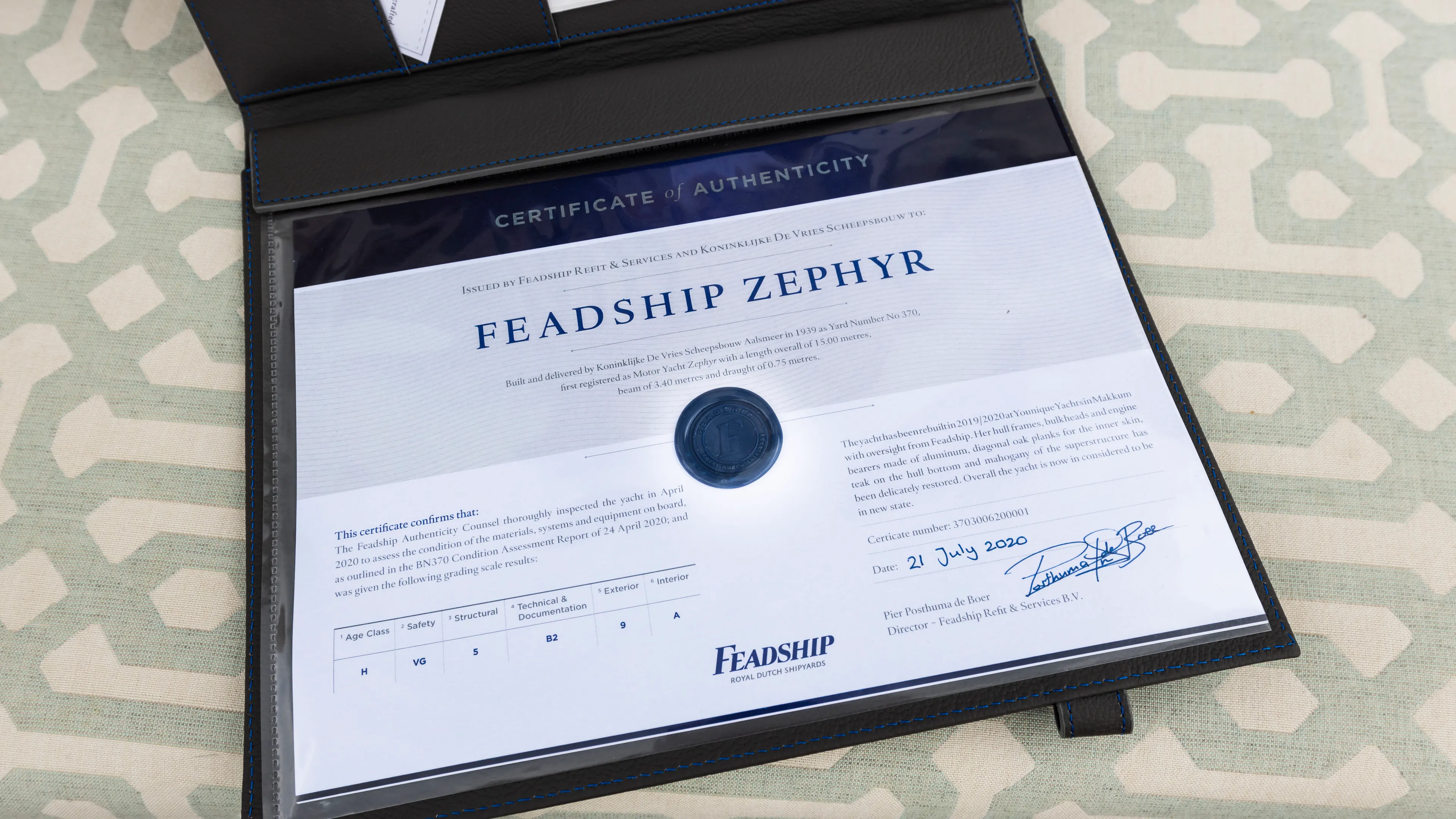 Feadship is delighted to present the owner of the recently rebuilt Feadship Zephyr with a Feadship Authentication Certificate. The motoryacht, relaunched in 2019 after an exhaustive restoration project, is the first member of the Feadship Heritage Fleet to be granted this ultimate proof of premium Feadship quality.