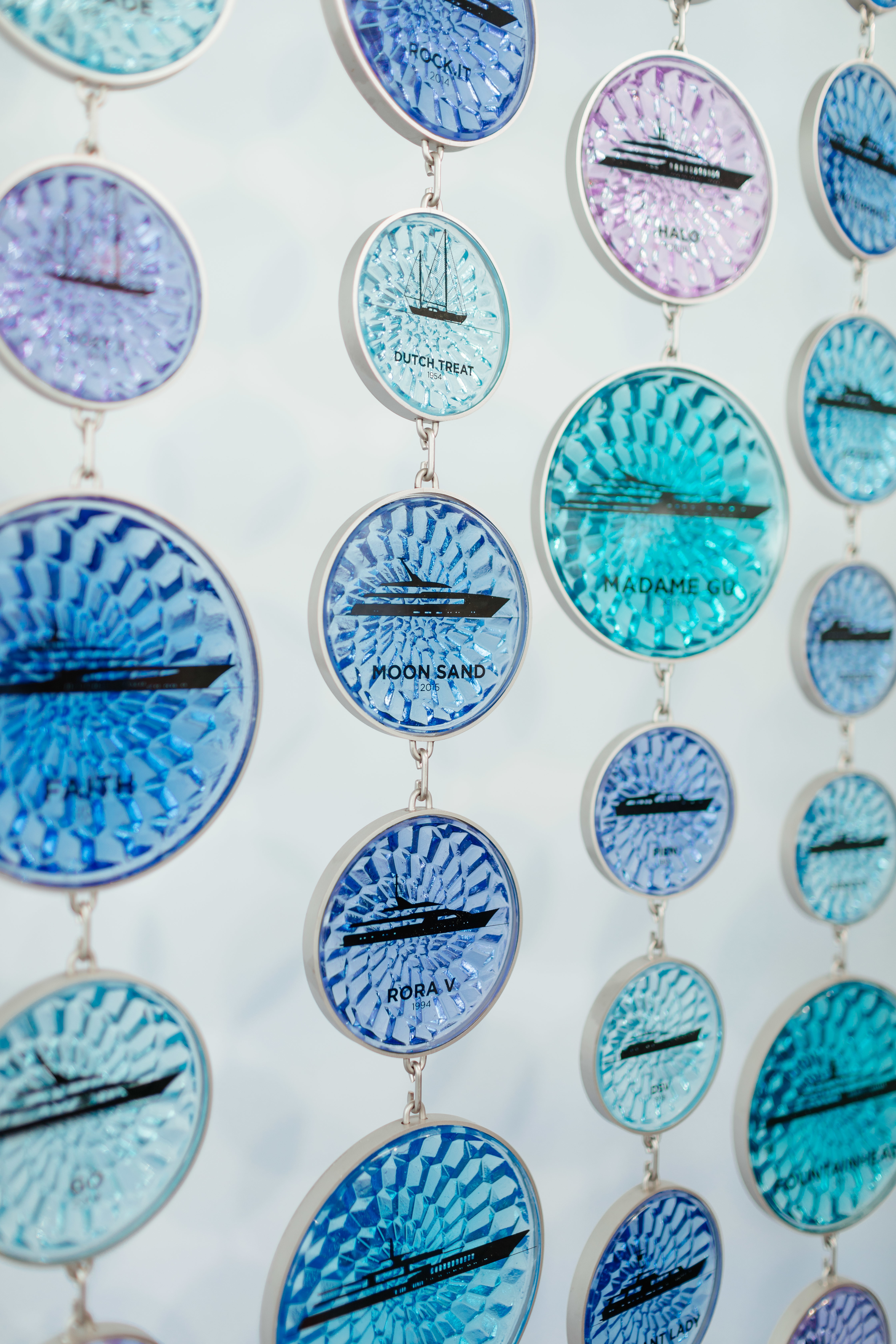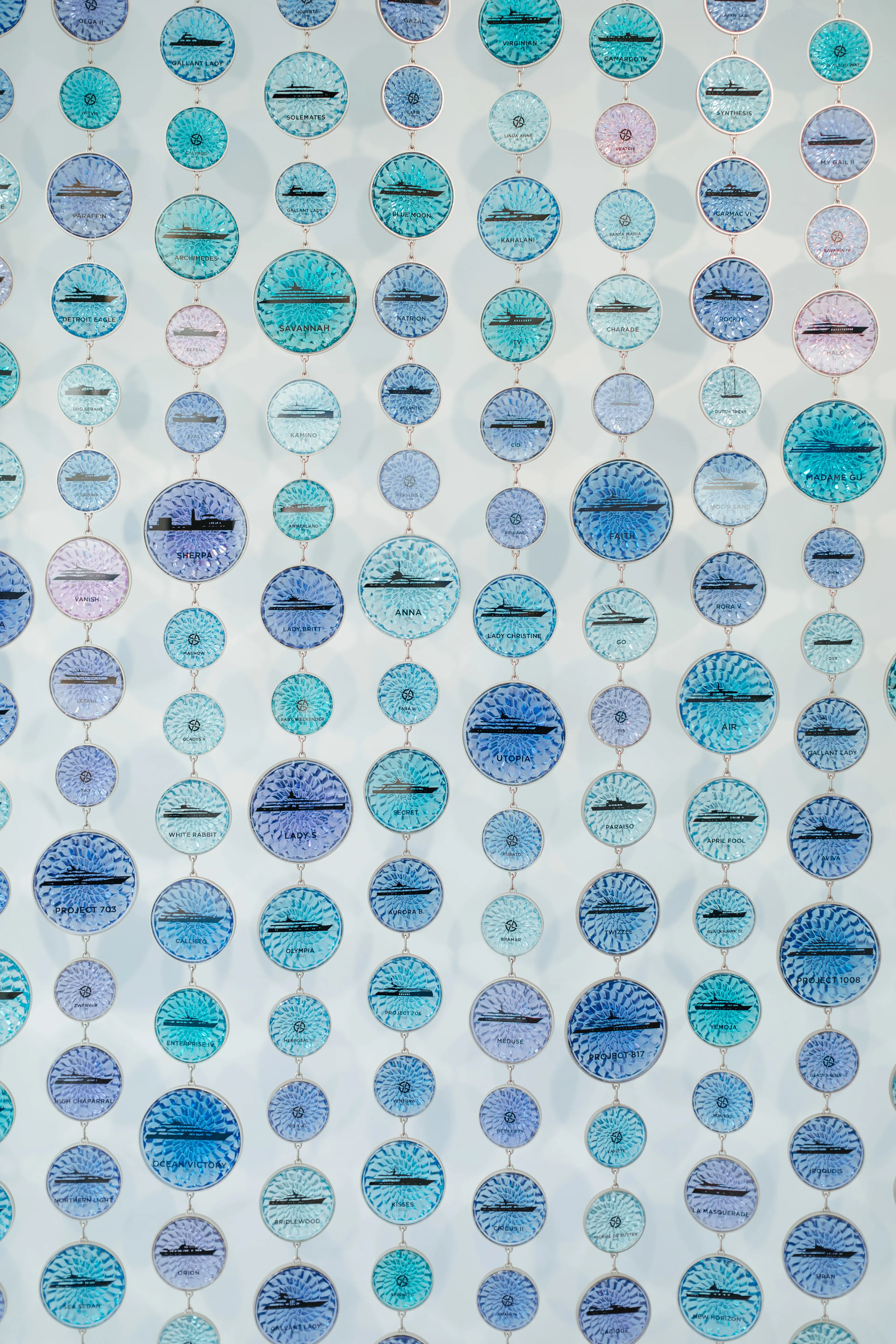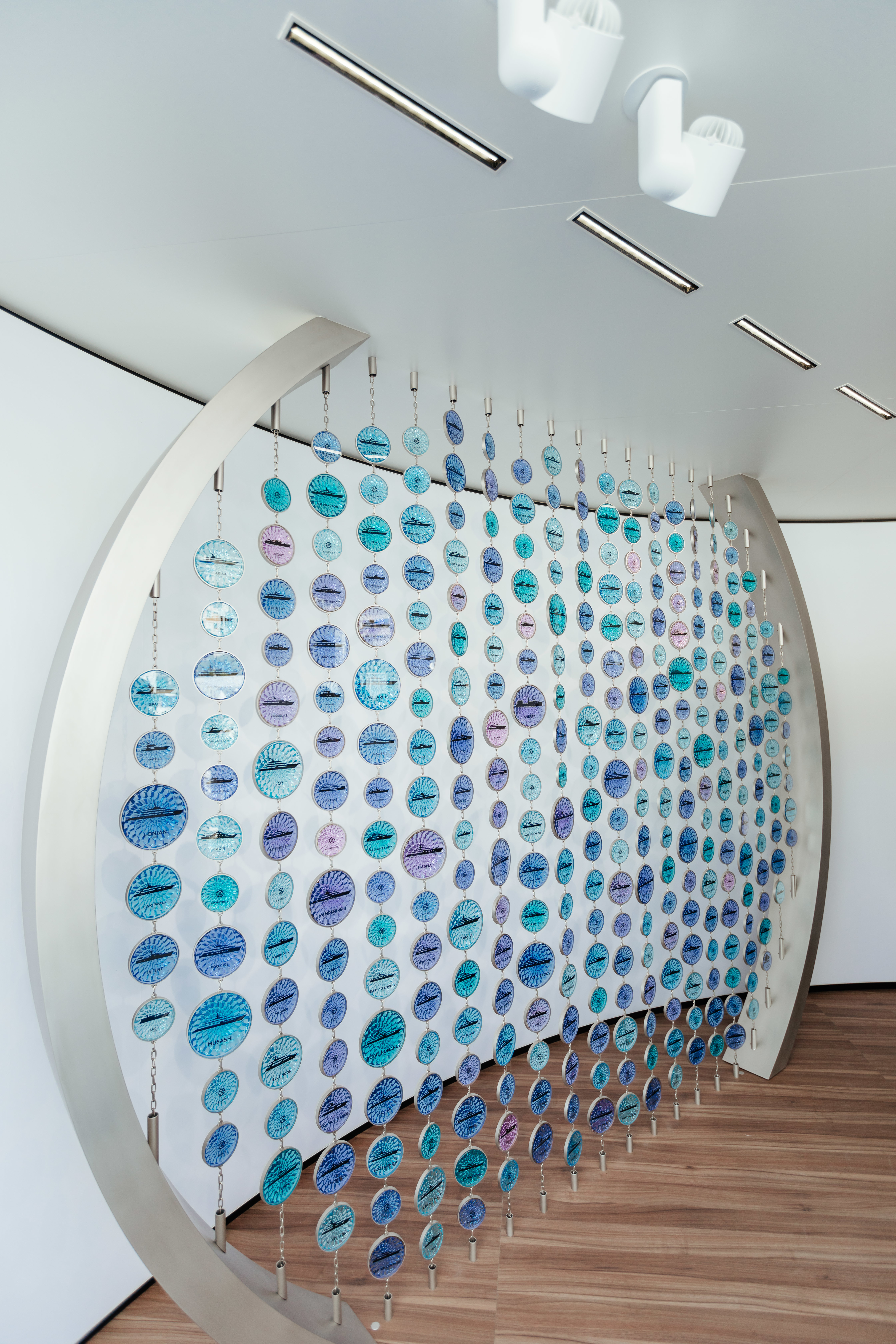 The product of many months of design and development, the display comprises hundreds of individually pressed pieces of circular glass, each containing a Feadship profile that was screen-printed on the glass by hand. A kaleidoscope of colours and gradations reflects the changing hues of the water as seen from a moving yacht, while the different sizes represent the various dimensions of Feadships.