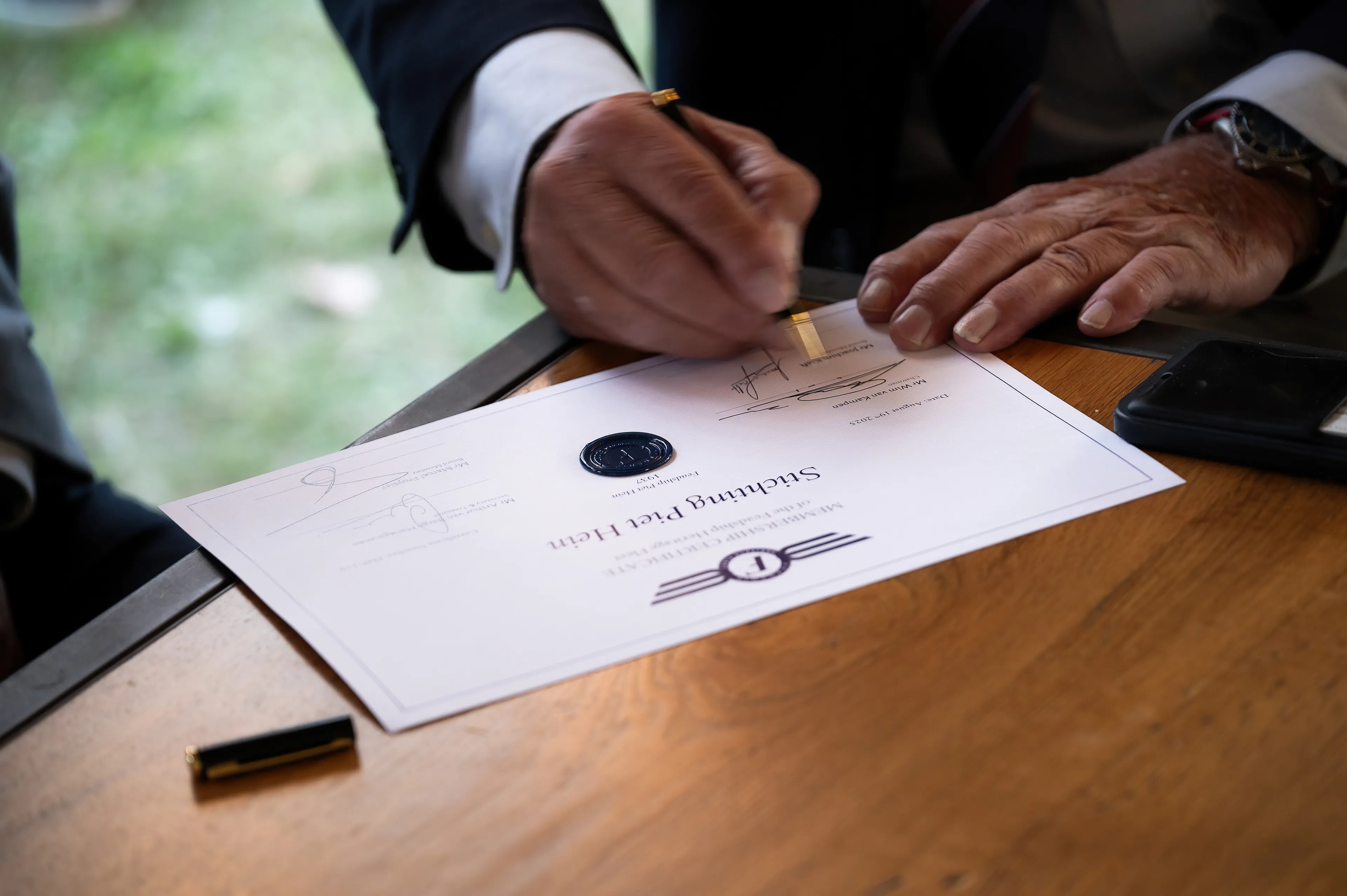 Representing SAIL were Chairman Mr Woltering, Treasurer Mr Parmet, Mr Stunnenberg (board member), and Adjutant Mr Soetendaal. The Piet Hein was represented by Vice-Chairman Mr Post and Secretary Mr Kodde of the namesake foundation.
