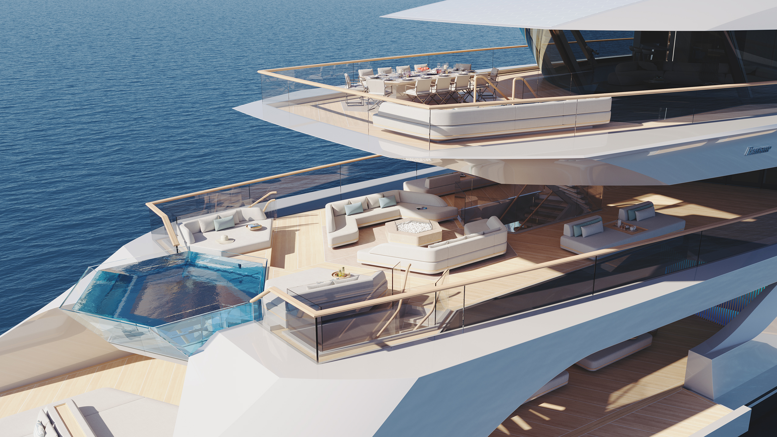 Leading this year’s Concept Design team, senior designer Ruud Bakker shared the inspiration for the 2024 concept, which included experiencing the Amsterdam diamond cutting workshop of Gassan Diamonds to learn how the facet patterns draw light into the stone, reflecting and magnifying it. Also inspiring were examples of cutting-edge architecture with zero boundary facades blurring the line between indoors and out. The designers used these concepts to amplify guest contact with the sea, a relationship that owners note sadly tends to fade as yachts get larger.