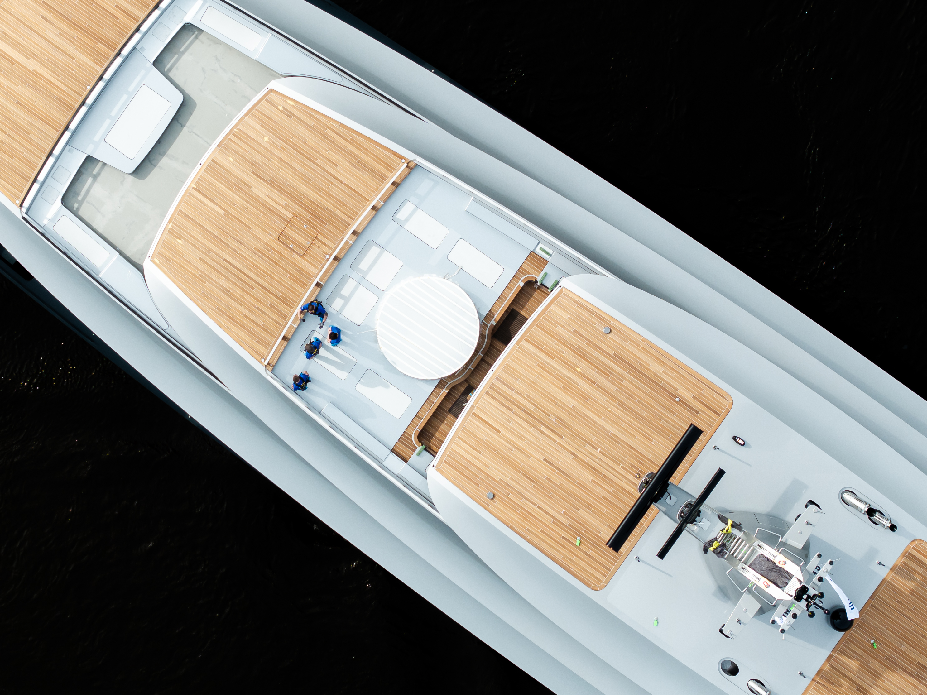 At 165m2 Project 826 debuts the largest beach club on any Feadship to date. Her open-plan layout is on two levels: a recessed and cosy, low-slung lounge with casual seating and a bar dominates the centre. A few steps up, a wide perimeter level links massive, teak-covered hatches that fold out to become terraces 700mm over the sea. The beach club’s 180-degree view is almost seamless due to the lack of bulky hull structure framing the doors. Feadship met the design challenge to maximize the views and minimize blind spots by initiating innovative new design and engineering that houses the powerful gears for opening and closing the hatches within the doors themselves, instead of inside thick hull sections and stern pillars. The result is an openness of space that is a perfect match to the overall lightness of the profile. With dappled light filtering through the glass-bottom pool above, the beach club will be like an island oasis.