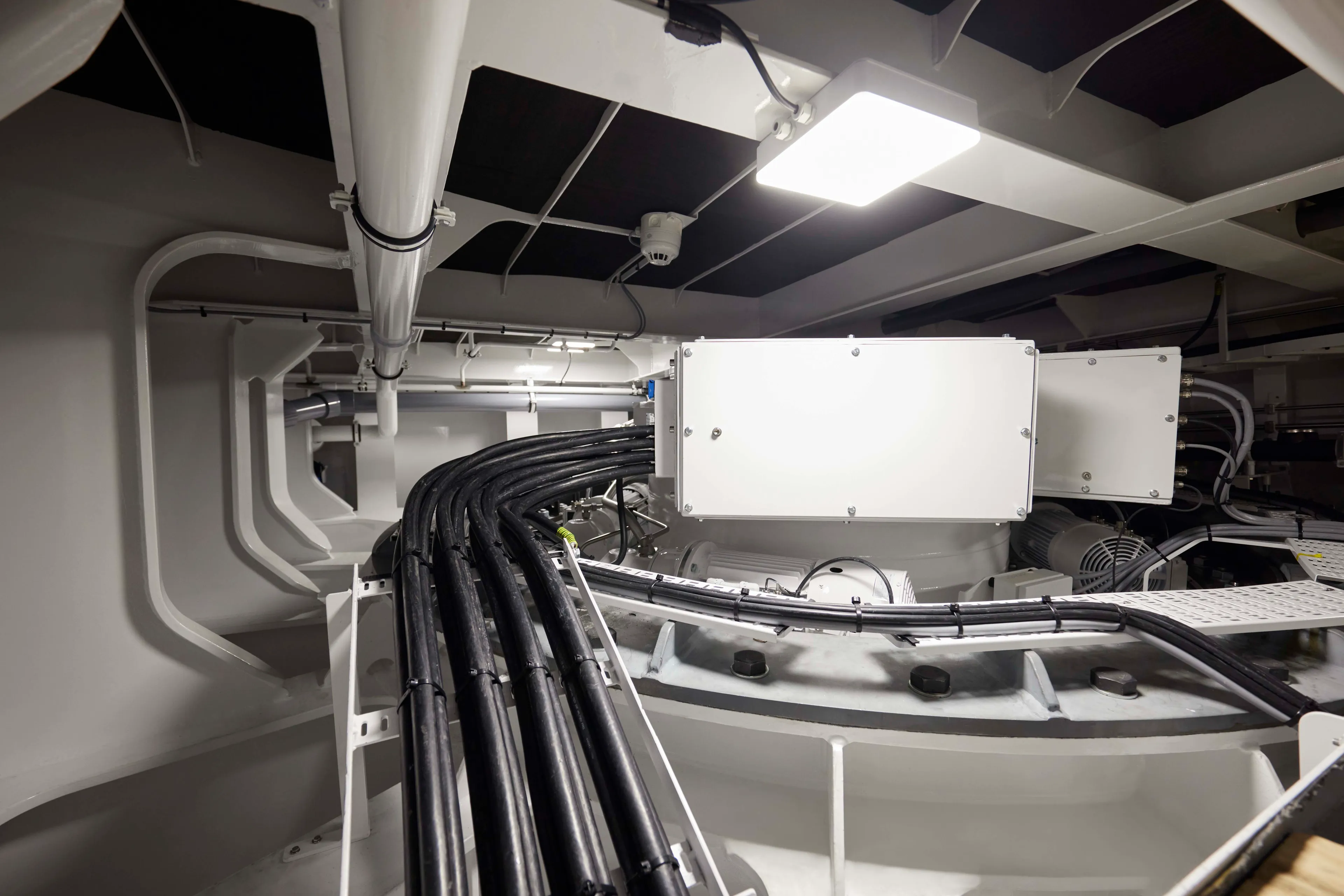 Powering it all is a 4.5 MWh battery bank that is charged by four generators — two large and two small, custom, variable speed units based on tweaked CatC32 engines with permanent magnet alternators that deliver power as needed. Where Savannah and Lonian – which launched in 2018 – operated on 560 volts, the DC system on Obsidian is a staggering 1,000-volt system because the yacht is fully powered by electricity. A total of 560 battery modules are housed in a special chilled room amidships on the tank deck, revealing another benefit of the hybrid system: The components no longer need to be adjacent. The thrusters are in the best location for steering and water flow, while the generators and their exhaust systems, batteries, and electrical switchboard are located elsewhere for optimal weight distribution and crew access. Obsidian should be able to cruise for 35 nm at 10 knots on batteries alone. At anchor, the batteries will provide silent operation for 10-15 hours.