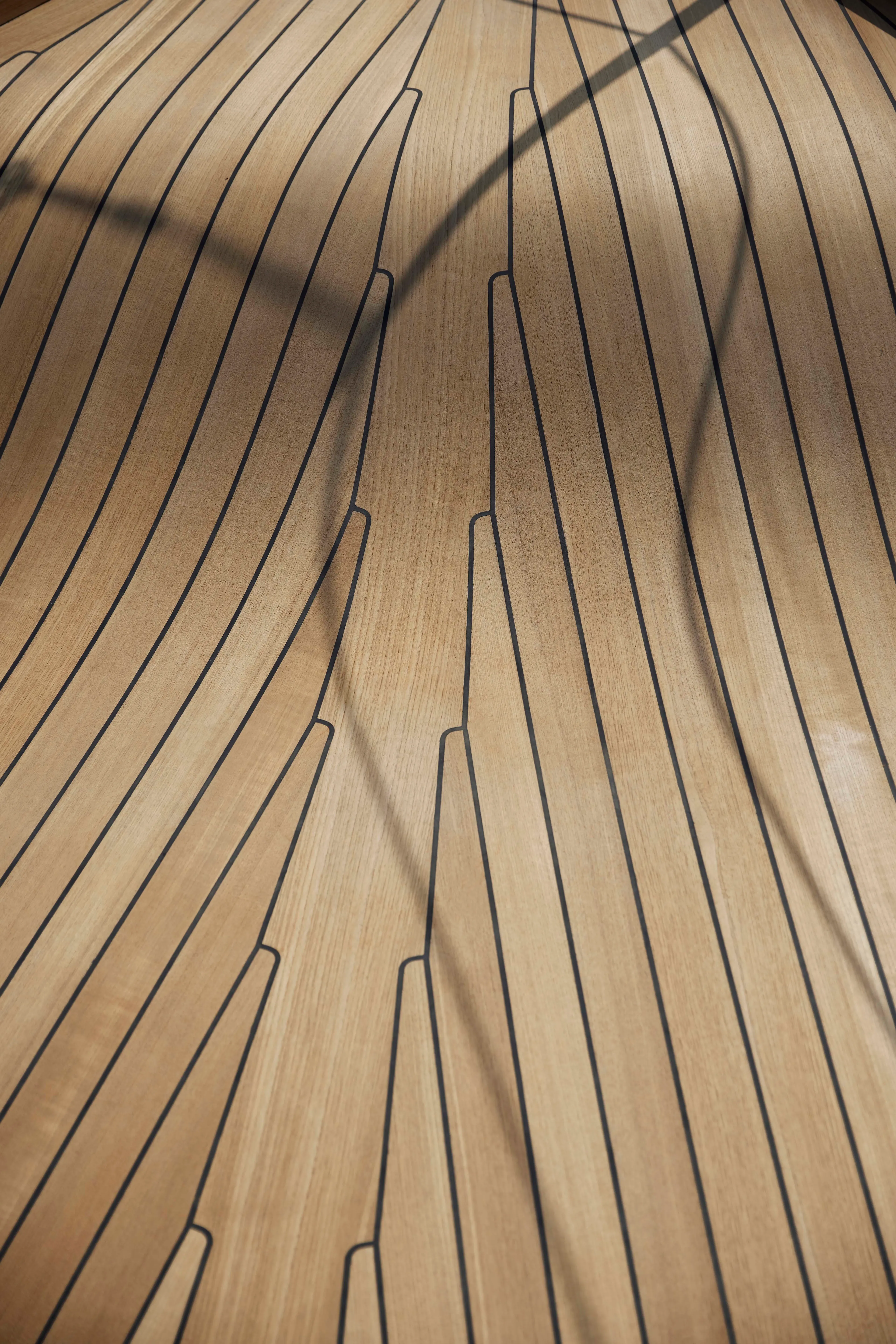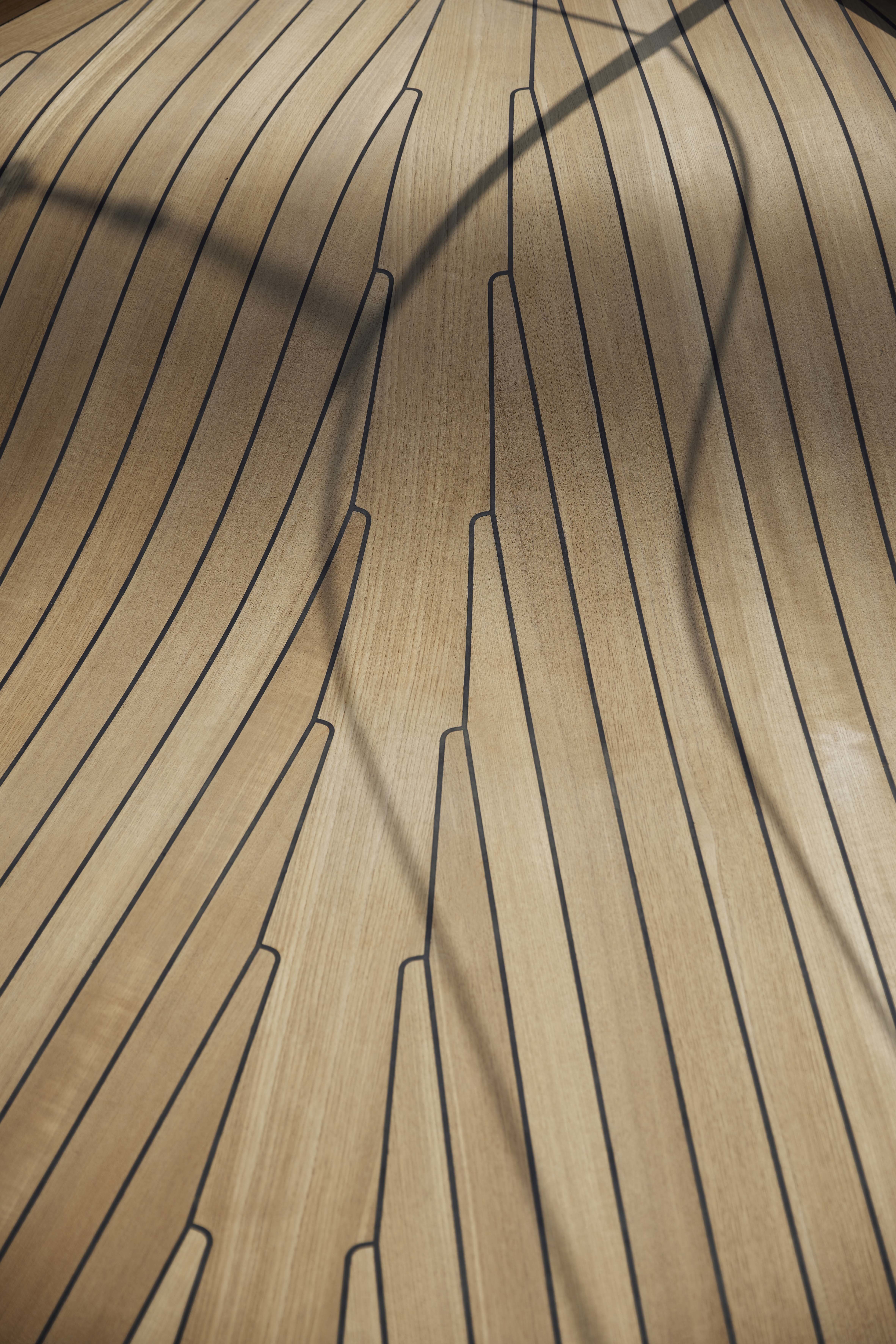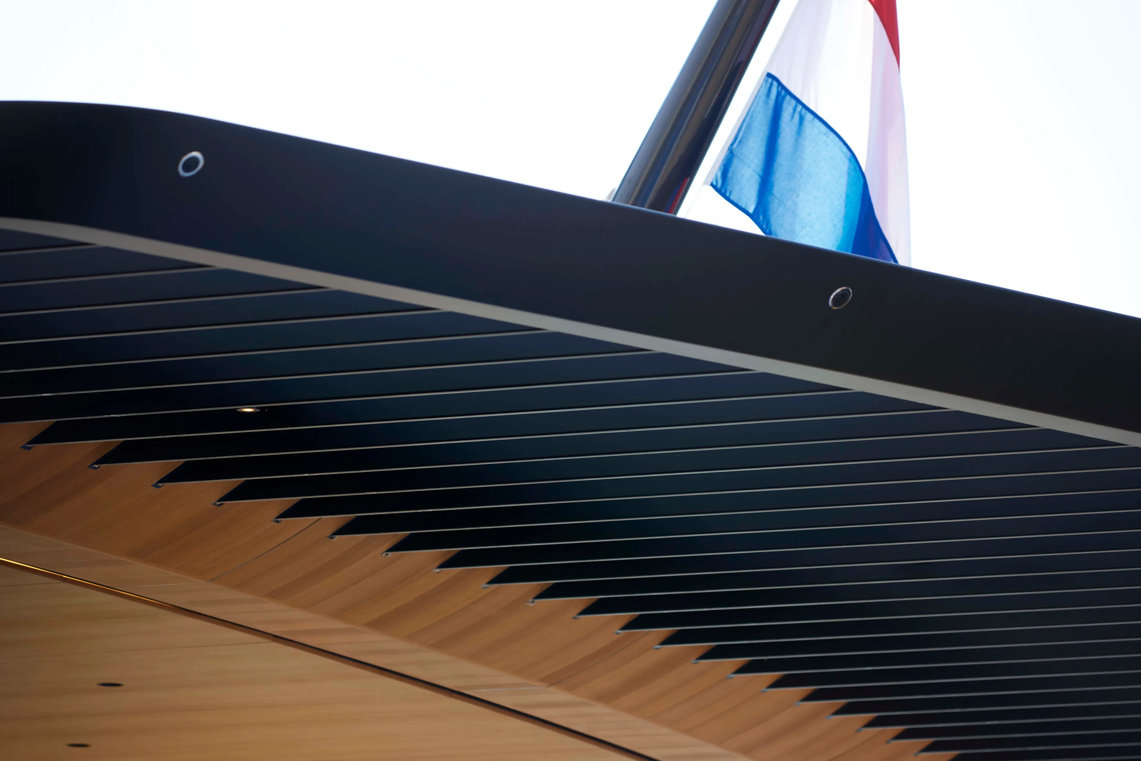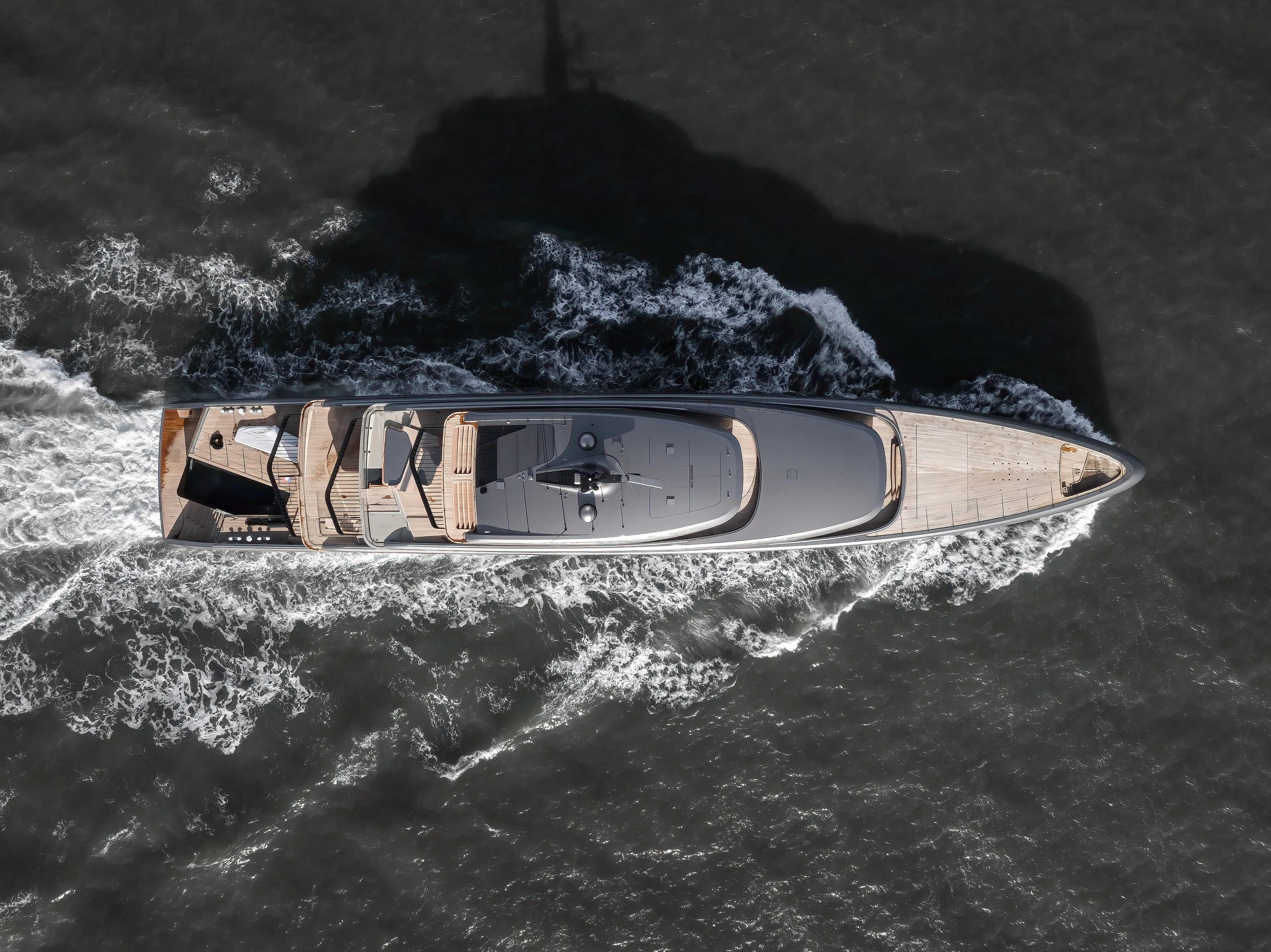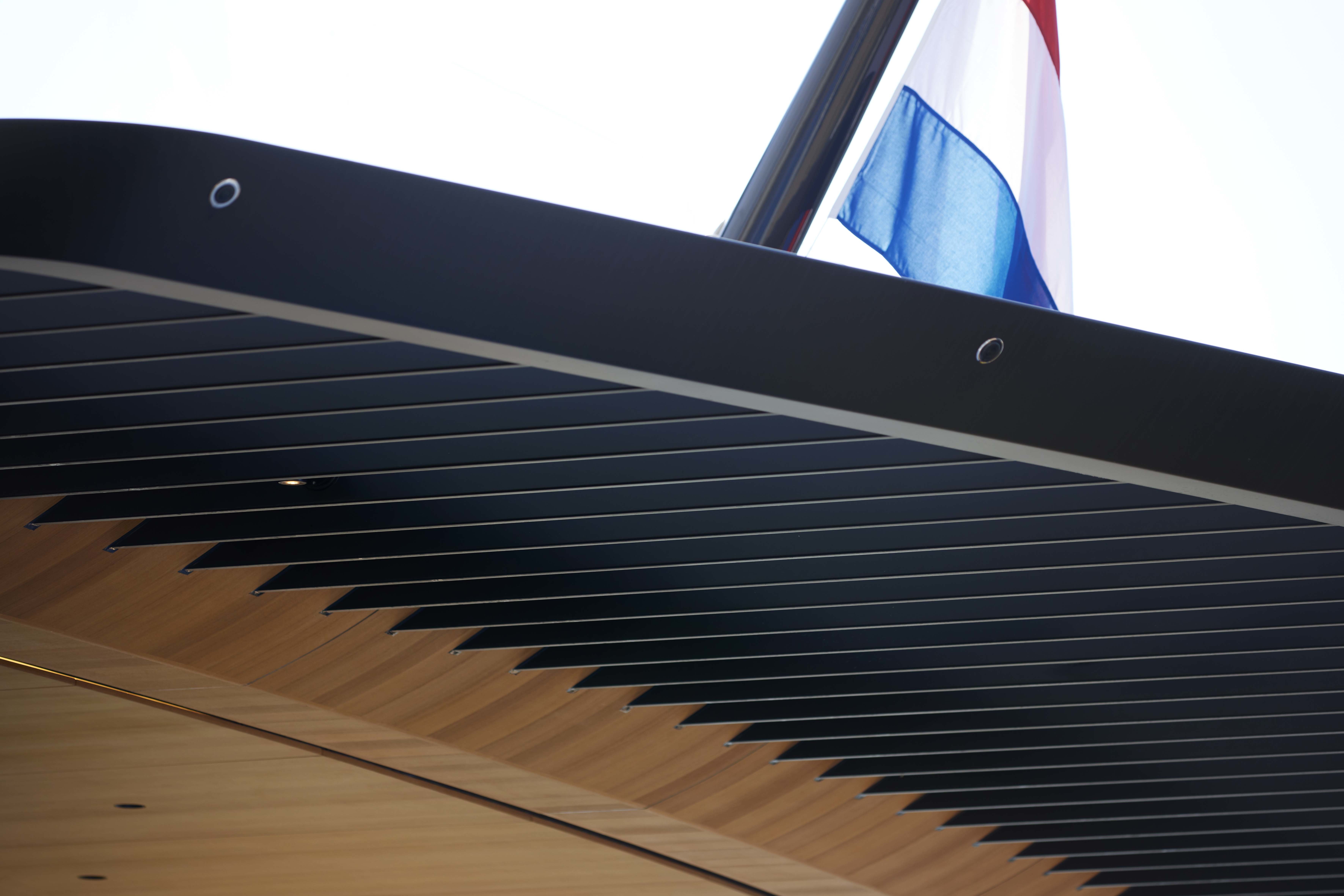 Because the path to carbon-neutral superyachts goes far beyond a single solution, Obsidian also involved fresh approaches to the hull form. De Voogt’s naval architects created the low, slim hull, optimized at cruising speed using computational fluid dynamics (CFD) with the final form being made into a model tested in a towing tank. Complex engineering for balance and weight reduction includes new applications for carbon fibre. The louvered aft deck overhangs, for example, are all carbon fibre attached to the aluminium superstructure and require no support pillars. This weight benefit also offered new deck layout possibilities.