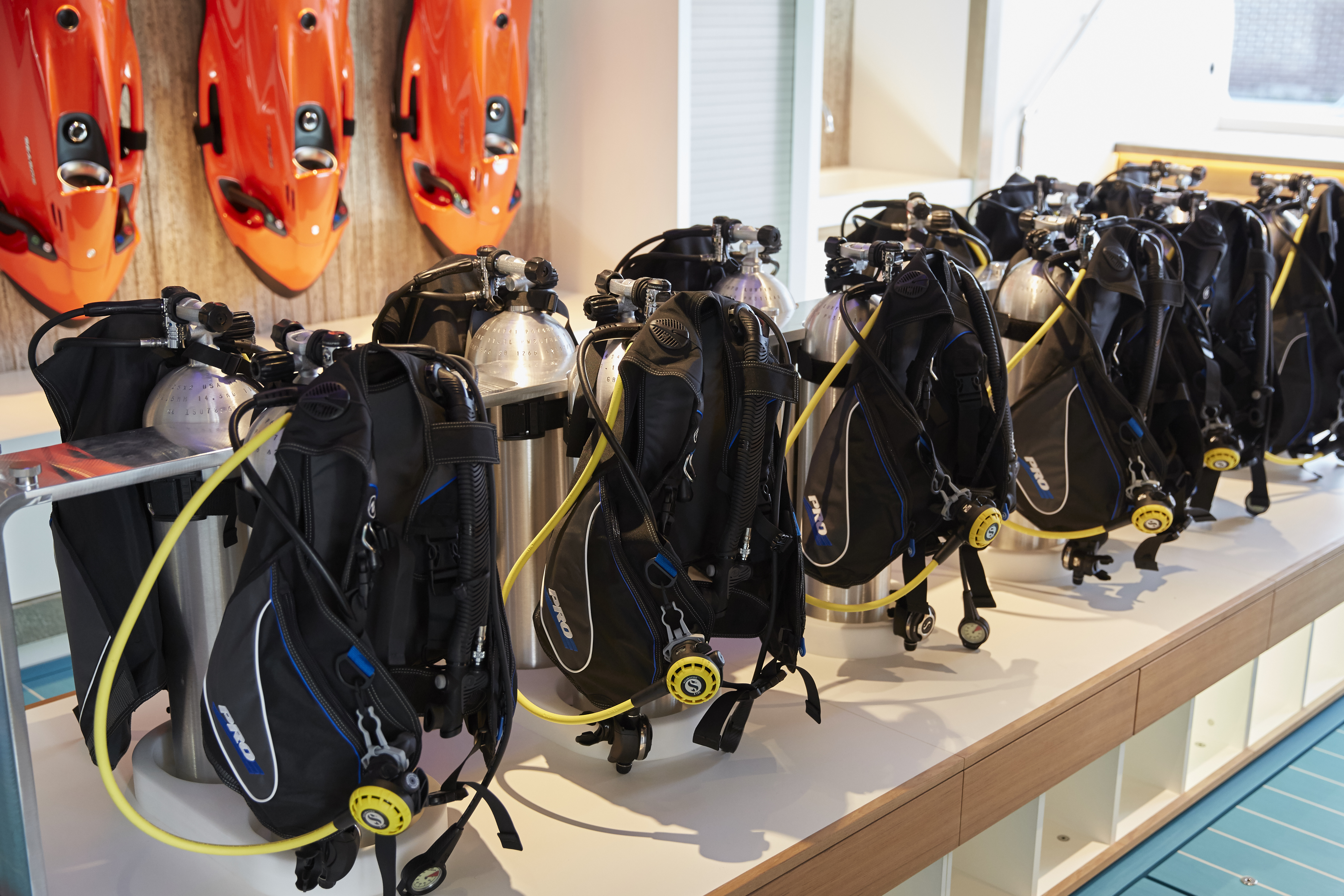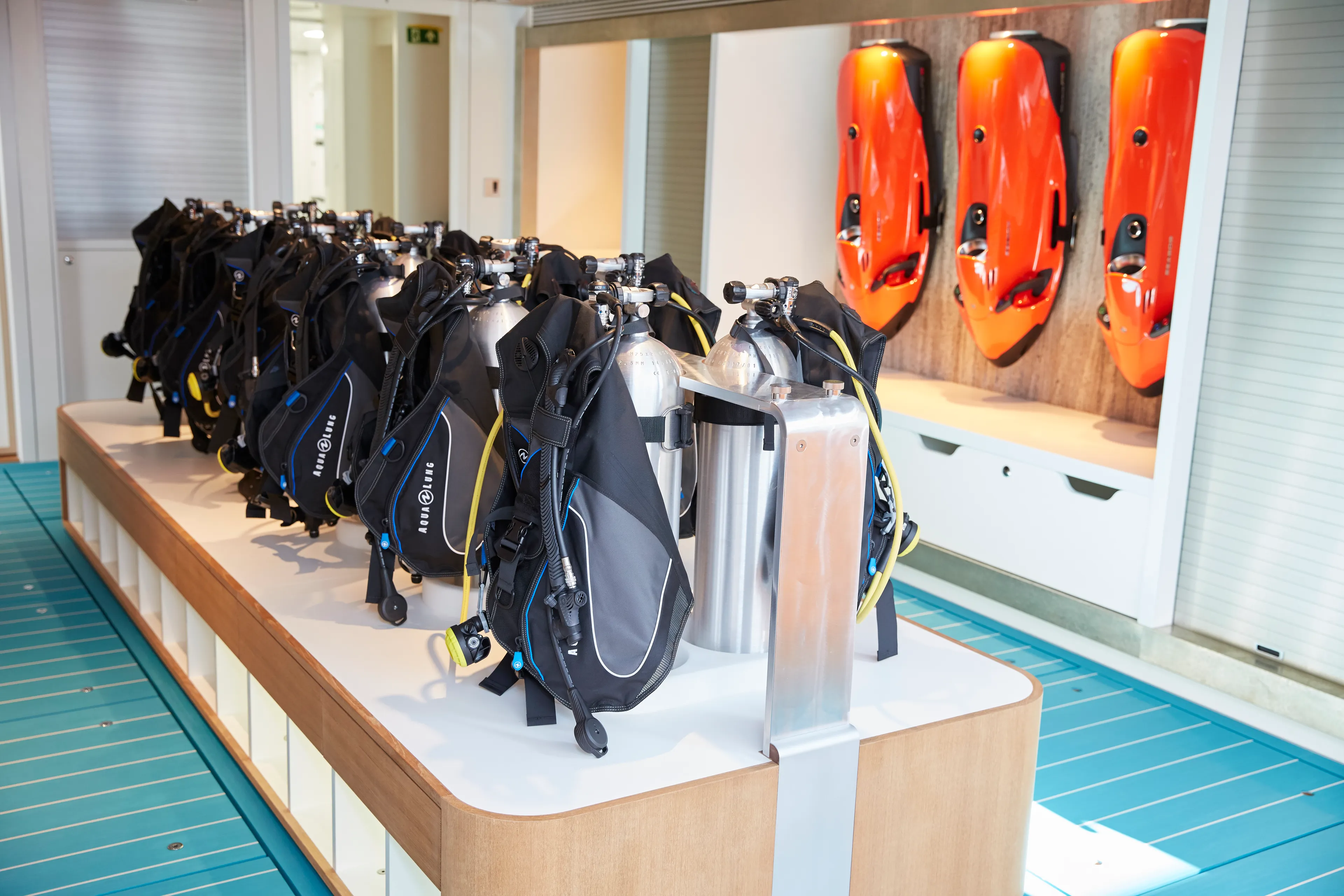 Lots of thought has also been given to the divers’ return to the yacht. The main deck aft features a bespoke flat-bottomed plunge pool which will be filled with hot water to speed up post-dive recovery from the coldness of the depths. In a similar vein, all luxury areas on the yacht can be heated up to 30 °C rather than the normal 25 °C mark.