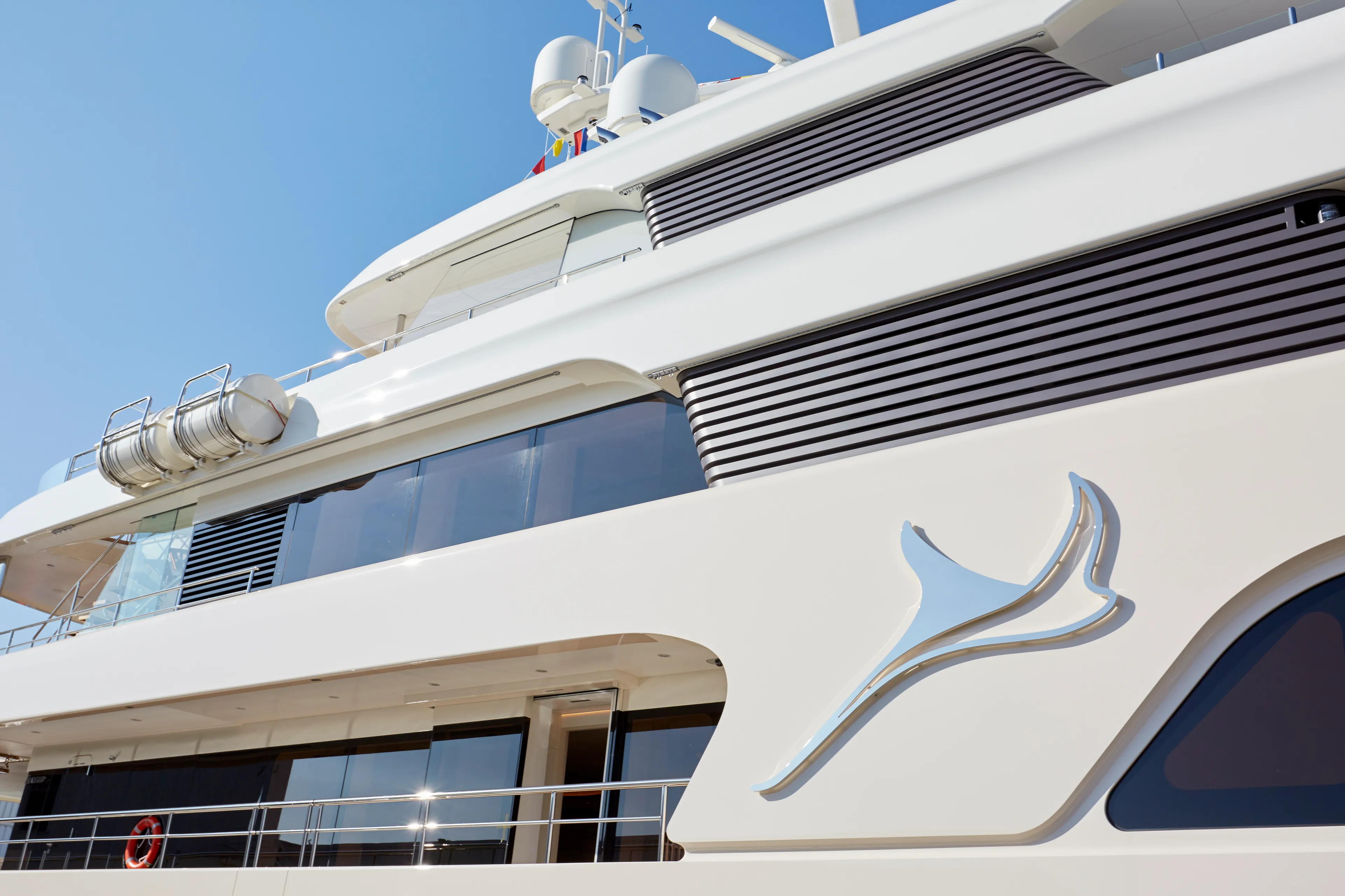 Samaya’s intriguing colour palette was a major part of this creation. The primary coating is a subtle lunar white, which reveals hints of a warm pink hue during the sunset hours and will truly come alive in the different shades of light found around the world. This scheme is offset by a teal-coloured waterline based upon the colour of a rare blue-green fish the owner once spotted on a diving excursion.