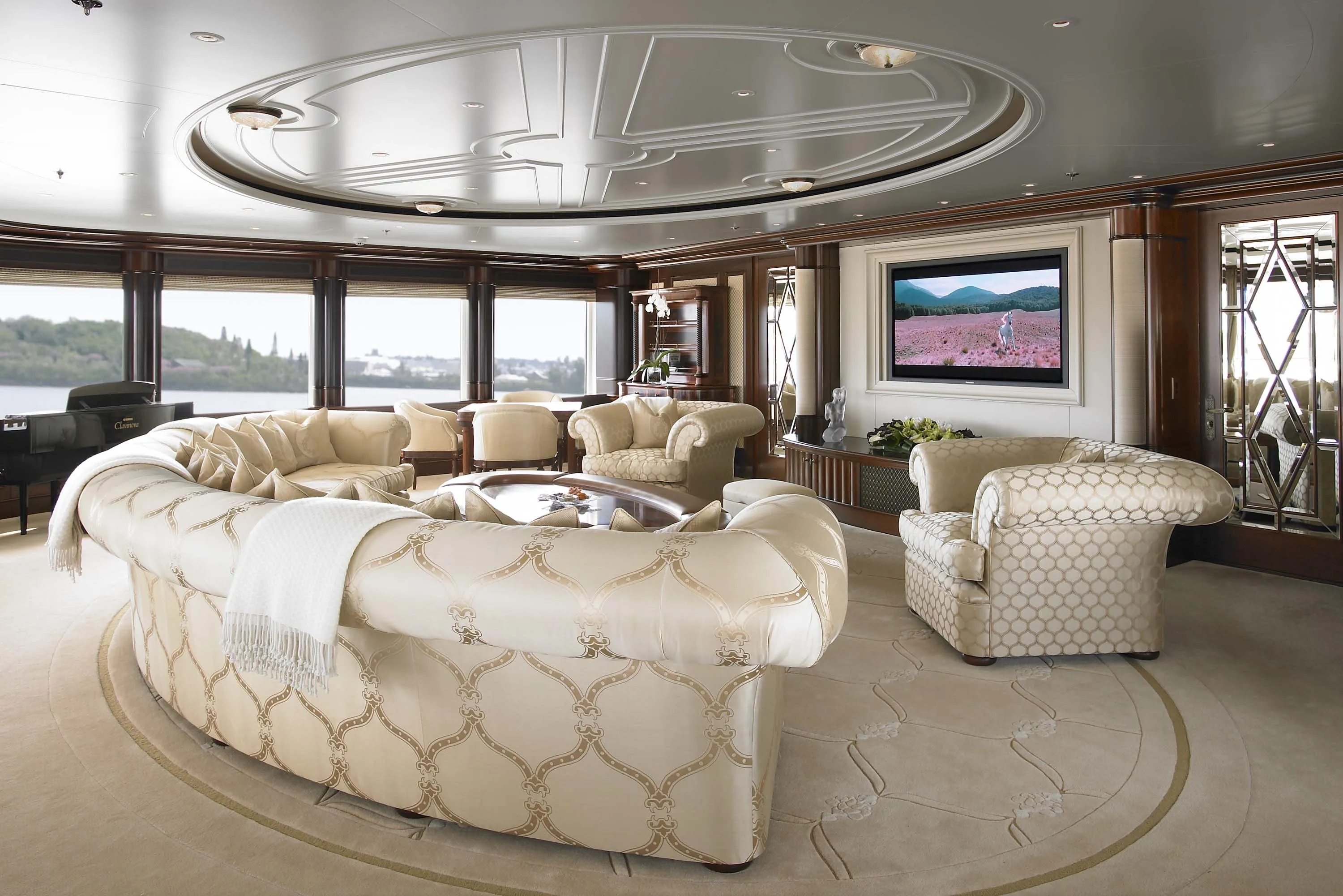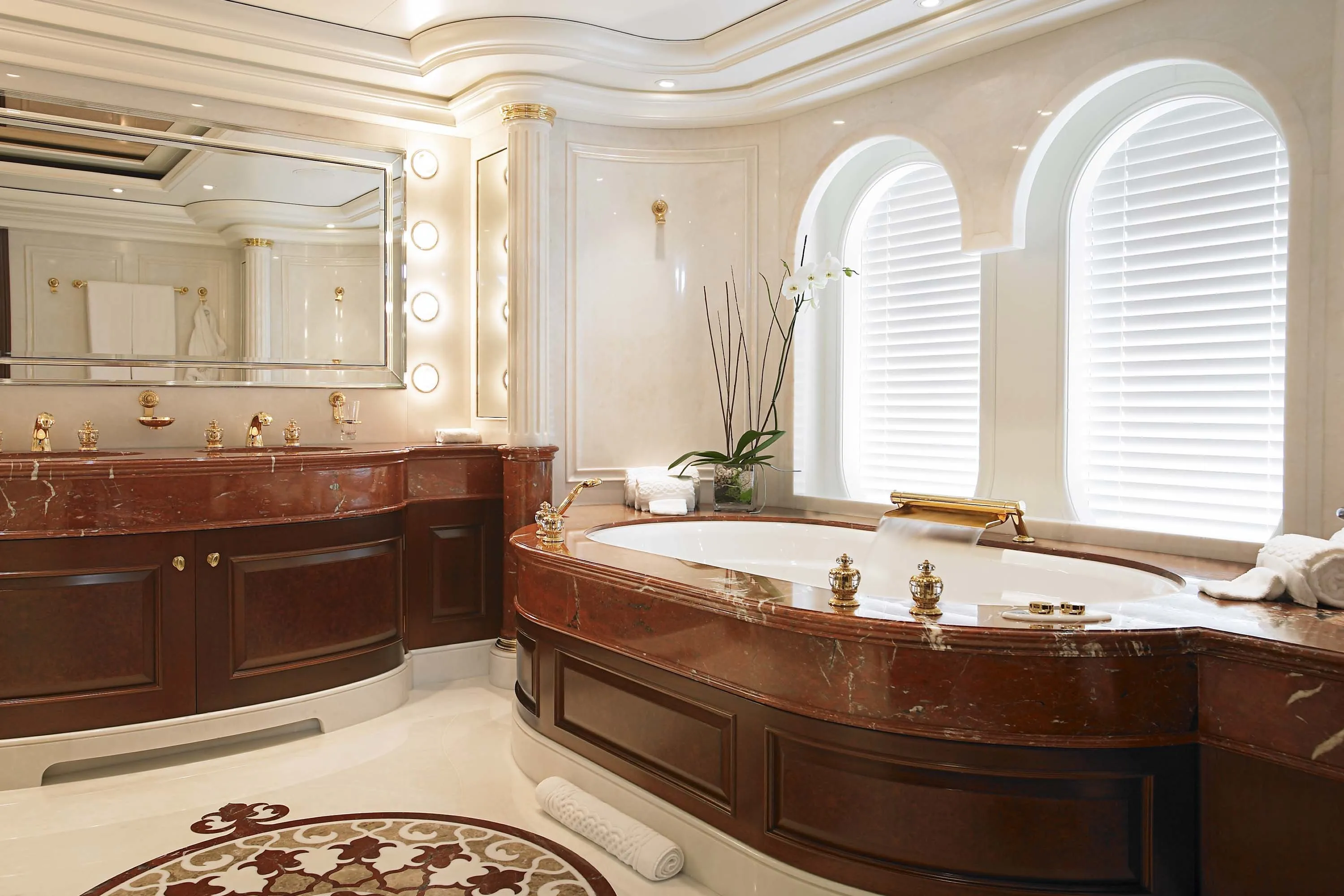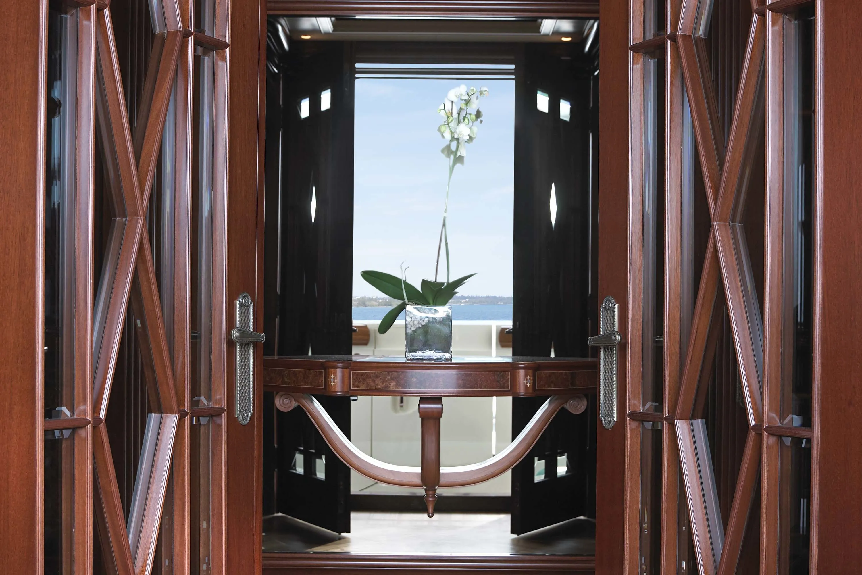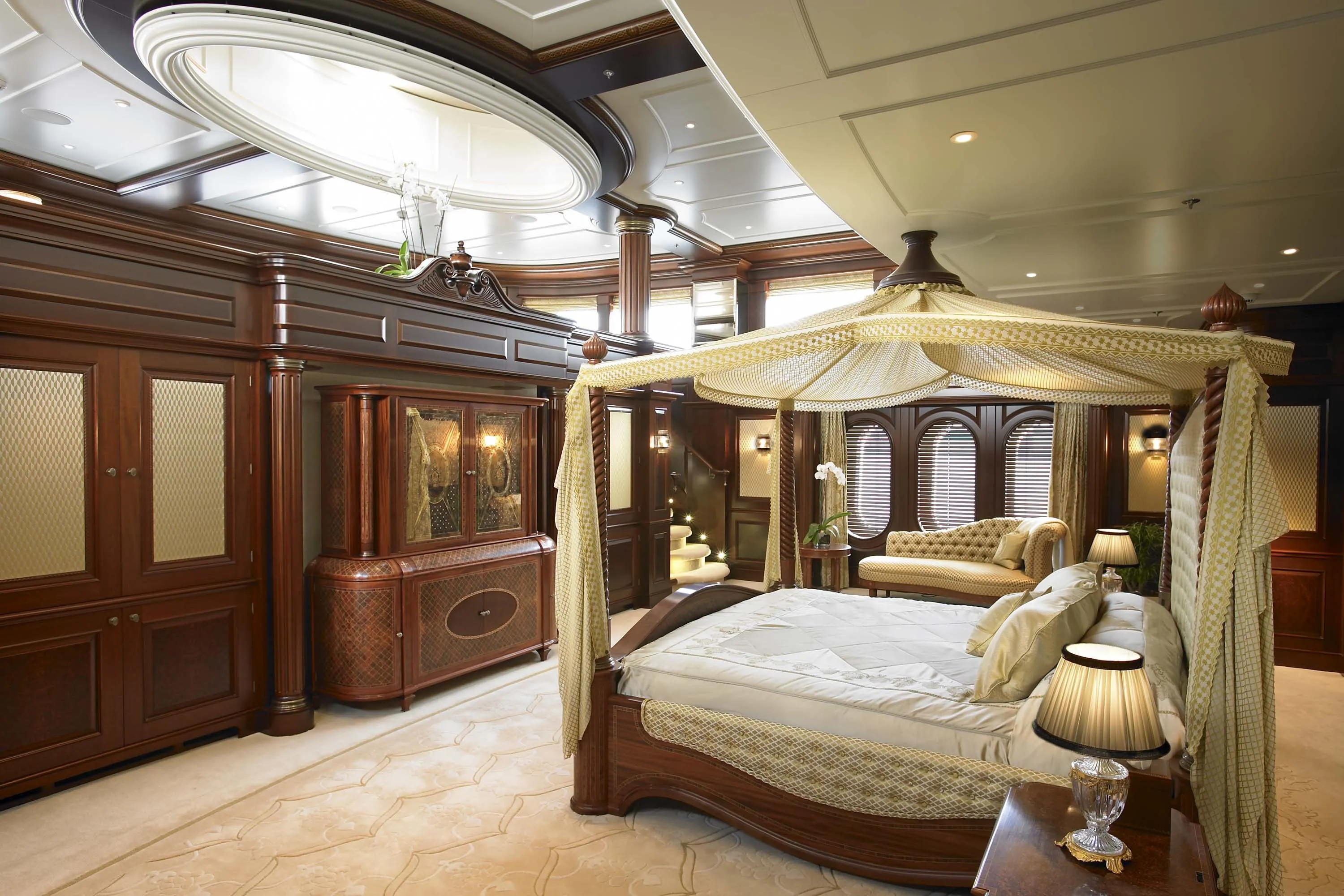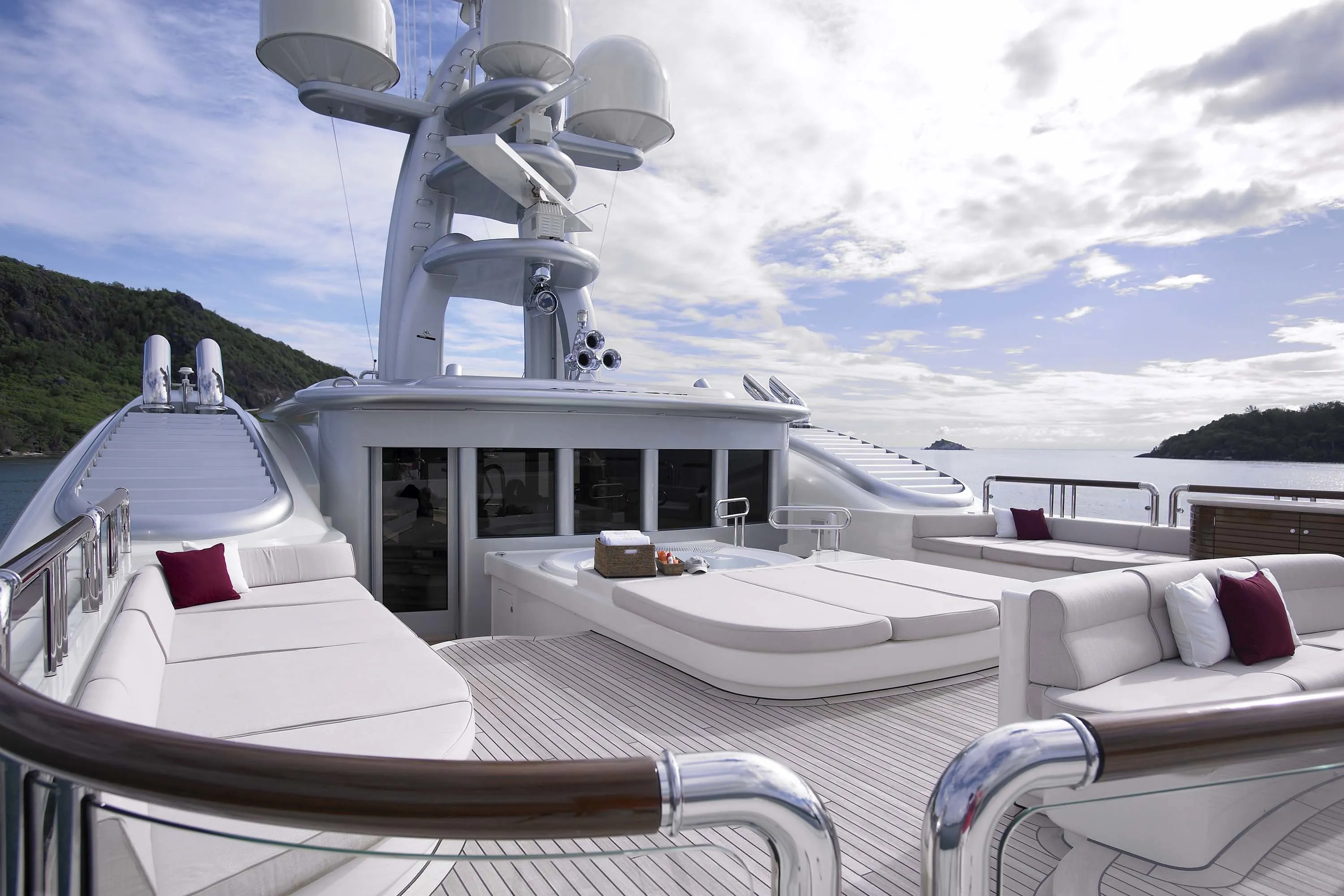 Anna’s timelessly modern exterior is unique in the way her style and layout were designed to accommodate keynote interior features required by the owner. Prime examples are the forward-facing observation lounge and the desire for a private outdoor area next to the master stateroom. The overall profile is sumptuously streamlined and the way her exterior colours are harmonised with those of the helicopter also set the standard for the fastidious attention to detail found throughout. In 2022 Anna returned under the name Firebird to the craftsmen who built her for an exhaustive refit, including an 2.50 metre extension.