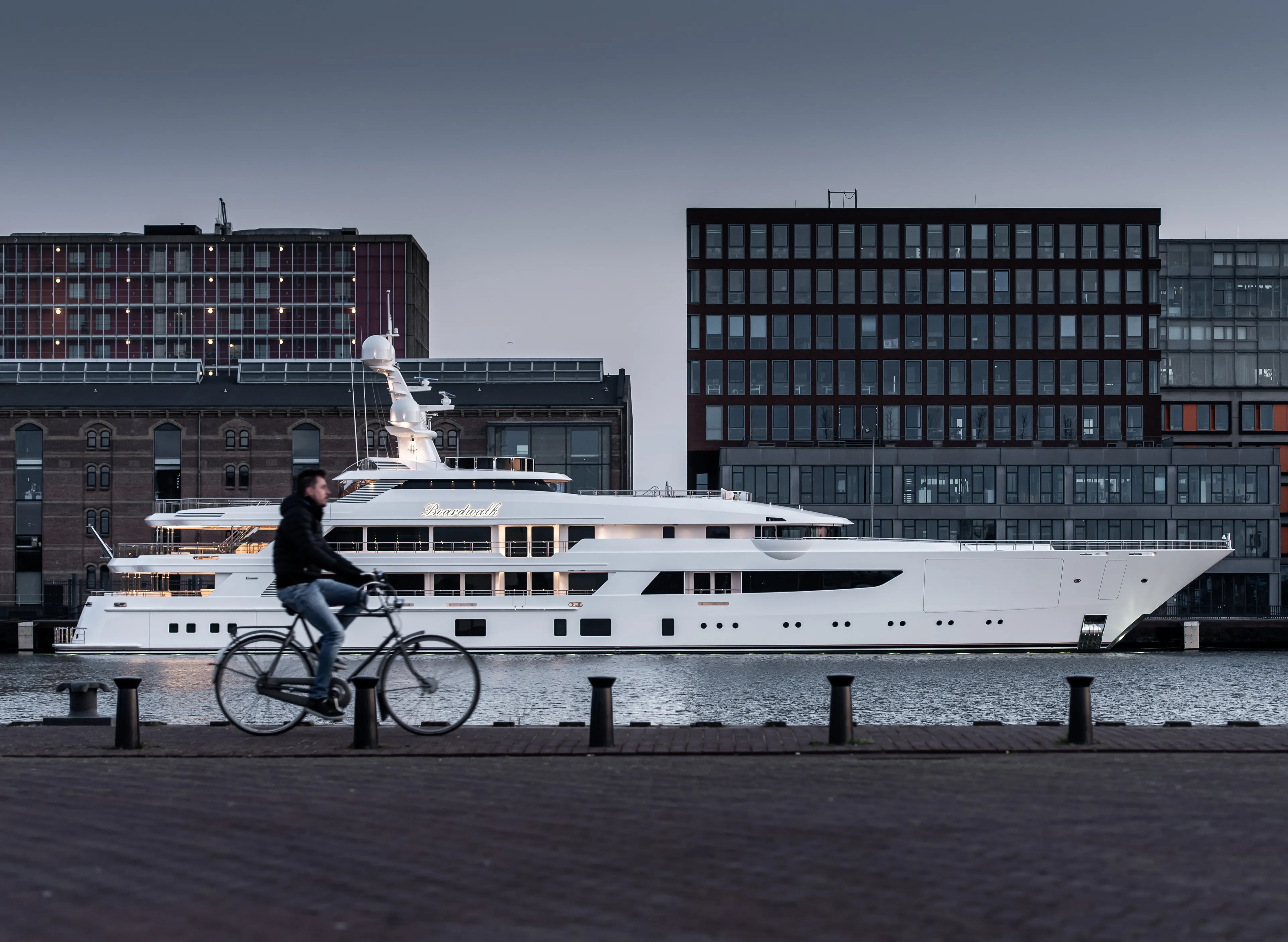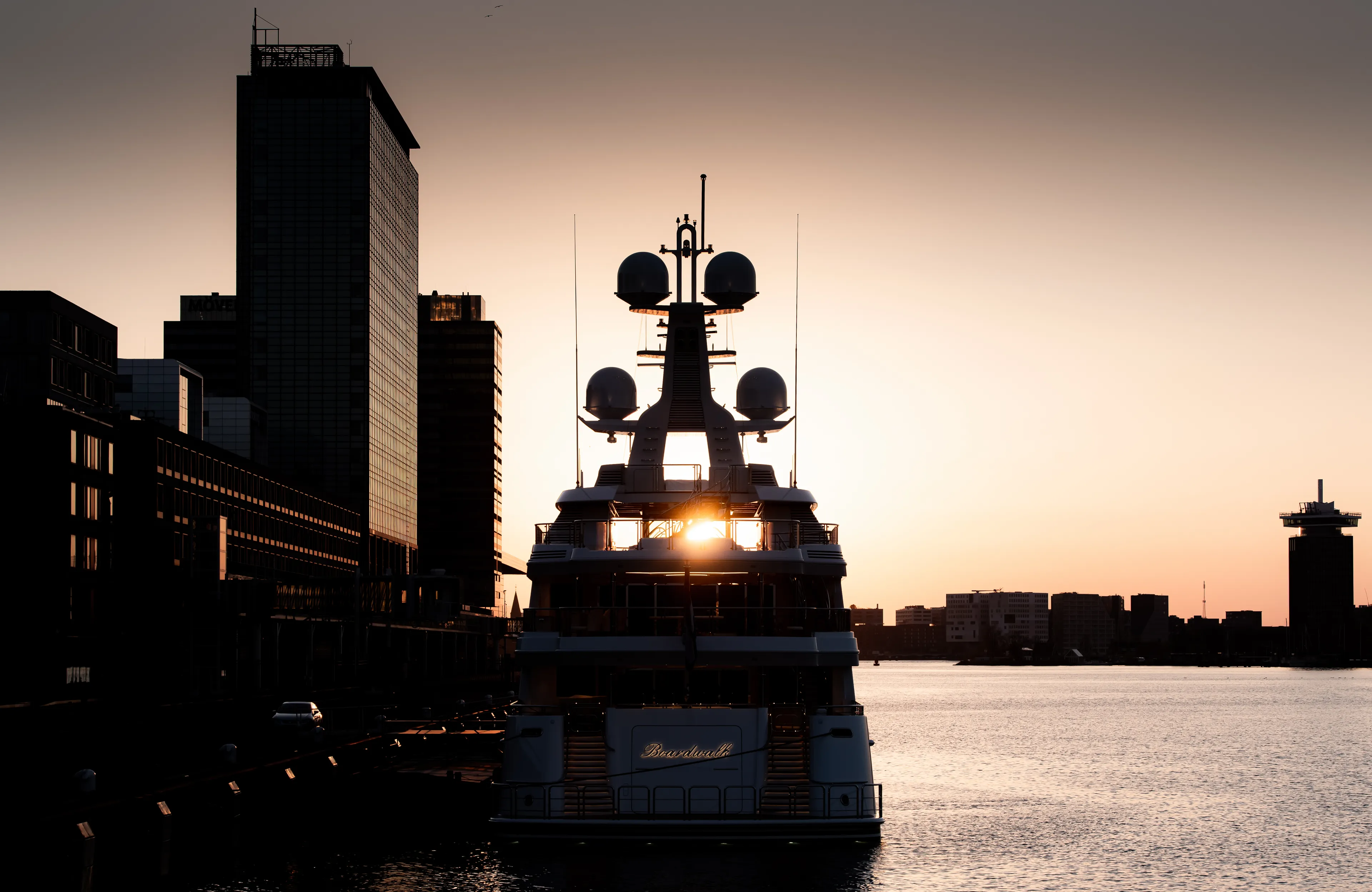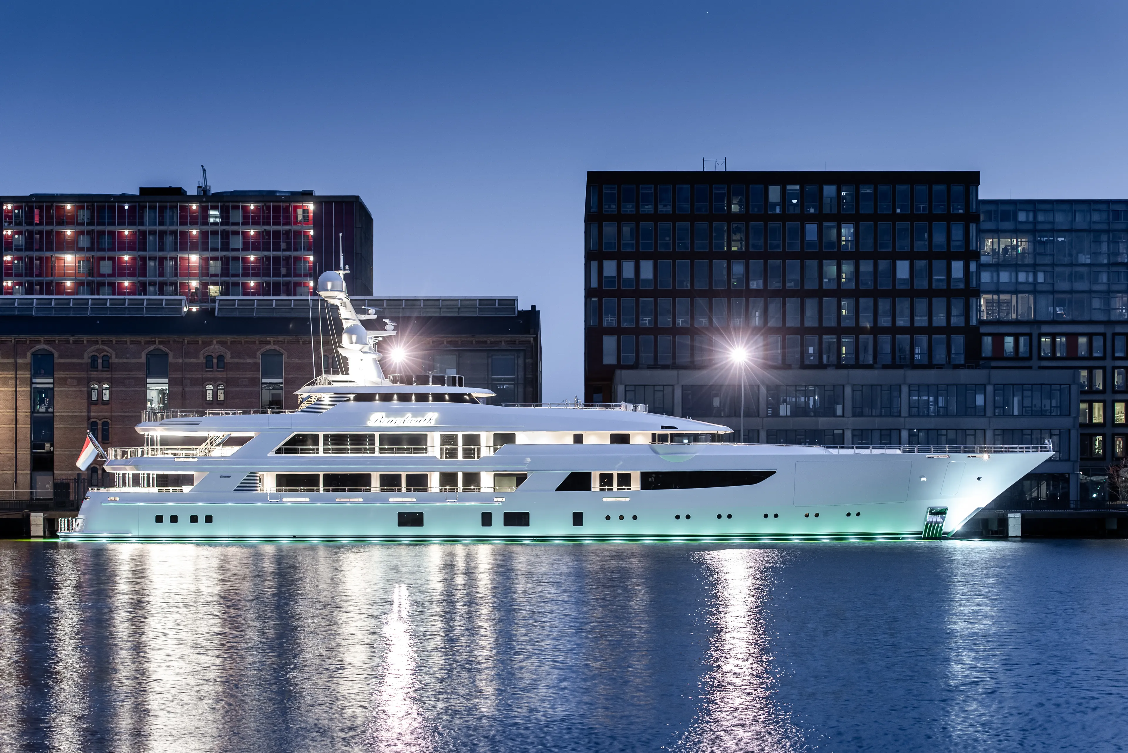 Boardwalk’s exterior by Studio de Voogt was designed with extensive input from the owner’s team – from the general arrangement, exterior design and exterior furniture to producing multiple options to meet the desired aesthetic and technical requirements. Despite her substantial volume and 12.50-metre beam, the 77.00-metre yacht looks lean and long. The forward section of the main deck is taken by a garage that holds two 8.50-metre tenders. Her hull shape was fully optimised using Computational Fluid Dynamics (CFD) calculations with various hull shape iterations.