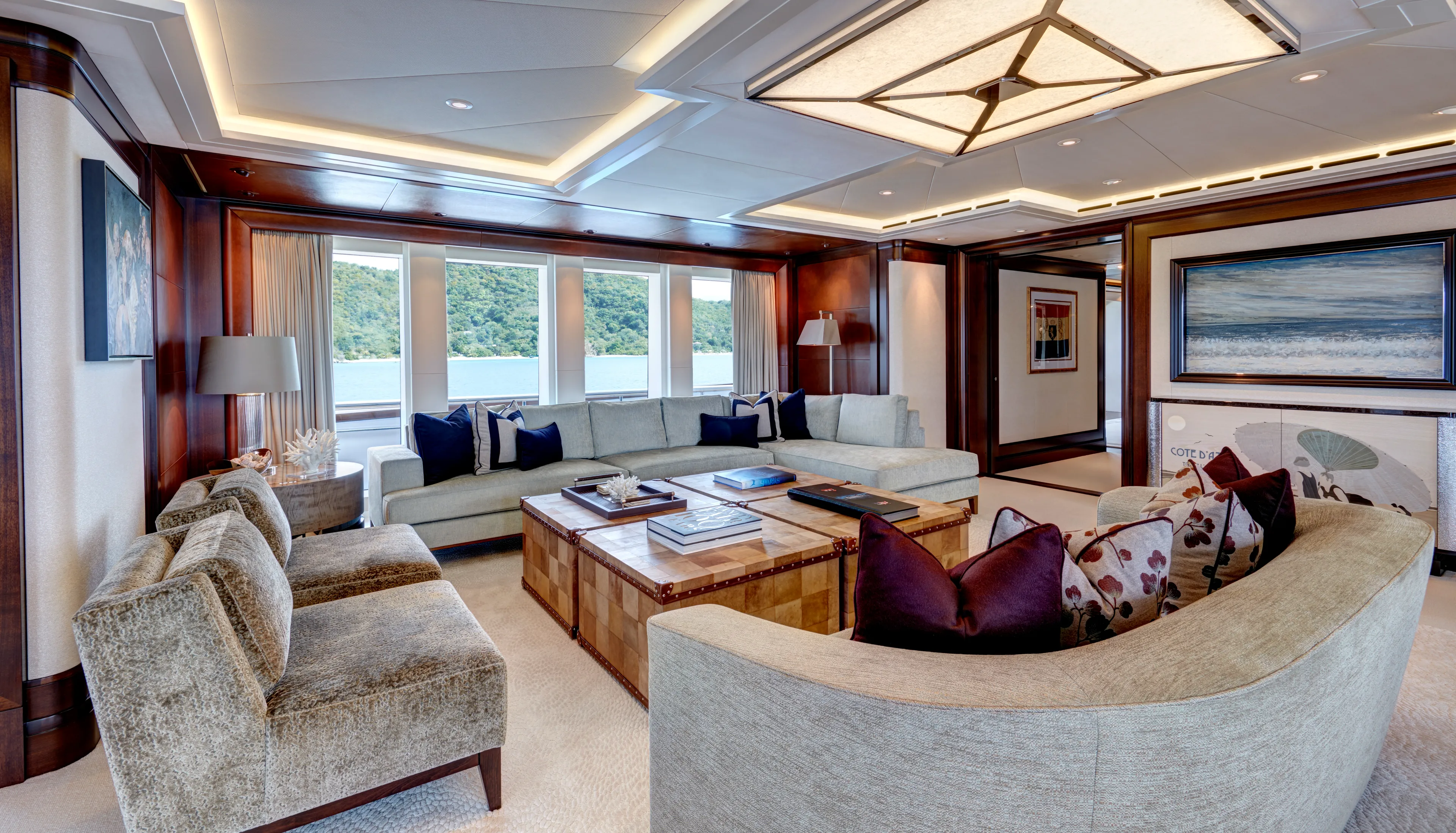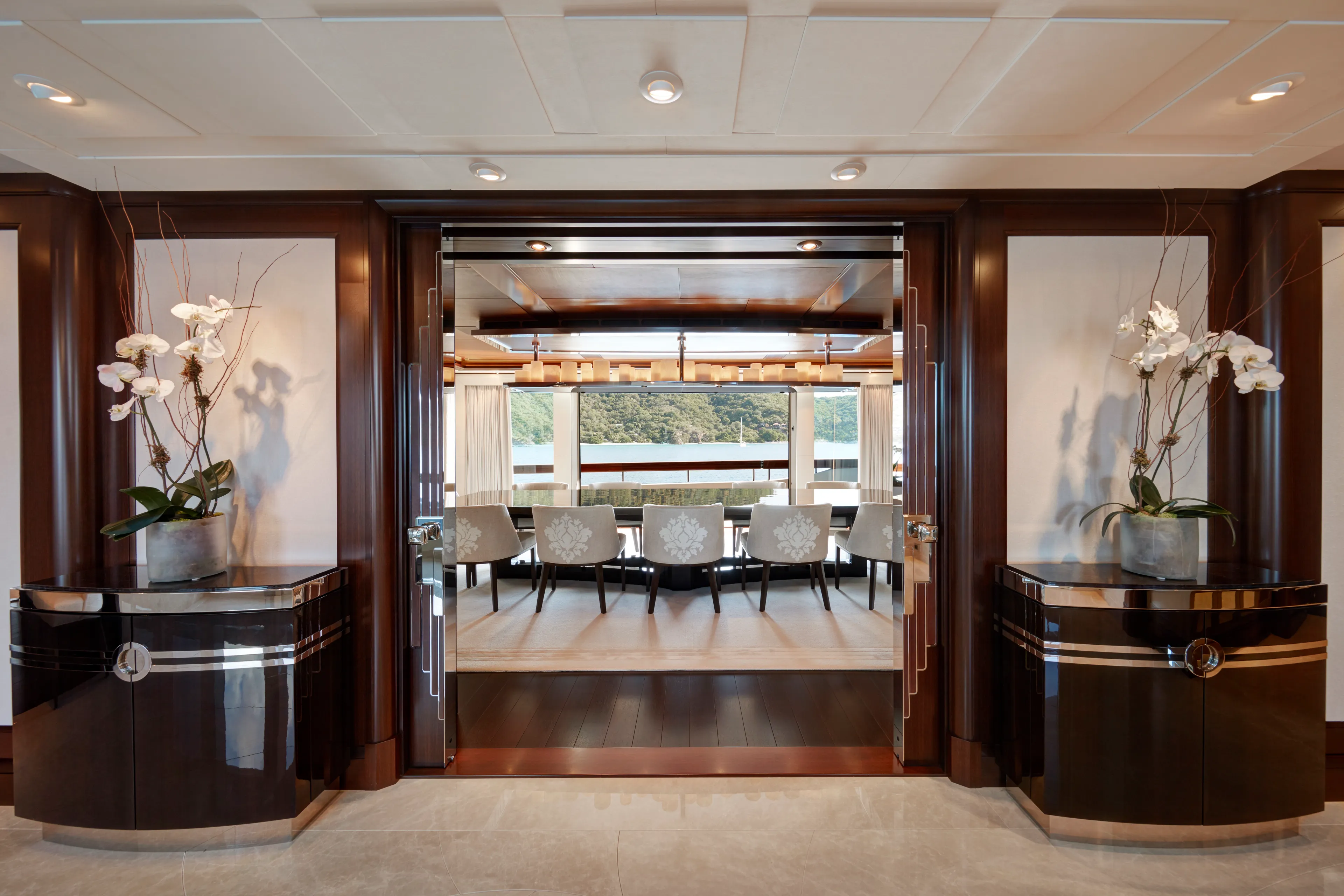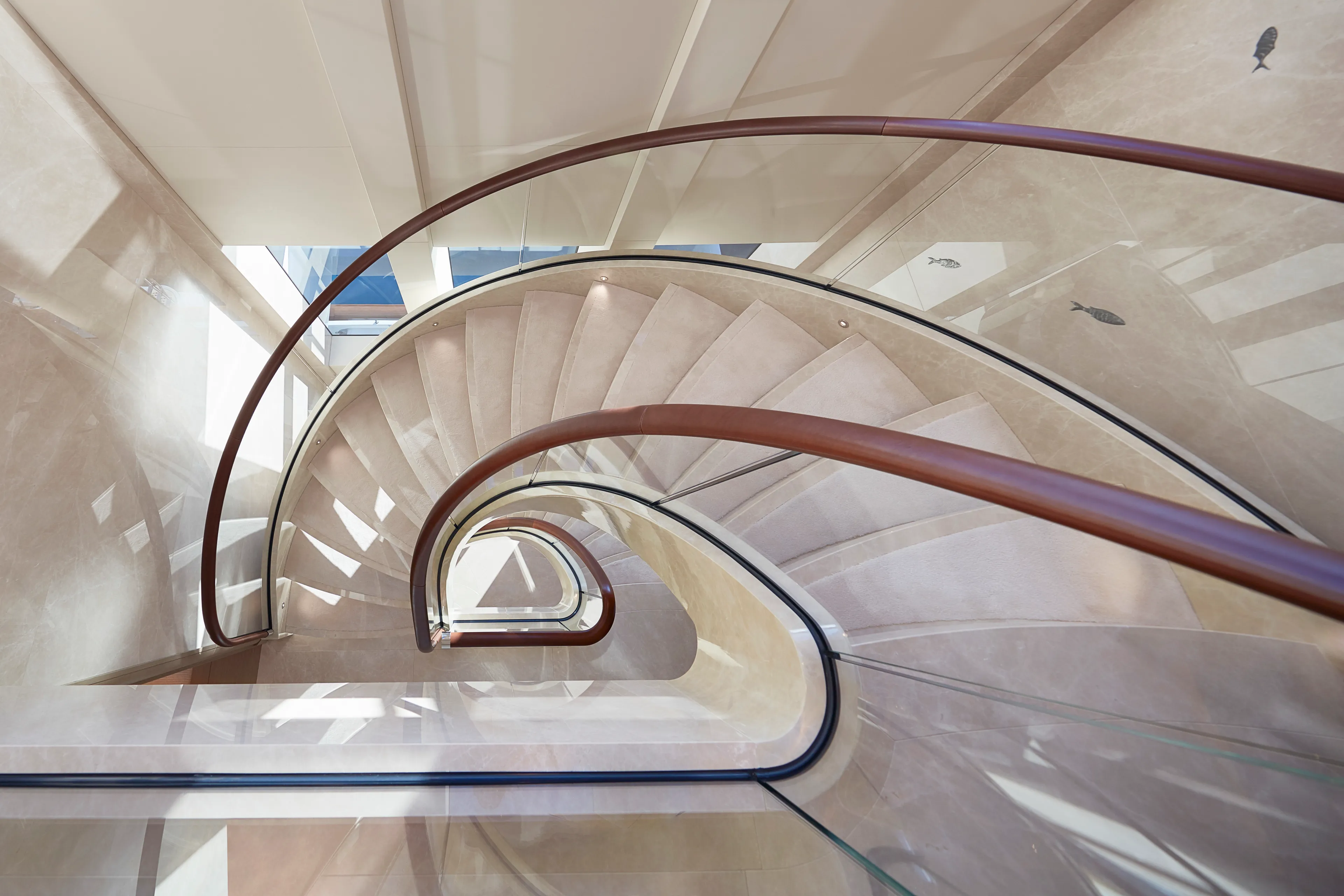 The exterior styling of Vanish includes signature extra-thick teak cap rails that follow the contours of the bulwarks and look amazing both close-up and from afar. These spectacular oversized handrails have never been placed on a Feadship before yet seamlessly became an integral part of the design of Vanish. Other striking features are the free-standing staircase flanked by a glass wall over three decks, an ingenious extendable balcony for the owner’s stateroom and a highly innovative transom design. There are helipads on her top deck aft and bow for access by owners and guests in even the most remote locations.