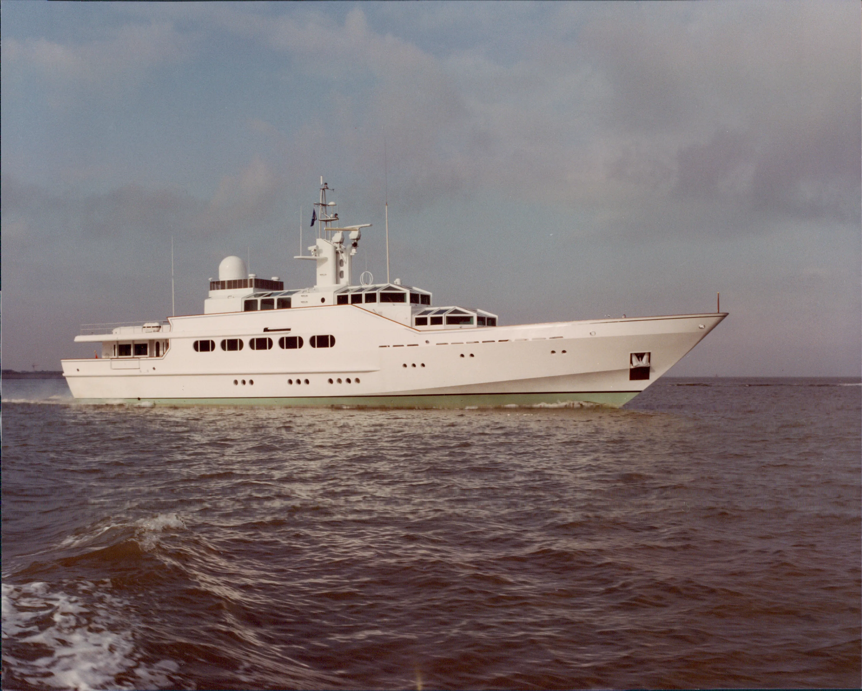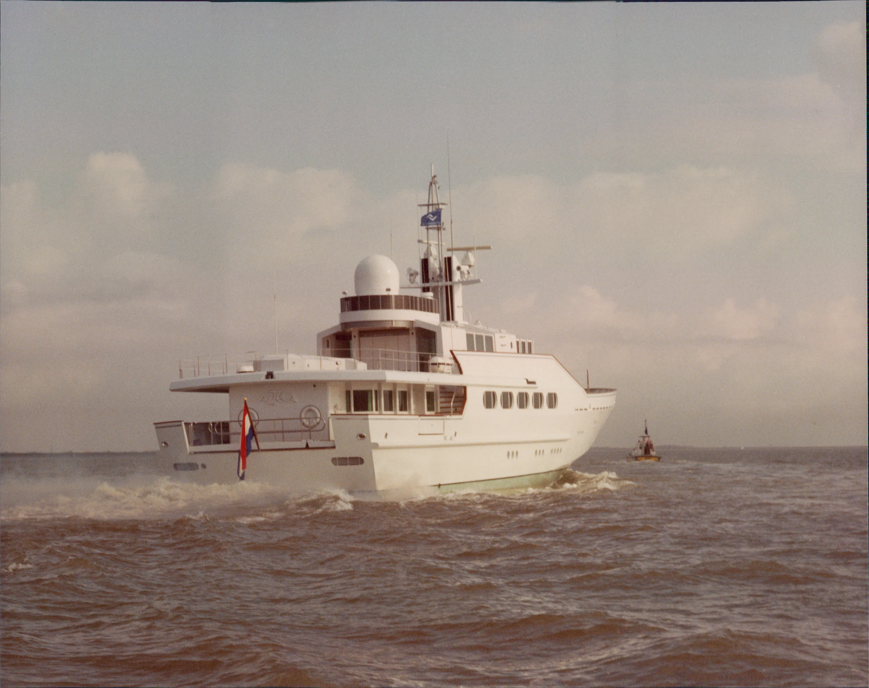A key growth factor for Feadship was its ability to partner with independent exterior designers like Jon Bannenberg. 44.80-metre Azteca and 46.60-metre Paraiso were built in tandem by the yards in Aalsmeer and Kaag, with the owner’s request for eight more being declined so as not to shut out new clients for five years. Dubbed ‘greenhouse’ yachts because they contained so much glass on their top decks that locals thought they were building giant greenhouses, these futuristic all-aluminium Feadships combined 22 knots of speed with staggering slabs of glass and stepped sheer lines that were years ahead of their time. When media mogul Malcom Forbes saw the sleek, angular Azteca his response was simply, "That’s the most exciting thing I’ve ever seen! I want one like that.”