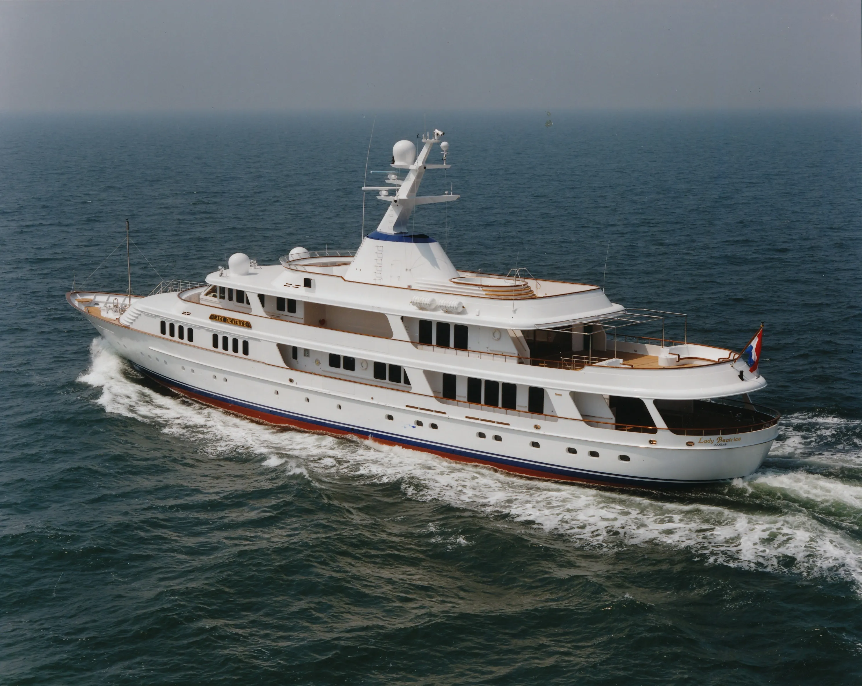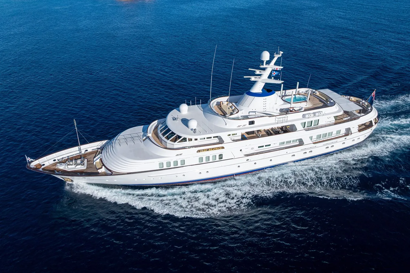 Designed by Studio De Voogt, the 60.00-metre Lady Beatrice is a classic, canoe-sterned yacht that can accommodate up to sixteen guests. Renowned designer Jon Bannenberg is the brains behind her palatial interiors, which sees a "blend of traditional patterns and opulent textures”. Floor-to-ceiling windows fill the main saloon with natural light, whose drawing room aesthetic is cultivated by a grand piano, ambient lighting and pin-striped sofa seating. Adjoining the main saloon is a formal dining area, seating guests under a Renaissance-style fresco ceiling.