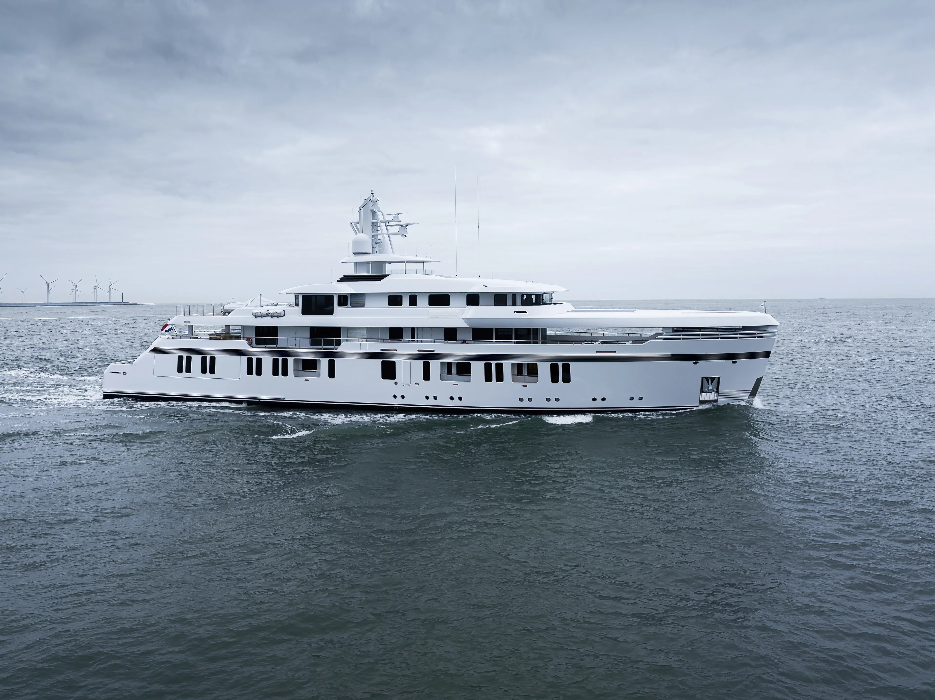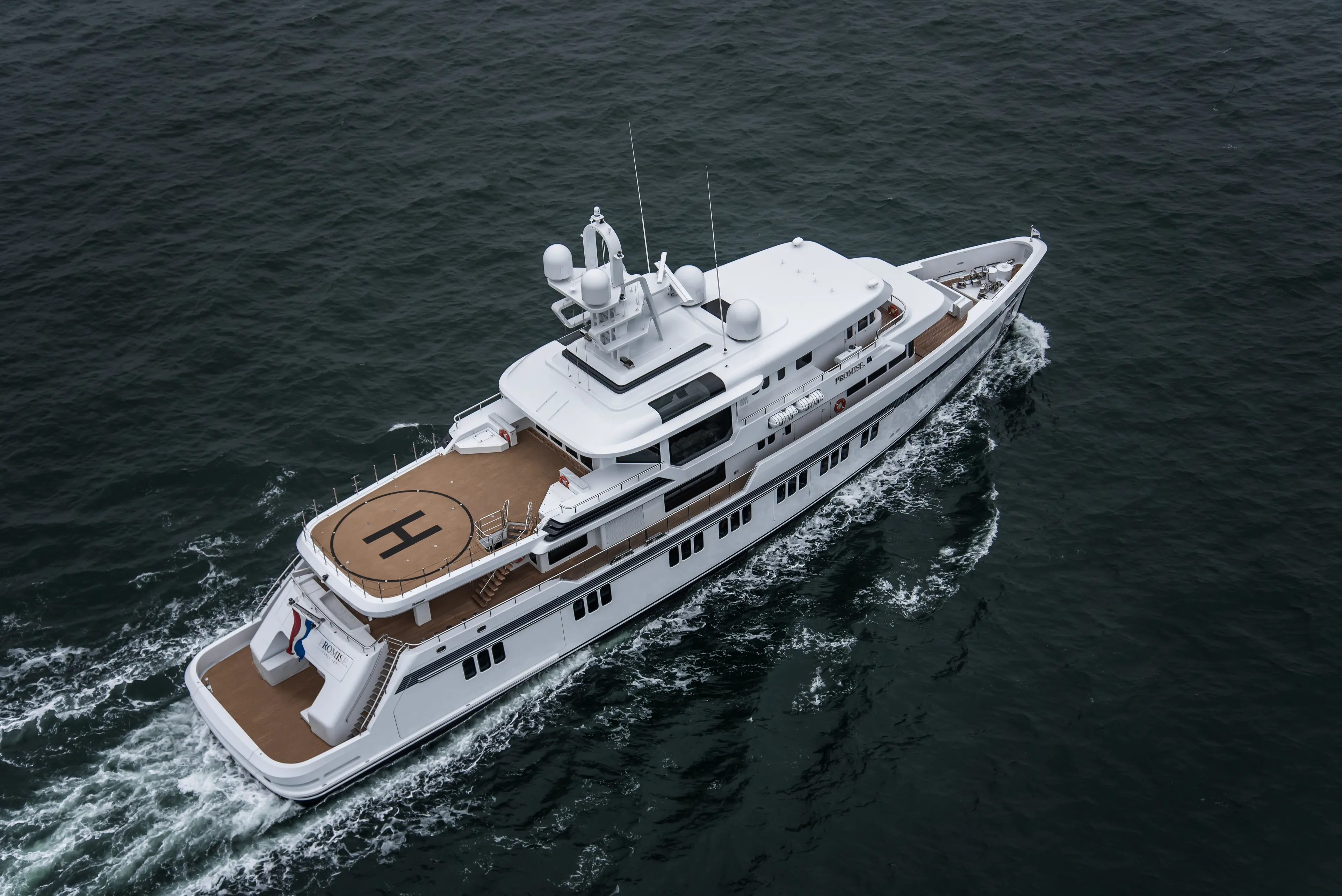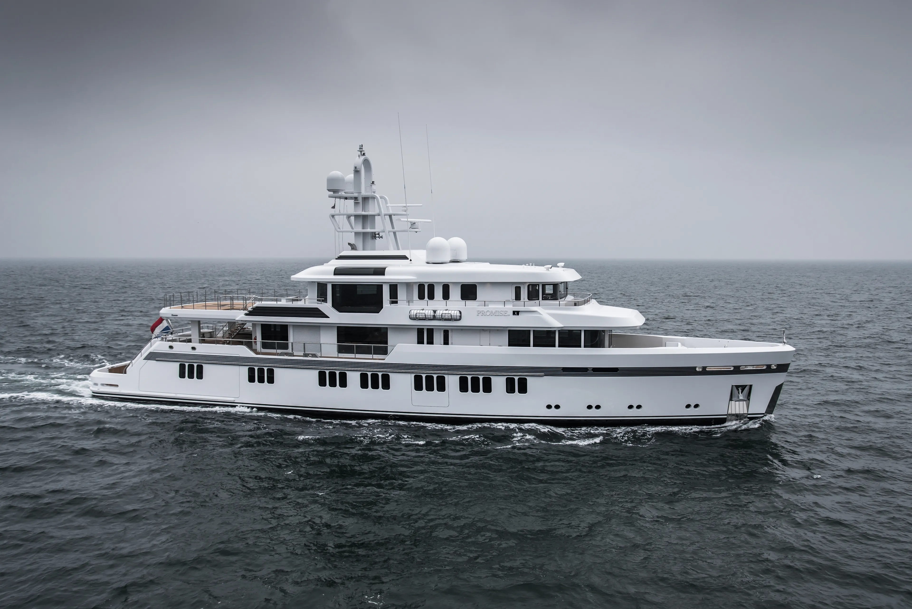 Promise. – the full stop in the name is intentional – was the first Feadship built to ice-class notation. The exterior of this truly unique 51.00-metre custom explorer comes from the boards of Feadship’s in-house designers at Studio De Voogt with the interior created together with Bannenberg & Rowell Design. Twin Caterpillar C32 engines give a top speed of 14.5 knots while the yacht has a range of 4,500 nautical miles and luxury accommodations for twelve people.